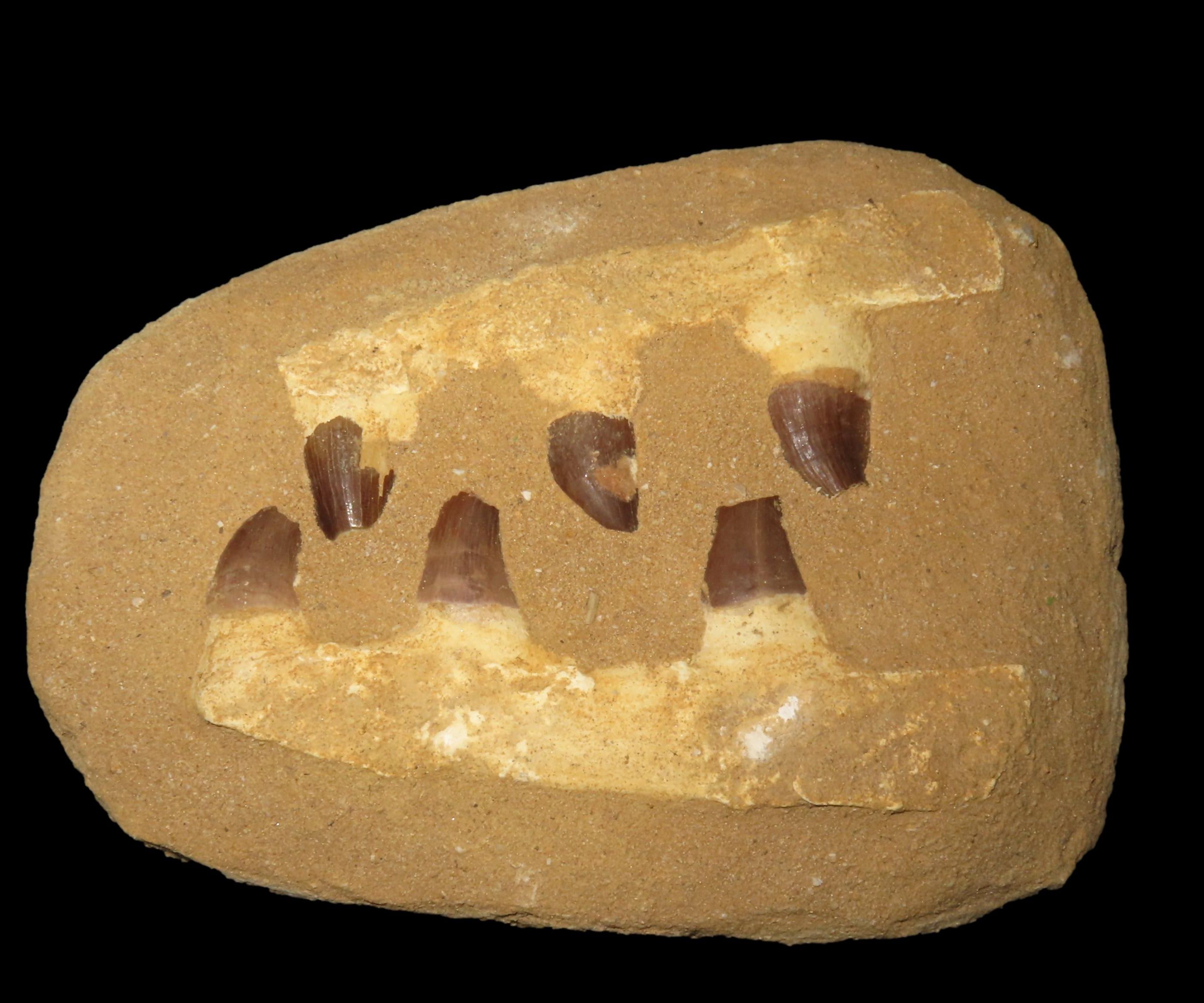 GREAT DINOSAUR FOSSIL JAW BONE / TOOTH IN MATRIX FROM MOROCCO, PALEOCENE TO MIOCENE AGE, 66 MILLION TO 5 MILLION YEARS OLD, TEETH