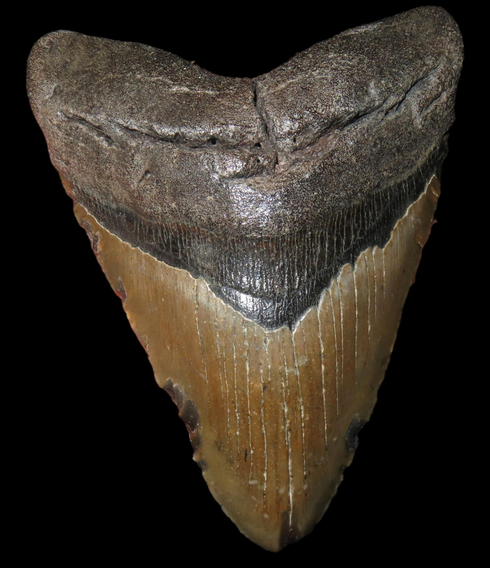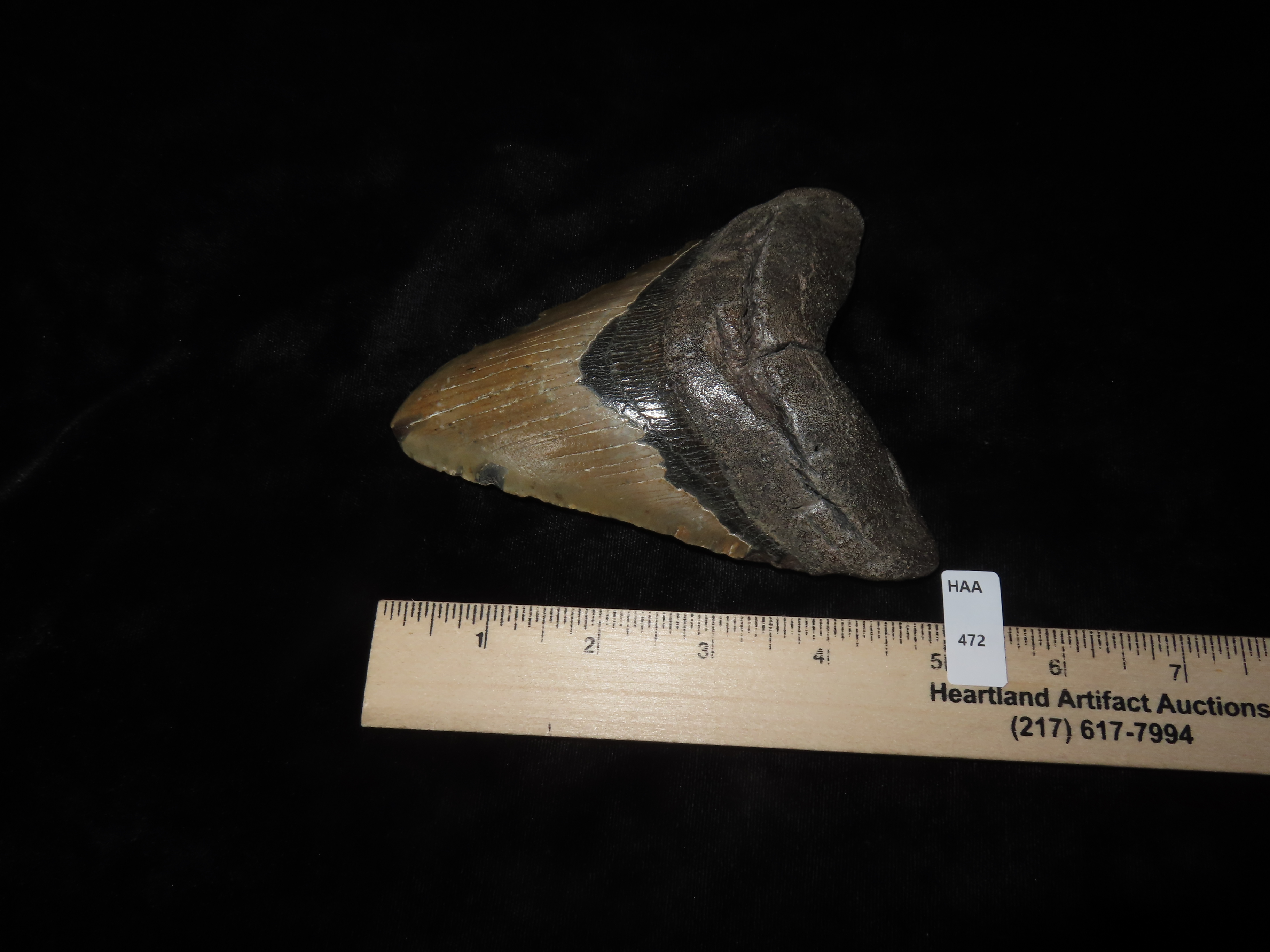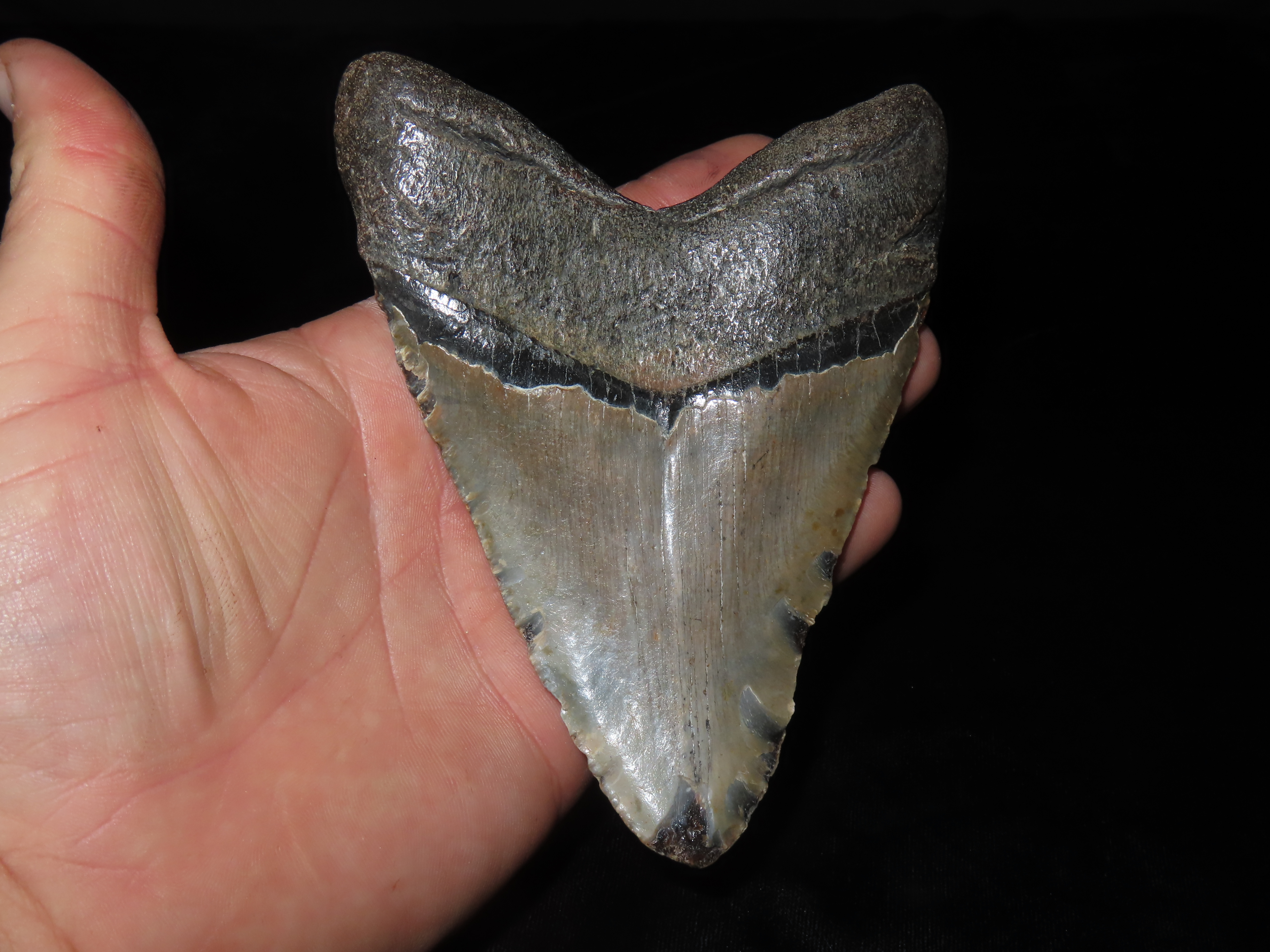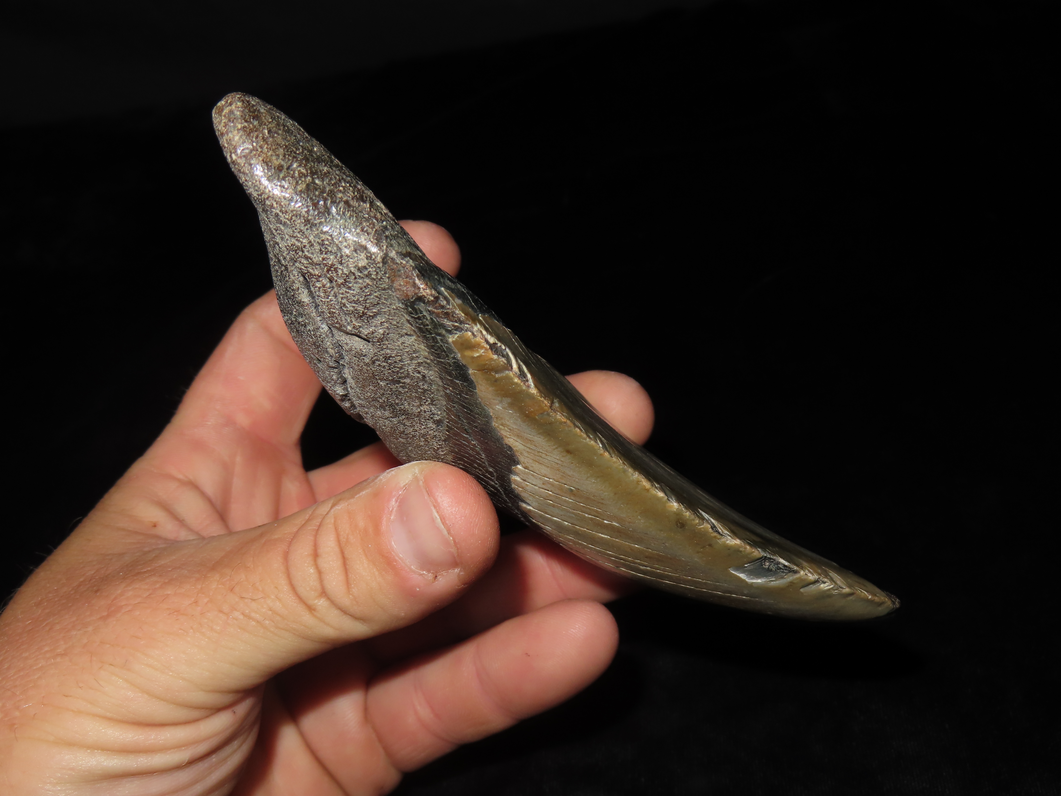 HUGE 5 1/4″ MEGALODON SHARK TOOTH, 23-2.5 MILLION YEAR OLD FOSSIL FOUND OFF THE COAST OF THE CAROLINA’S, NO REPAIR, NO RESTO, NO POLISH
