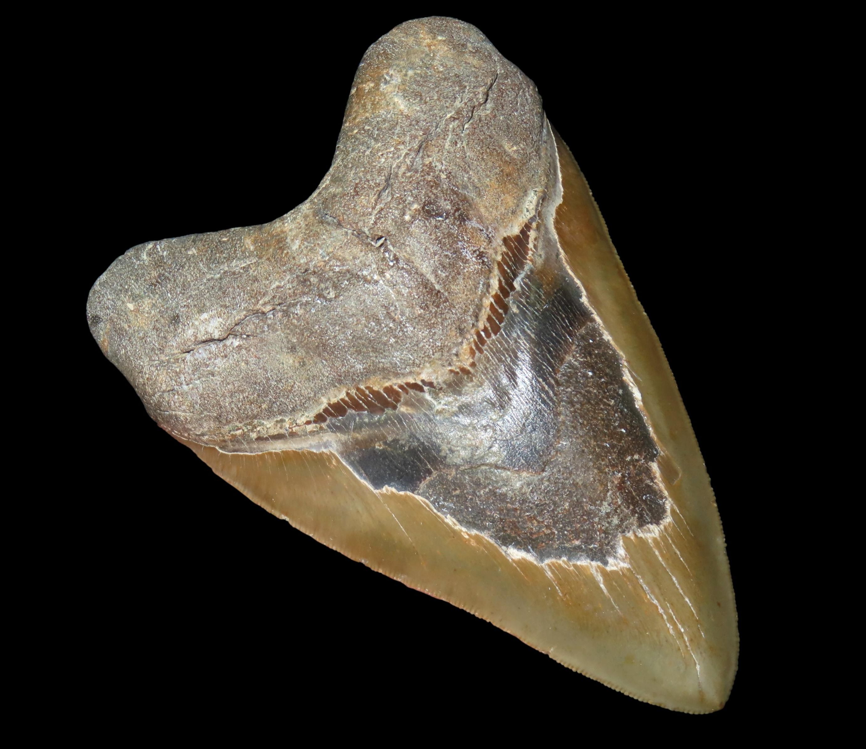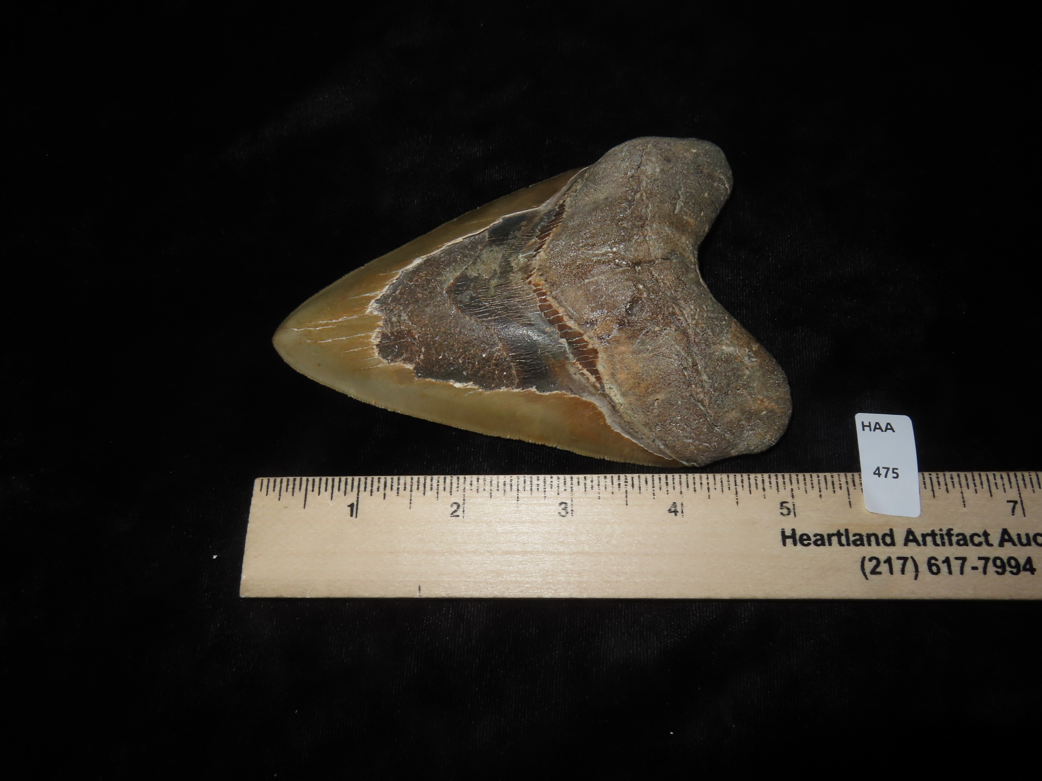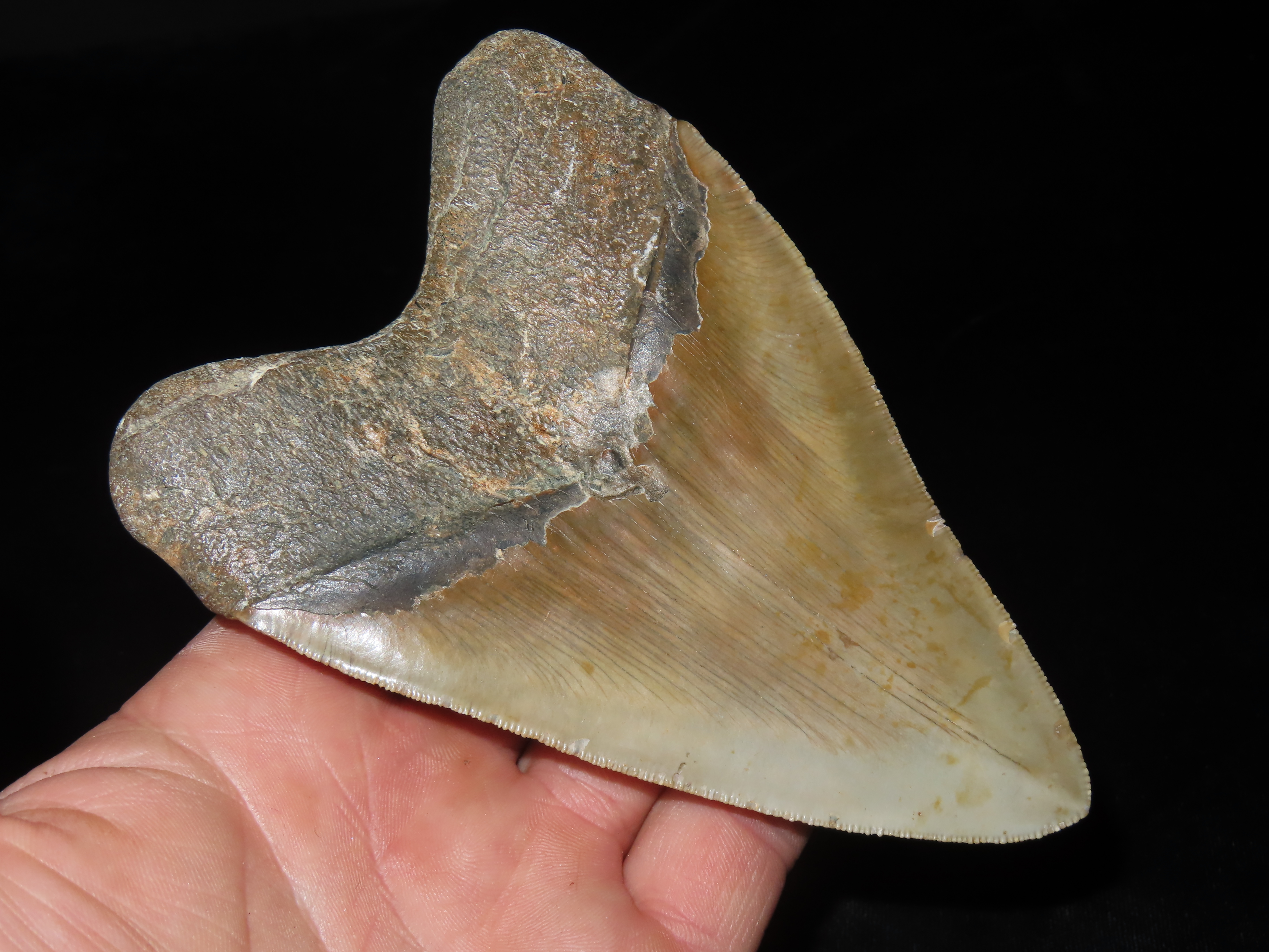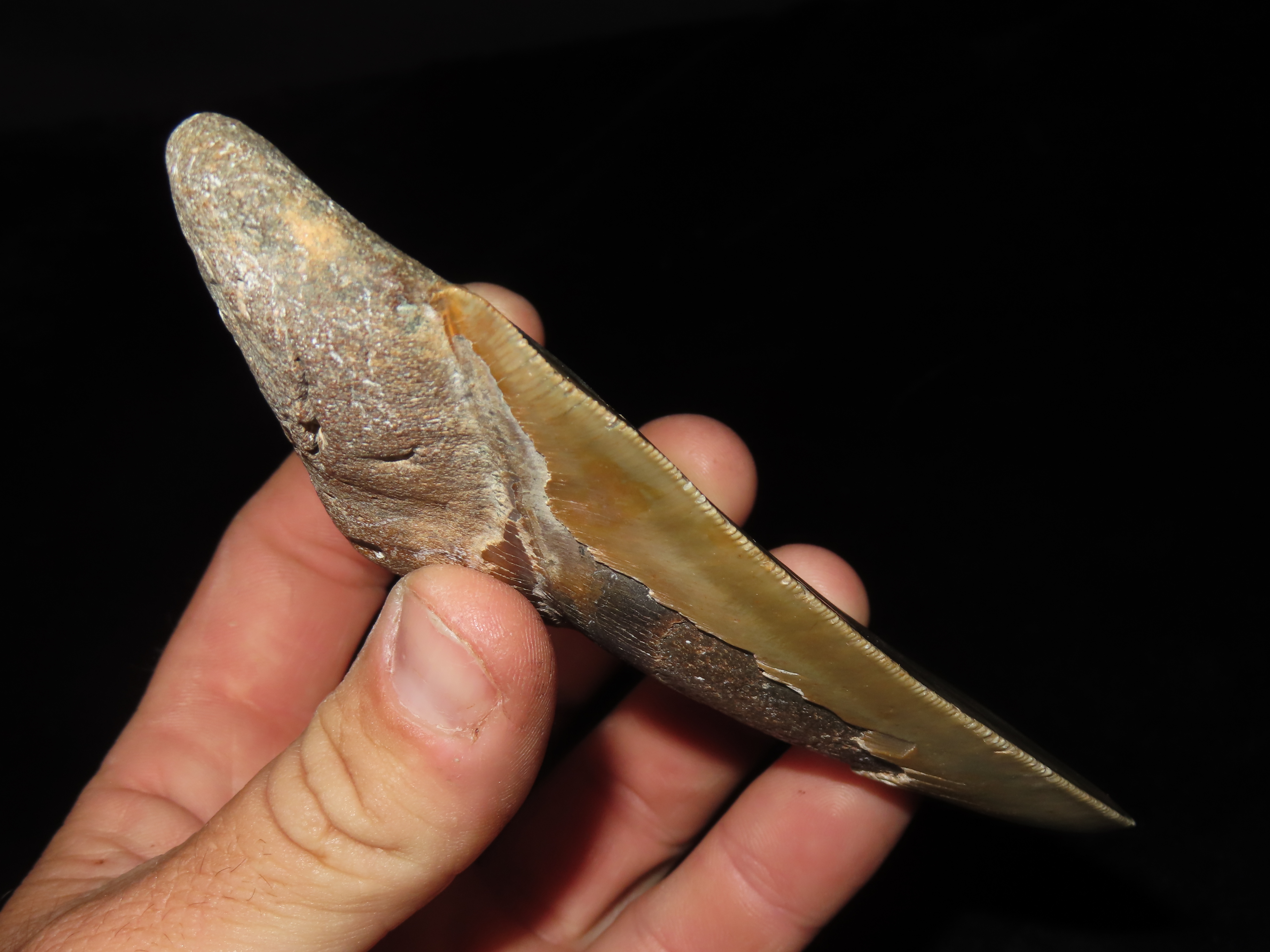 HUGE 5 1/4″ MEGALODON SHARK TOOTH, 23-2.5 MILLION YEAR OLD FOSSIL FOUND OFF THE COAST OF THE CAROLINA’S, NO REPAIR, NO RESTO, NO POLISH