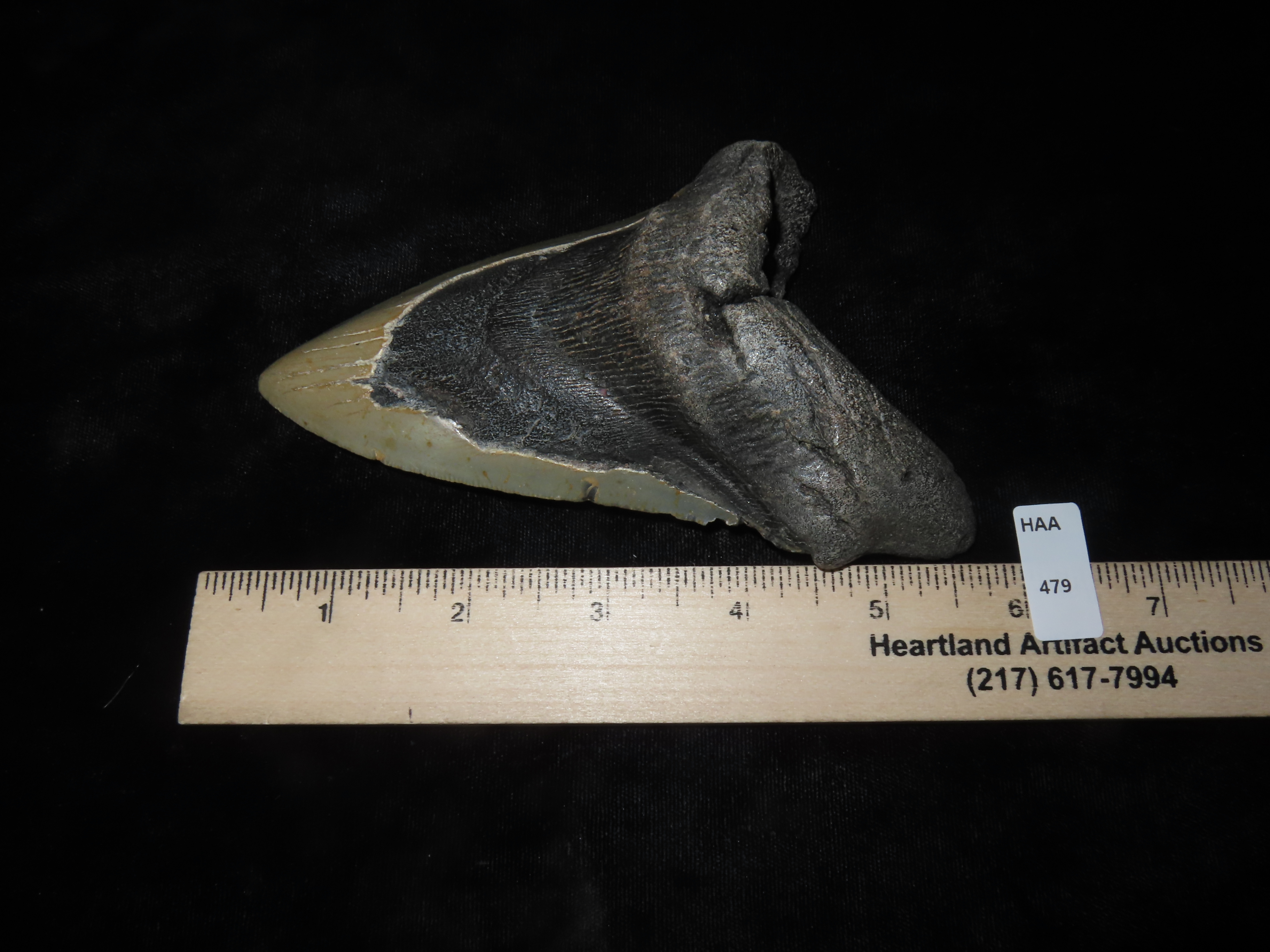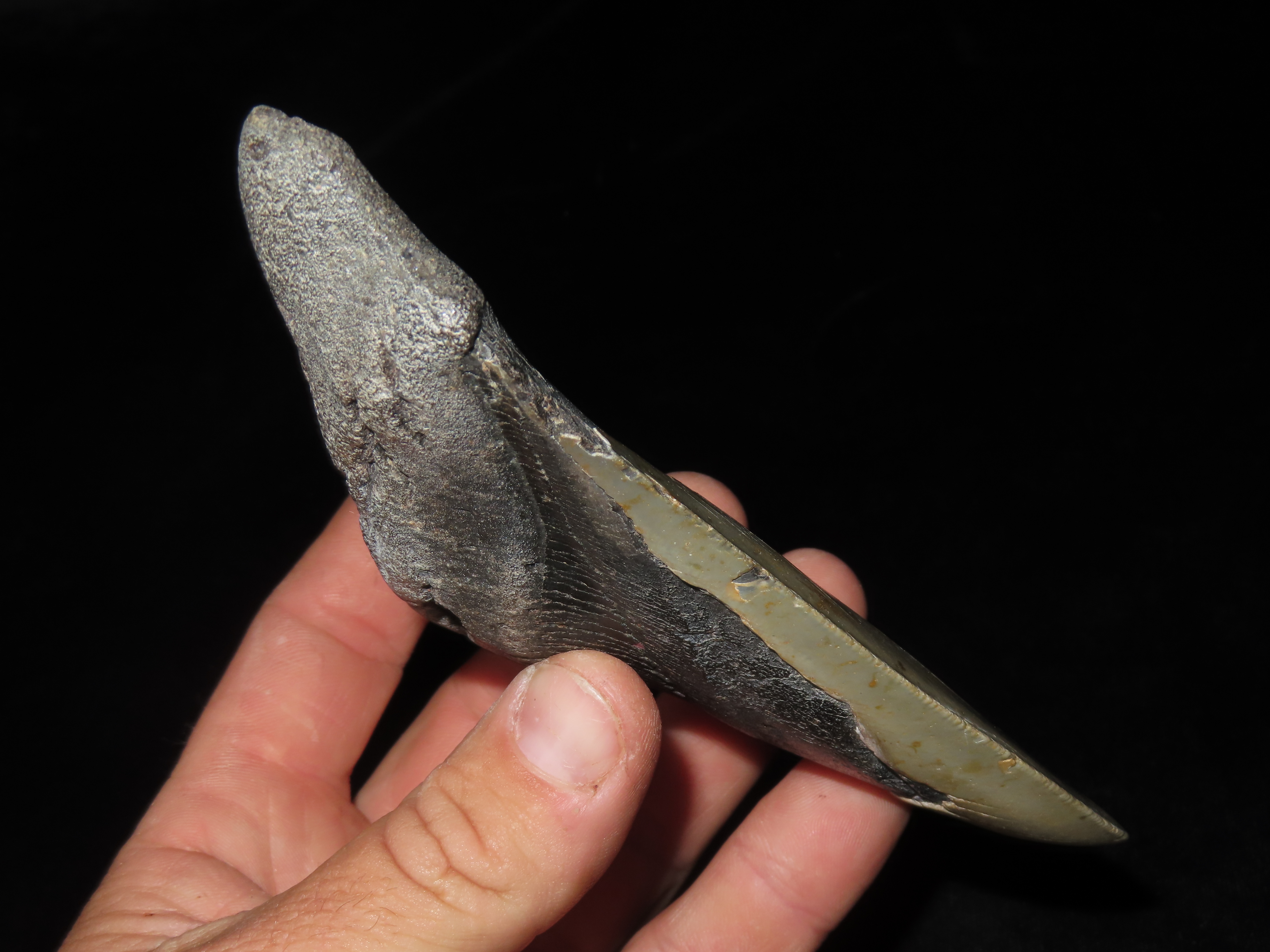 MASSIVE 5 5/8″ MEGALODON SHARK TOOTH, 23-2.5 MILLION YEAR OLD FOSSIL FOUND OFF THE COAST OF THE CAROLINA’S, NO REPAIR, NO RESTO, NO POLISH