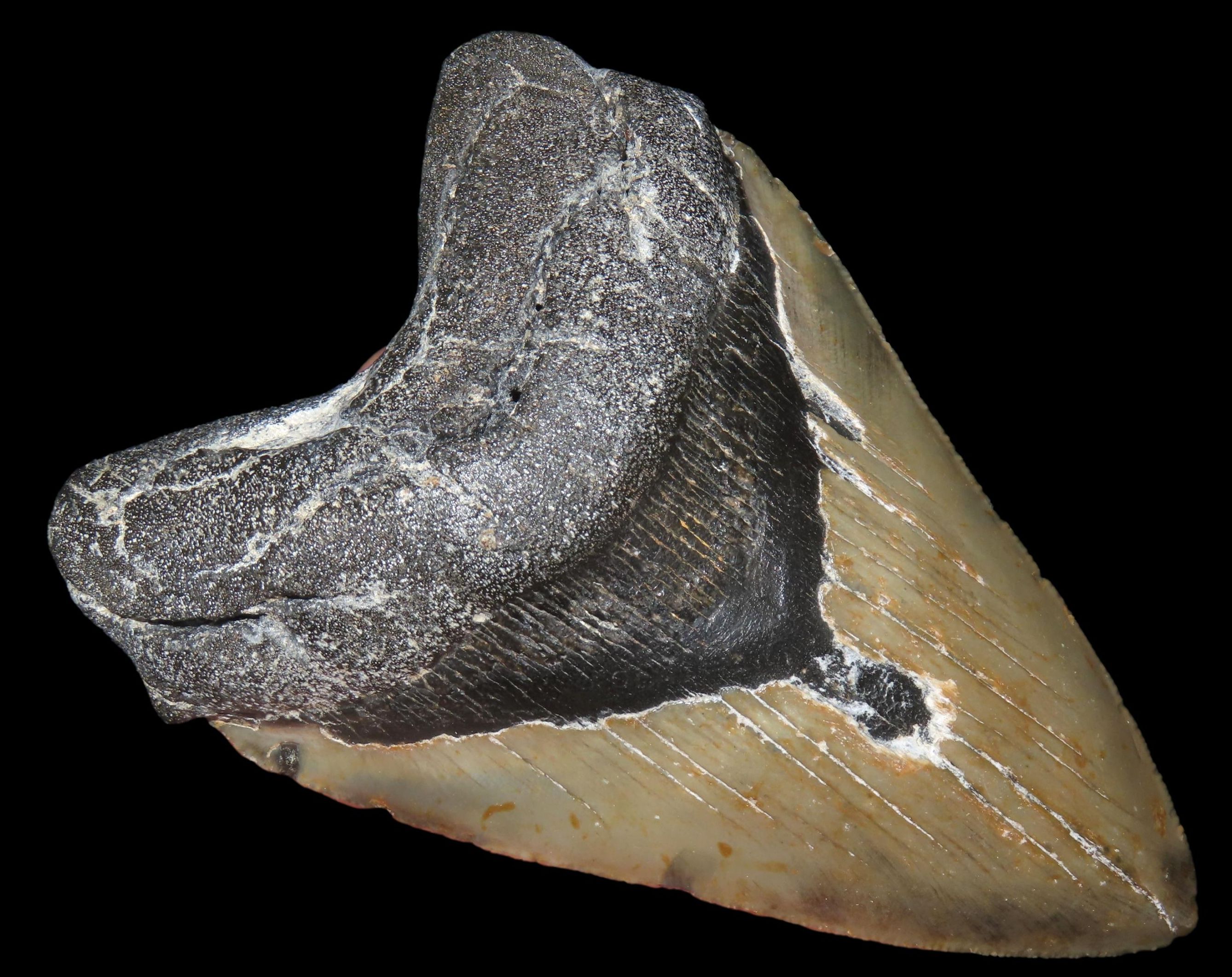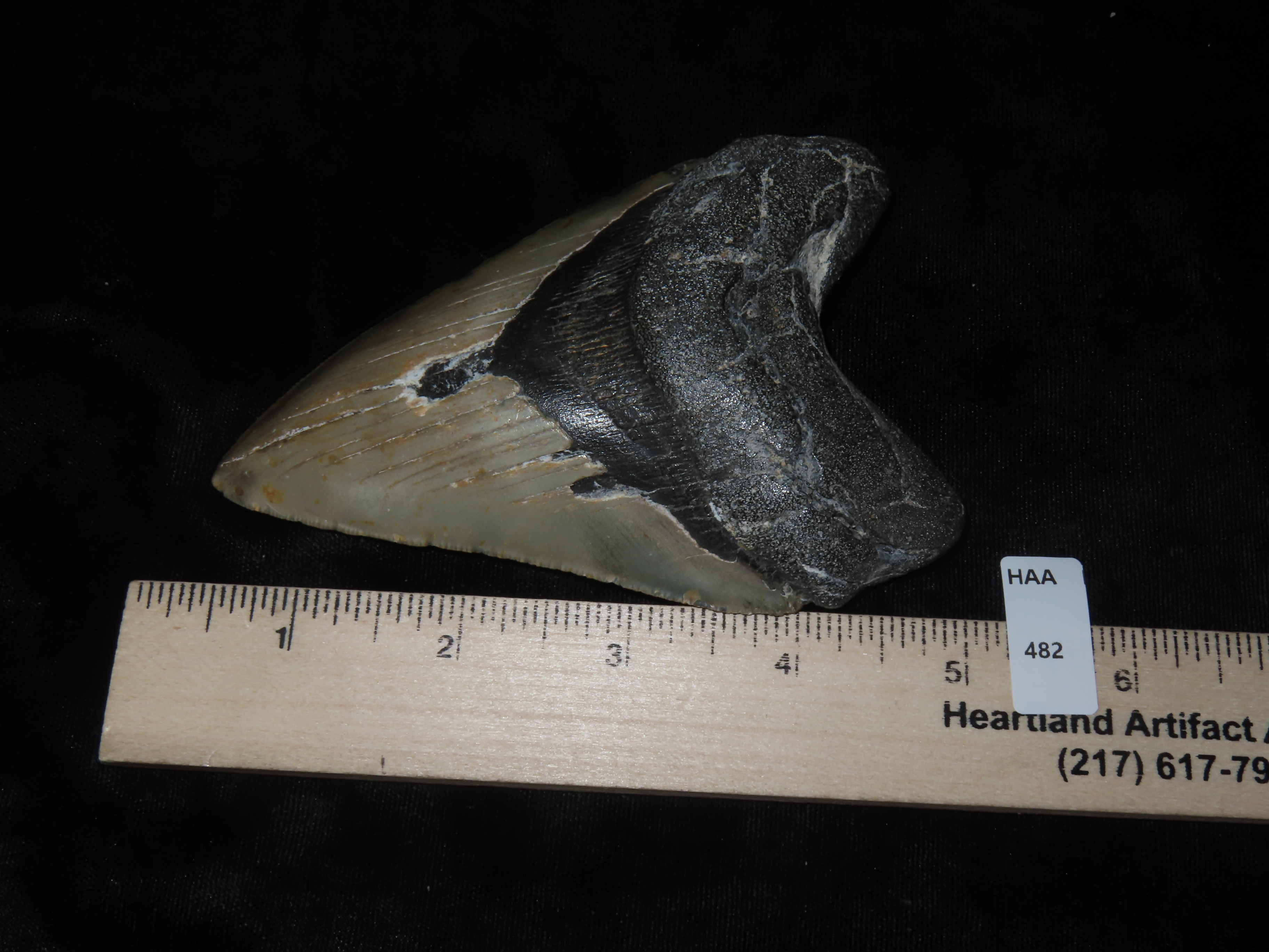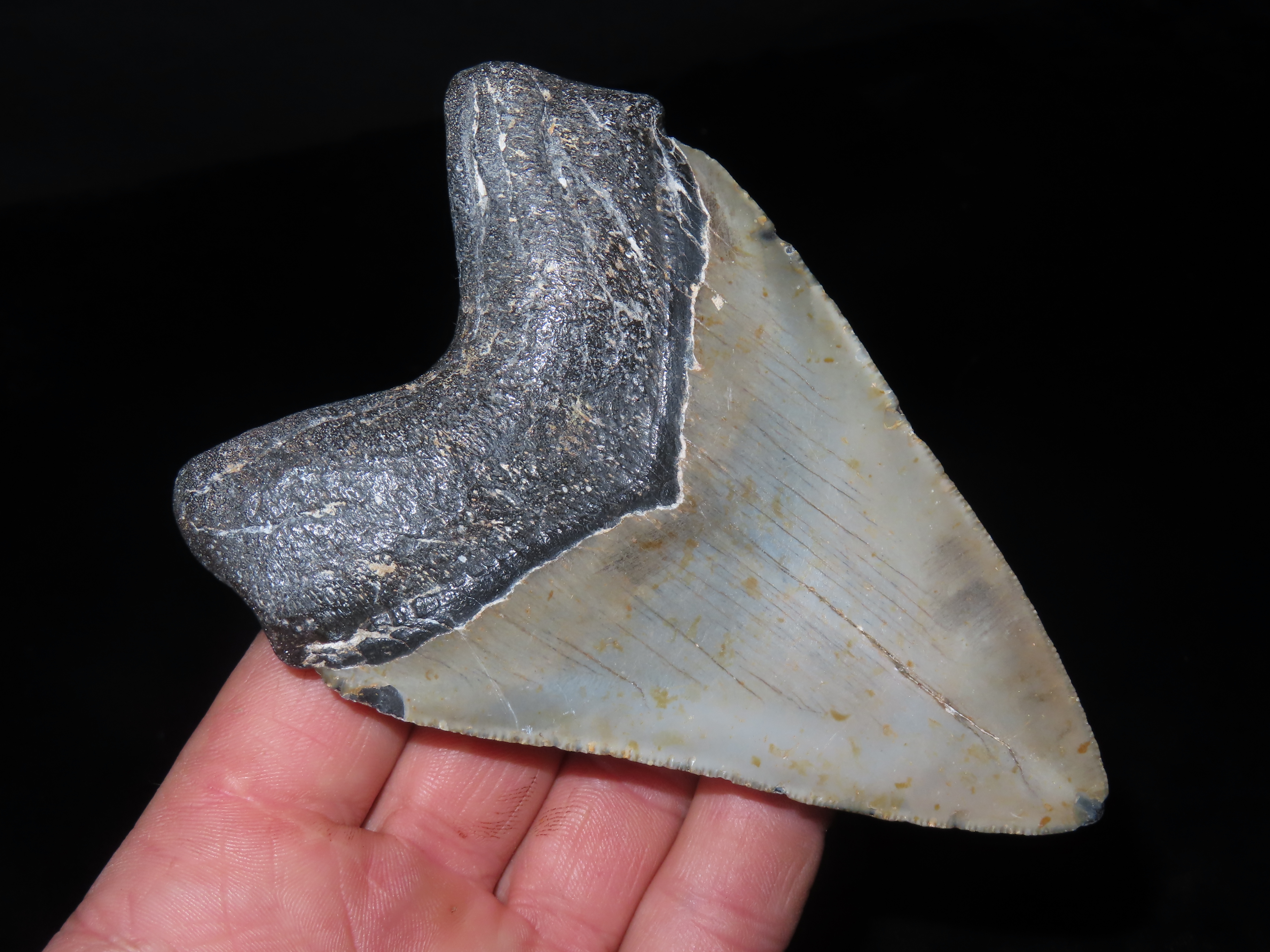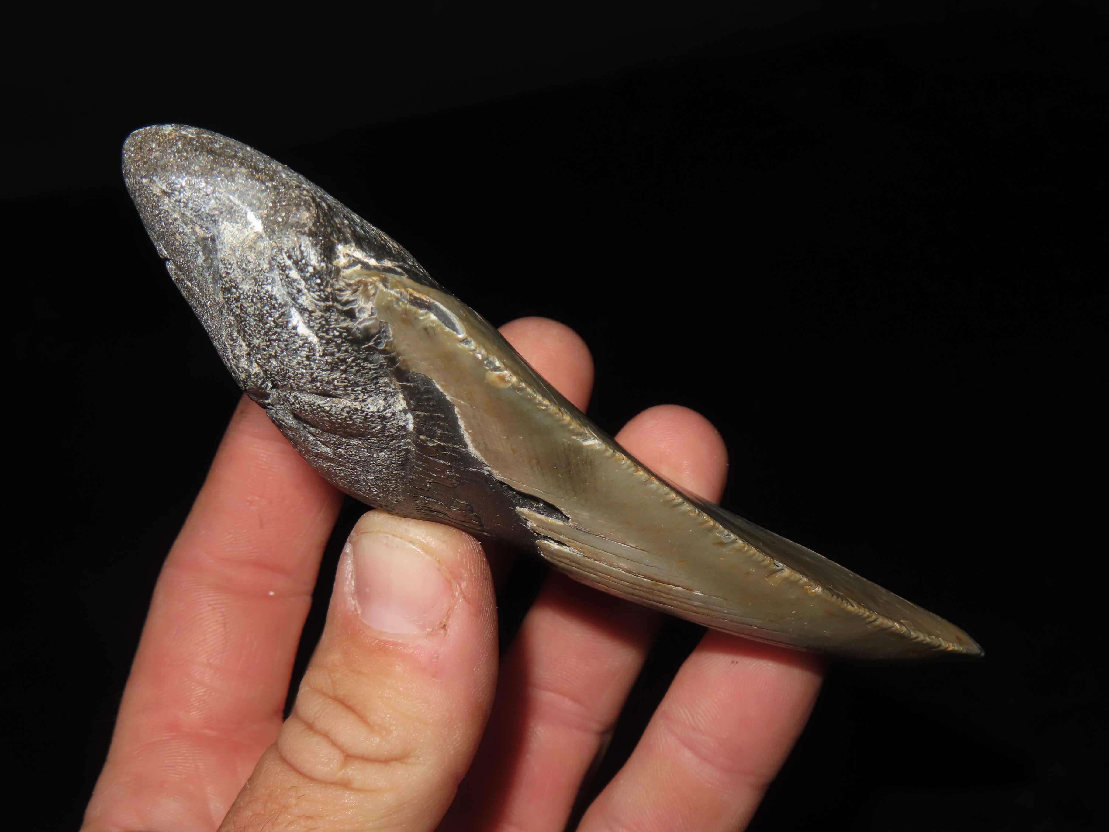 HUGE 4 3/4″ MEGALODON SHARK TOOTH, 23-2.5 MILLION YEAR OLD FOSSIL FOUND OFF THE COAST OF THE CAROLINA’S, NO REPAIR, NO RESTO, NO POLISH