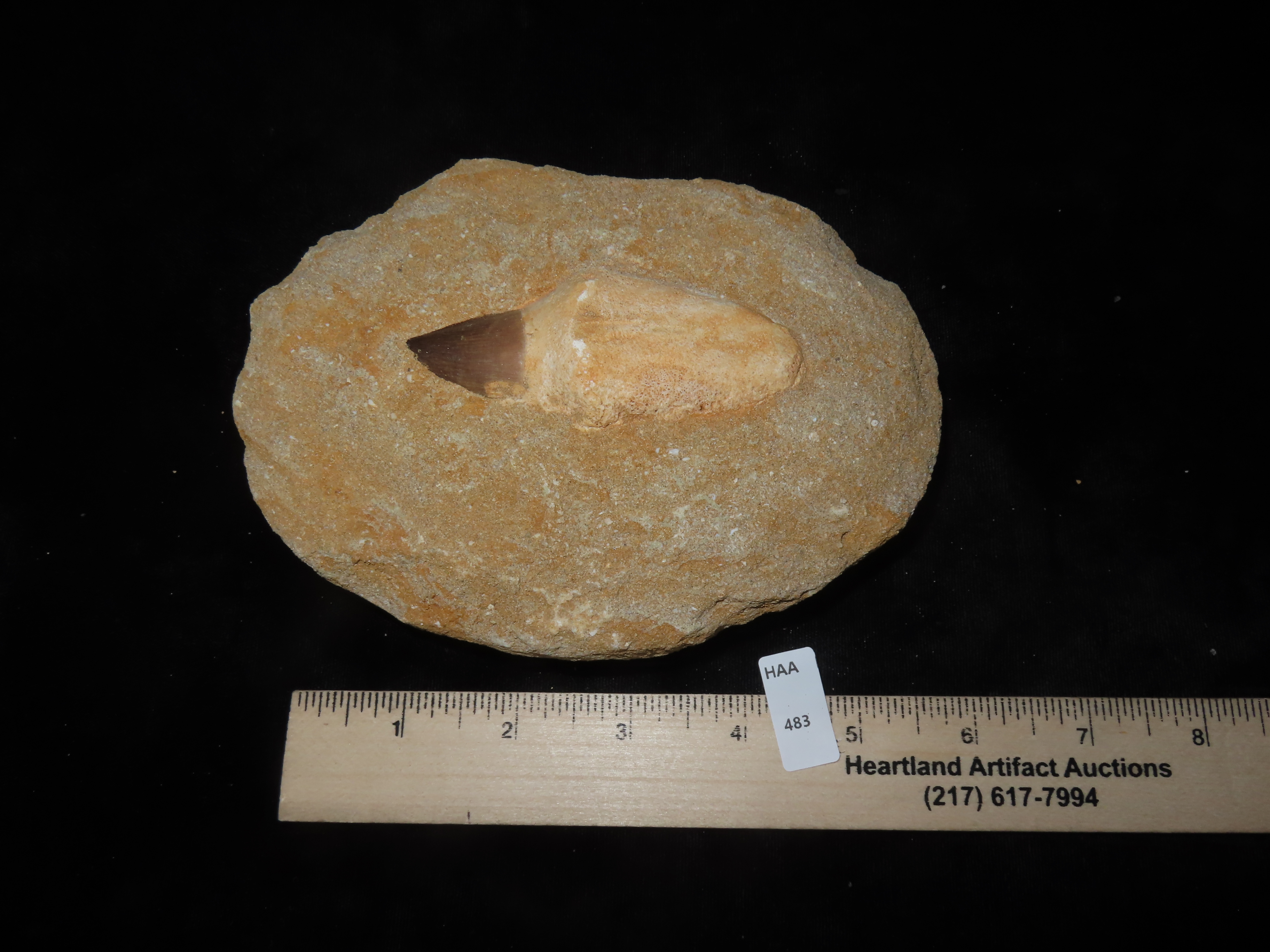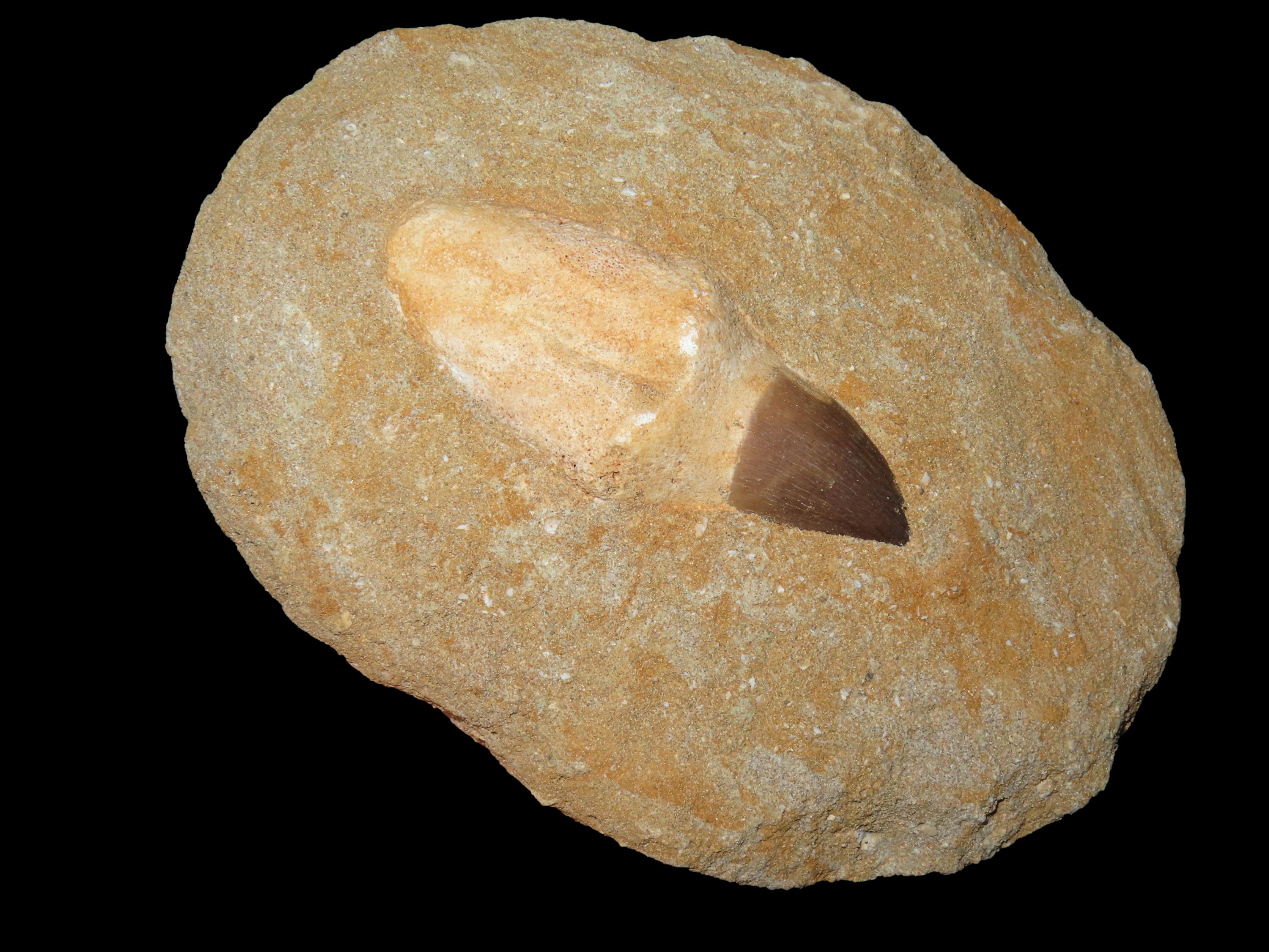 OUTSTANDING HUGE DINOSAUR TOOTH (MOSASAUR) IN MATRIX, MORROCCO, LATE CRETACEOUS AGE ABOUT 70 MILLION YEARS OLD!