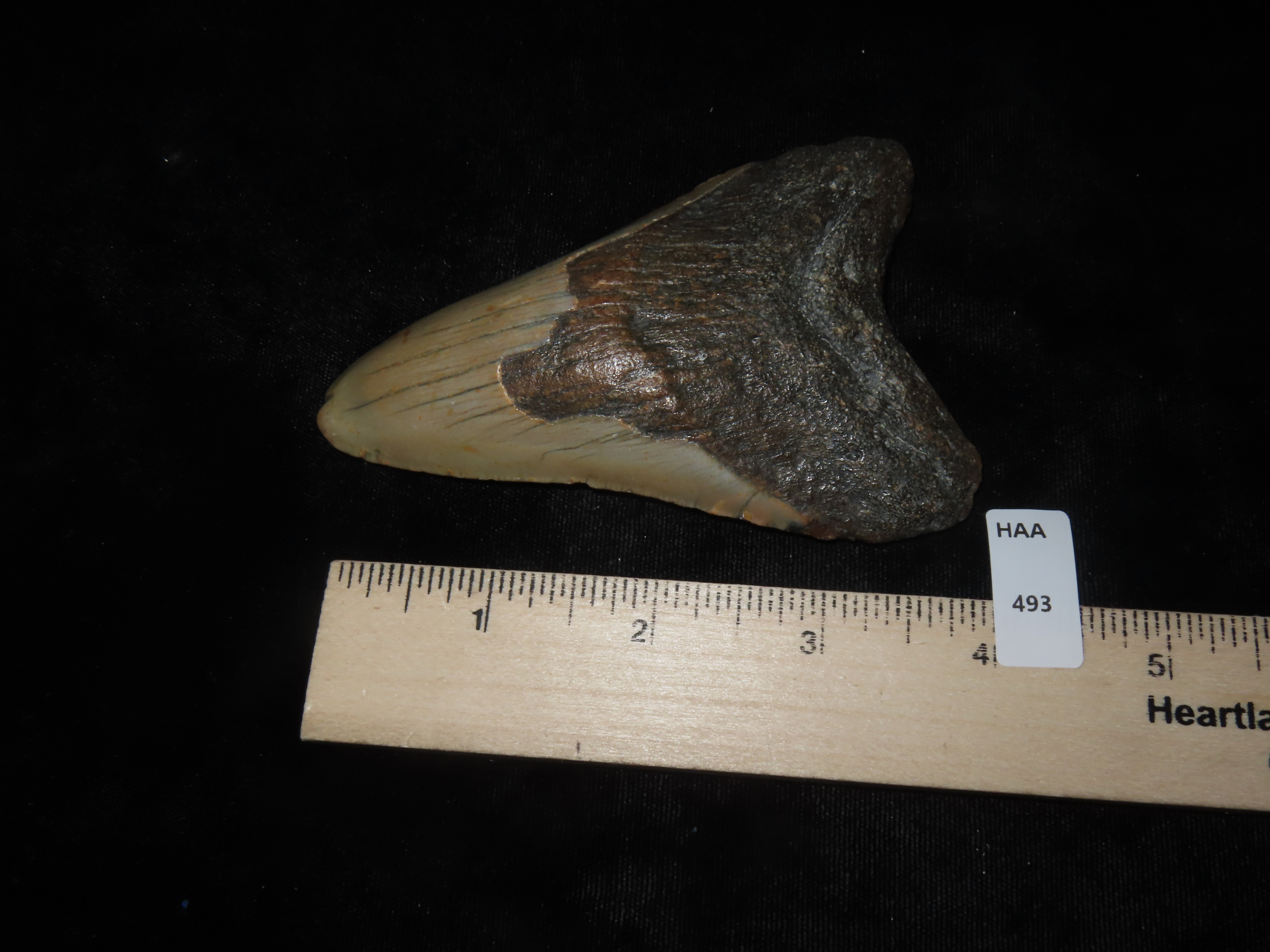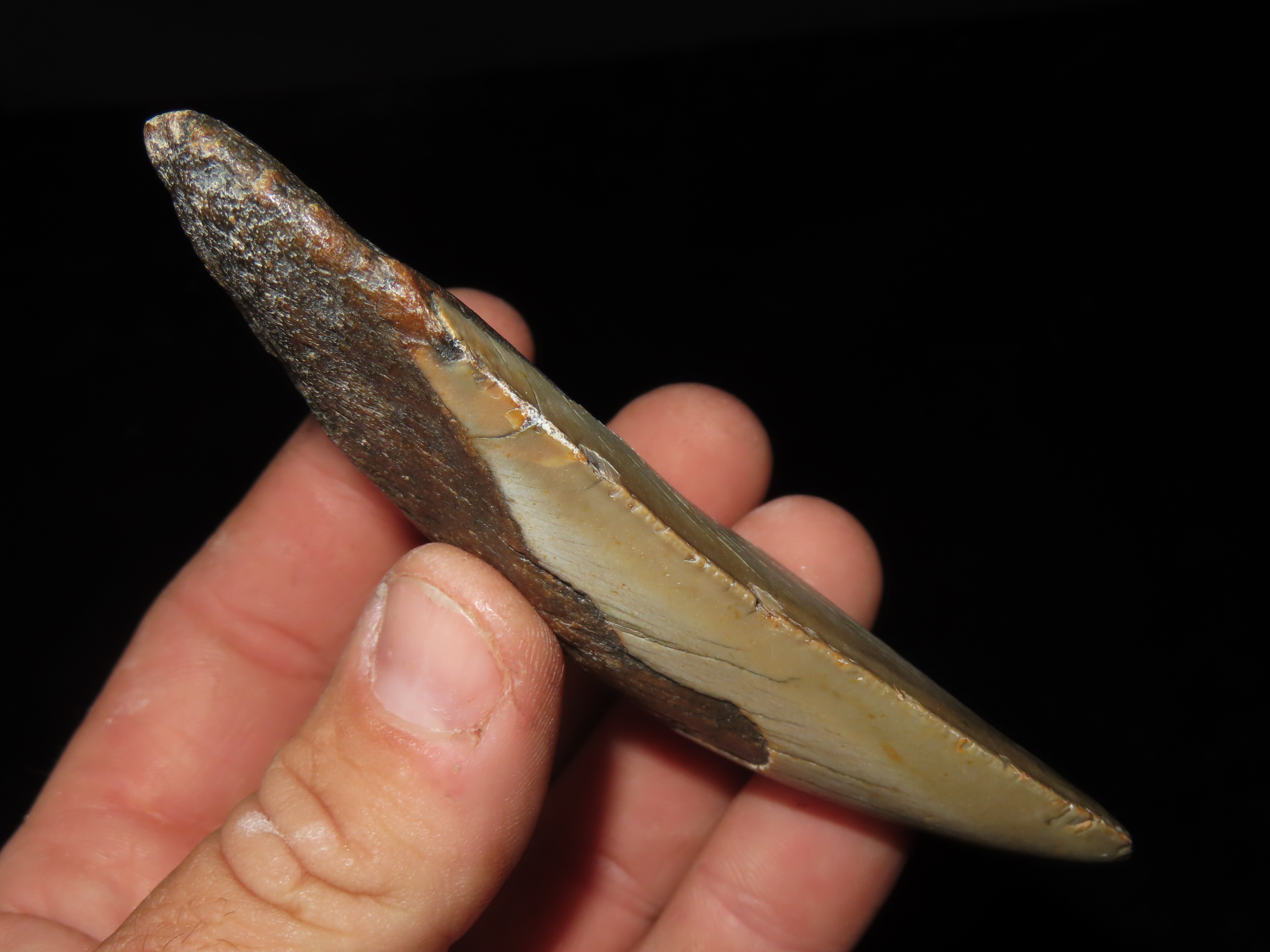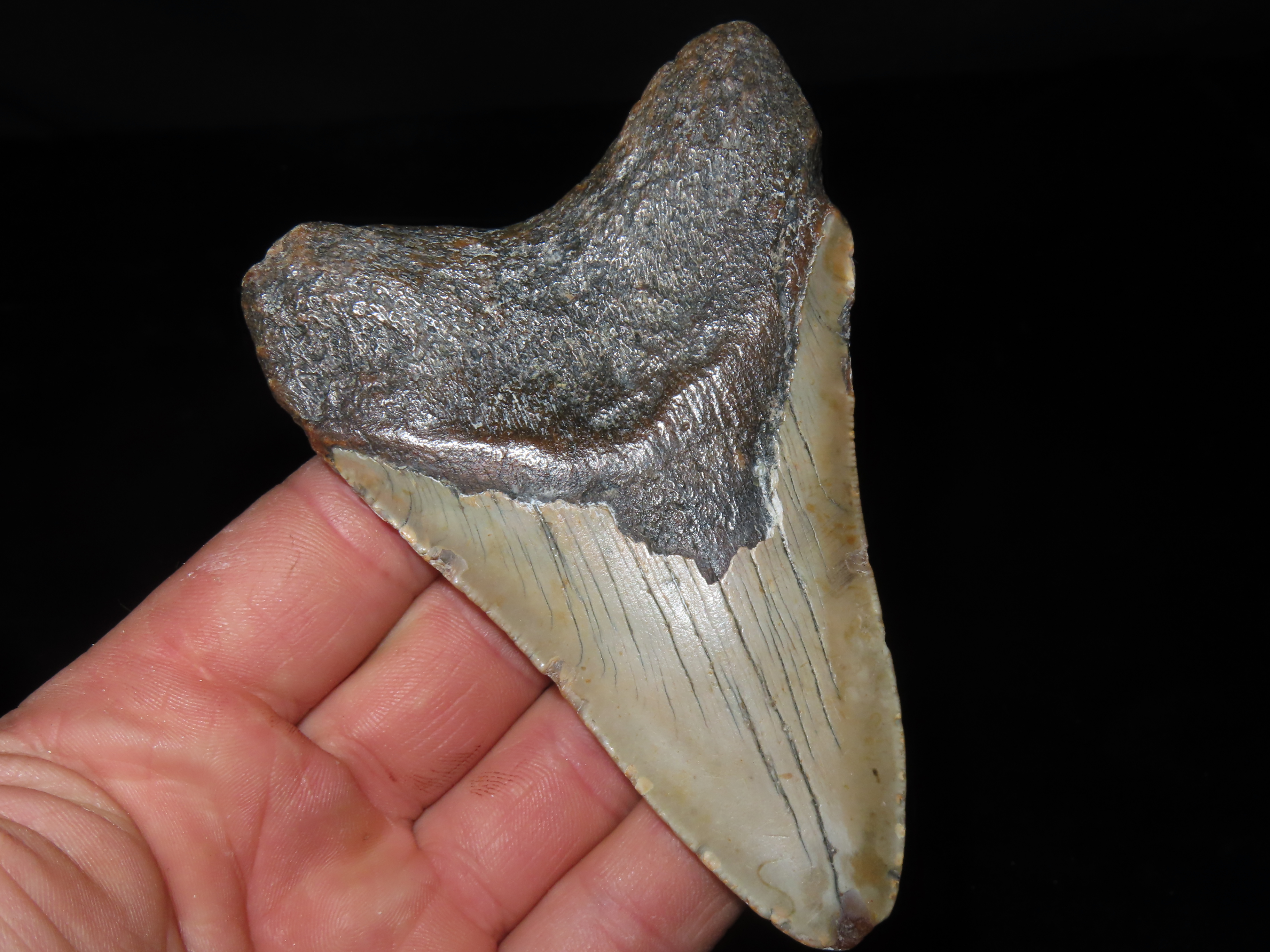 PERFECT HUGE 4 3/8″ MEGALODON SHARK TOOTH, 23-2.5 MILLION YEAR OLD FOSSIL FOUND OFF THE COAST OF THE CAROLINA’S, NO REPAIR, NO RESTO, NO POLISH