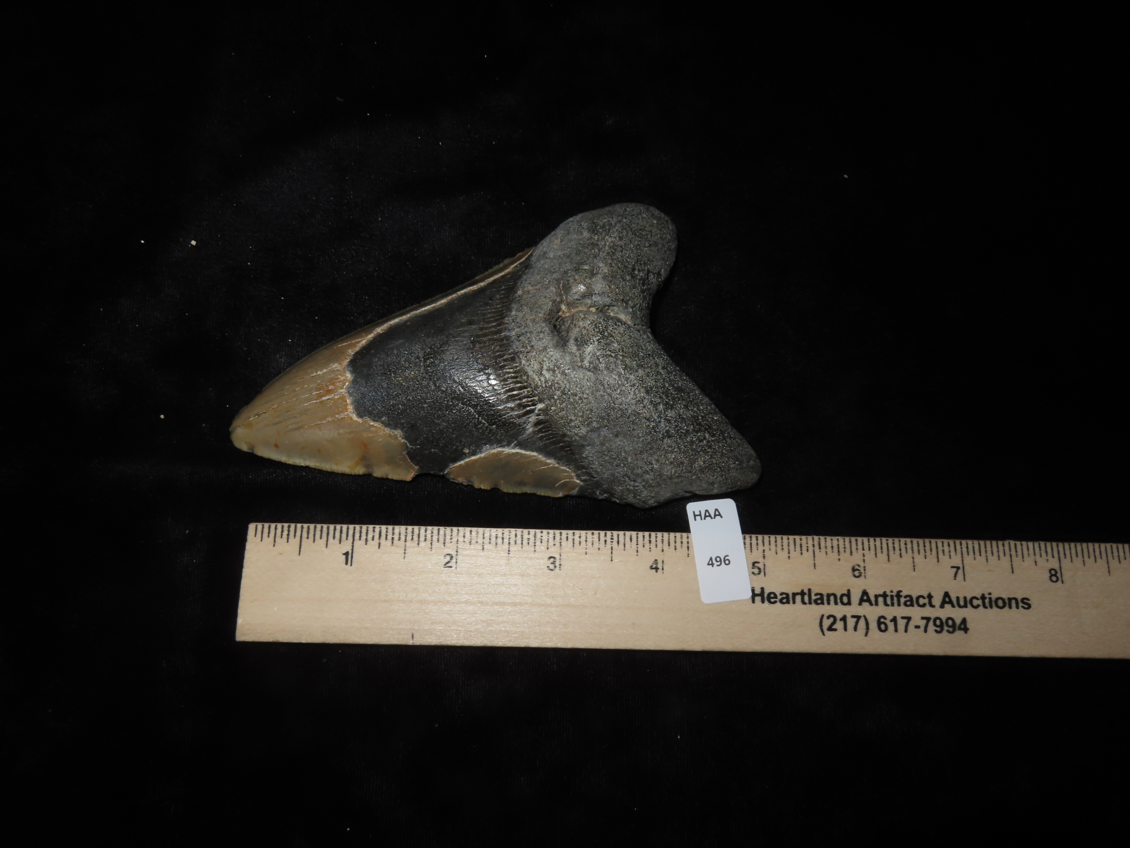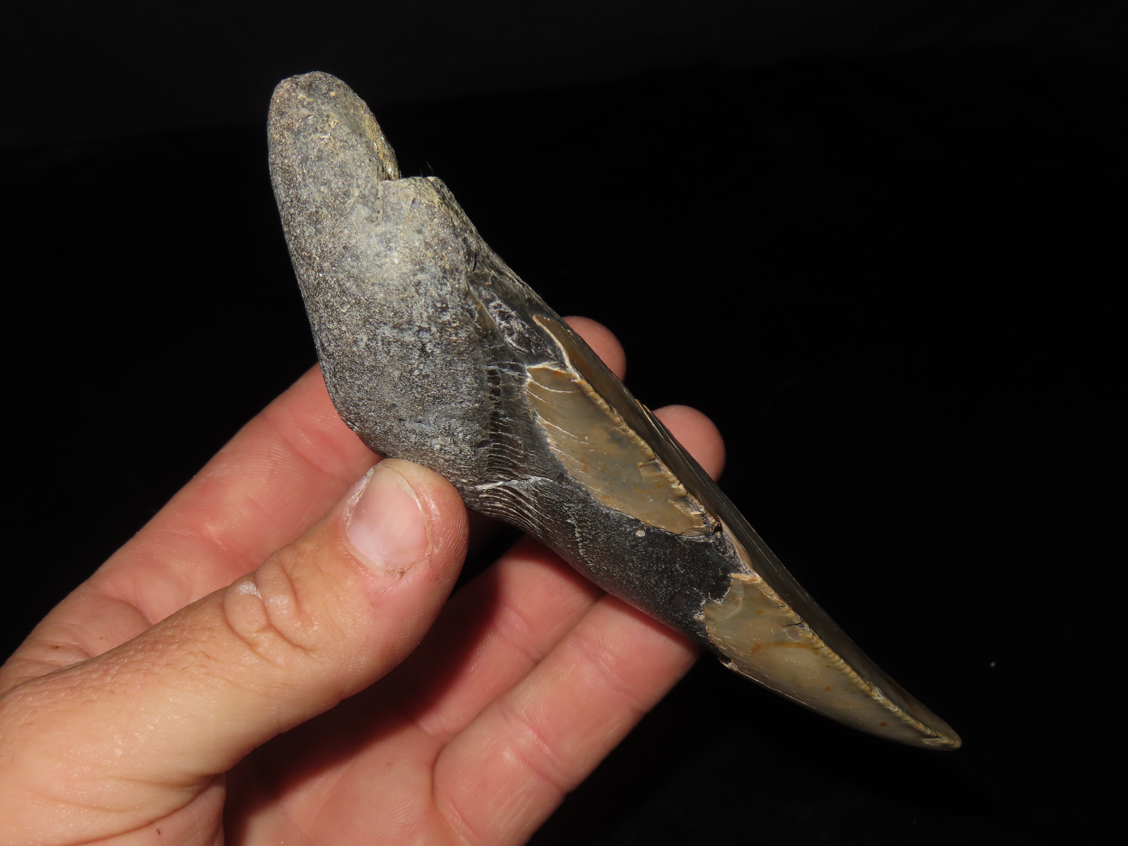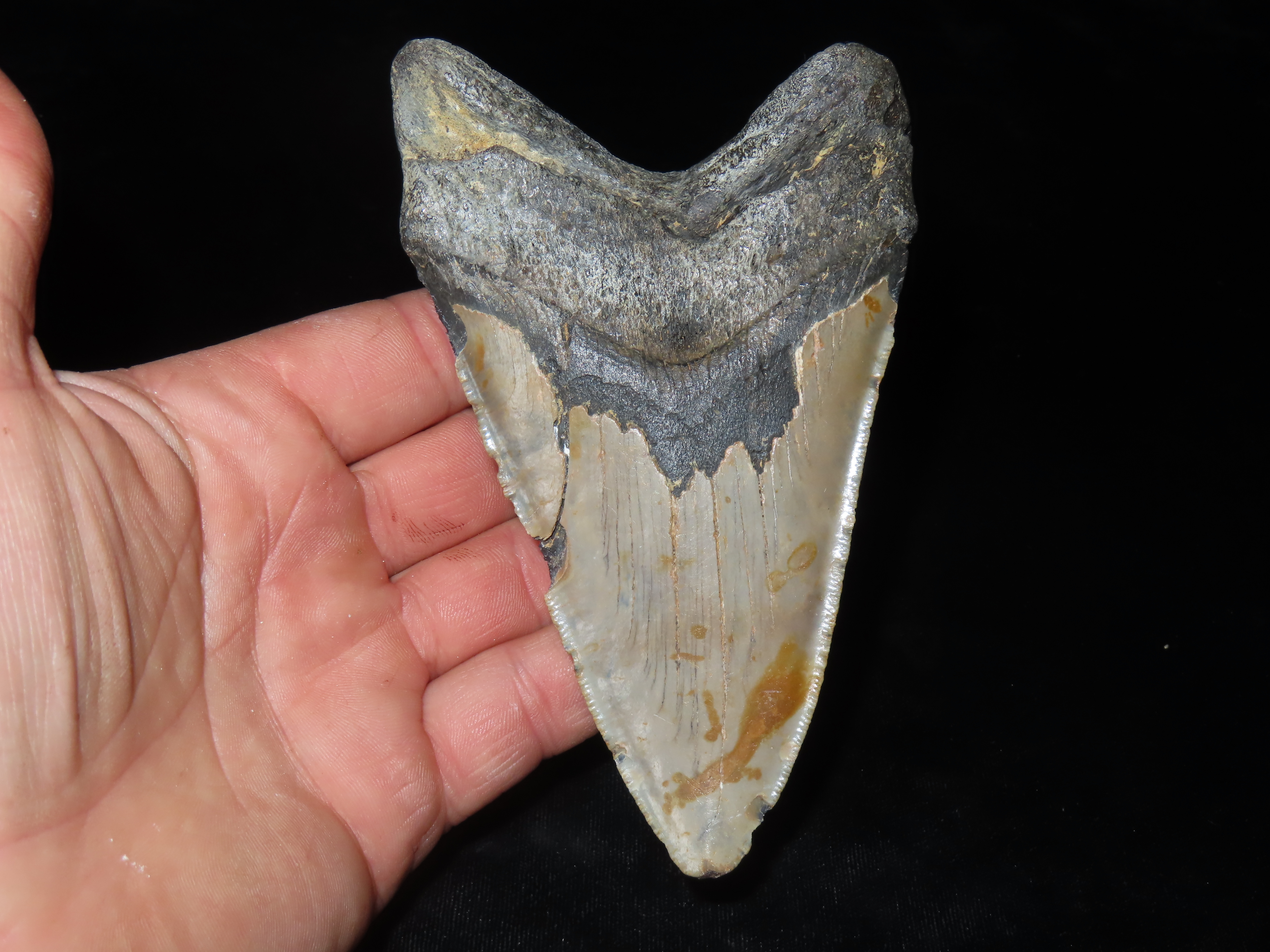 HUGE 5 5/16″ MEGALODON SHARK TOOTH, 23-2.5 MILLION YEAR OLD FOSSIL FOUND OFF THE COAST OF THE CAROLINA’S, NO REPAIR, NO RESTO, NO POLISH