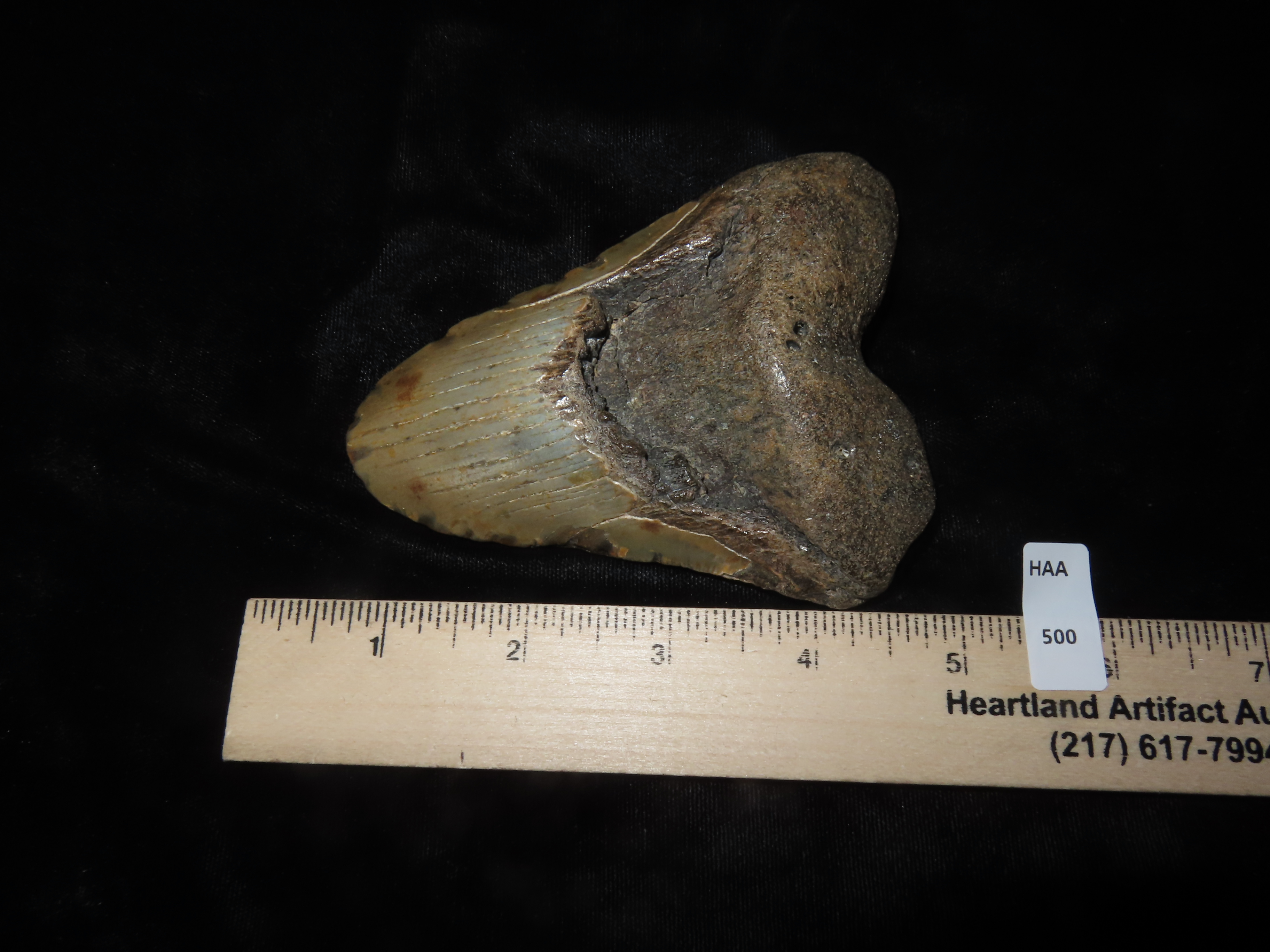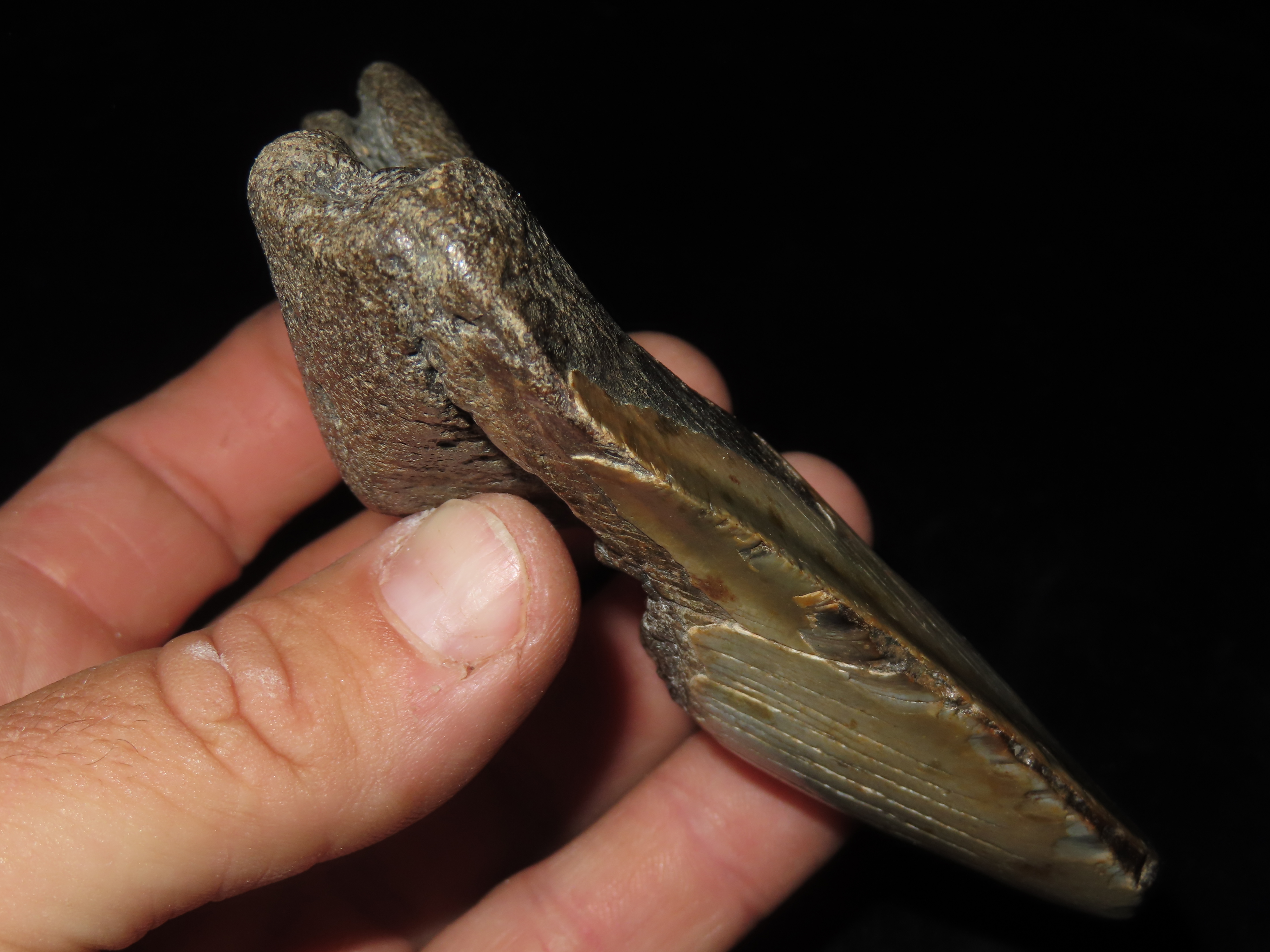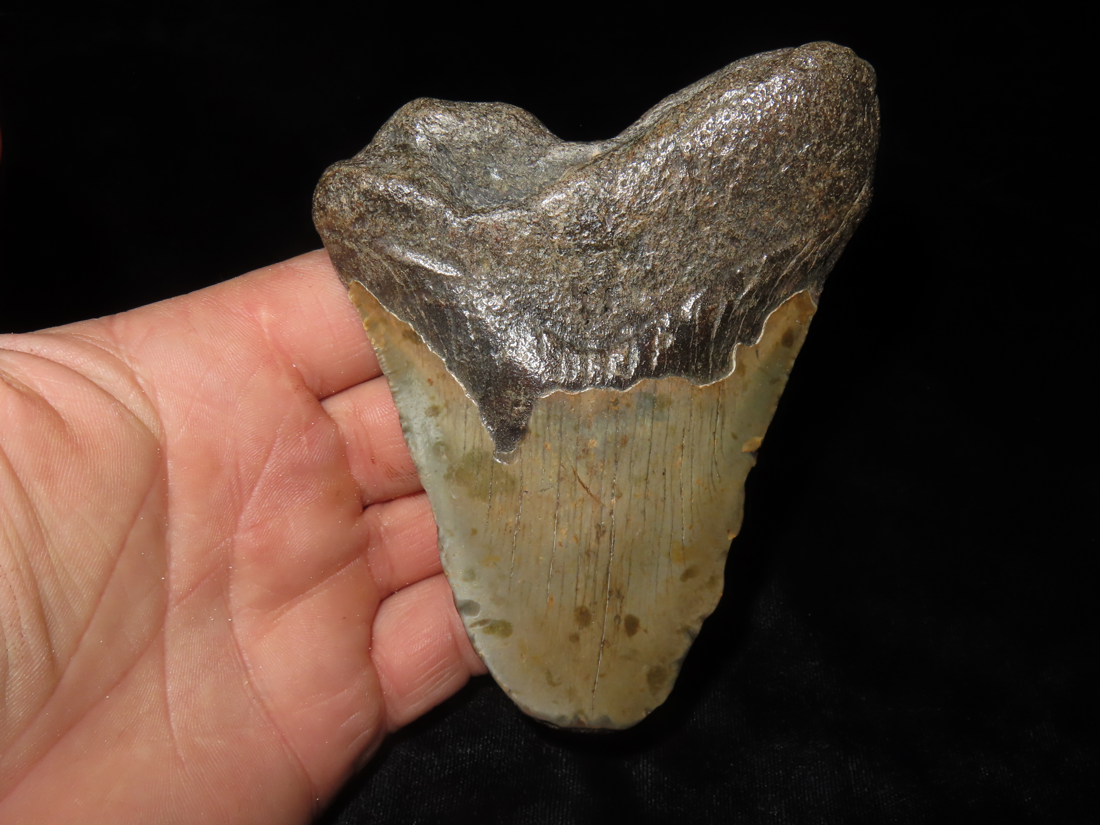 PERFECT HUGE 4 1/2″ MEGALODON SHARK TOOTH, 23-2.5 MILLION YEAR OLD FOSSIL FOUND OFF THE COAST OF THE CAROLINA’S, NO REPAIR, NO RESTO, NO POLISH