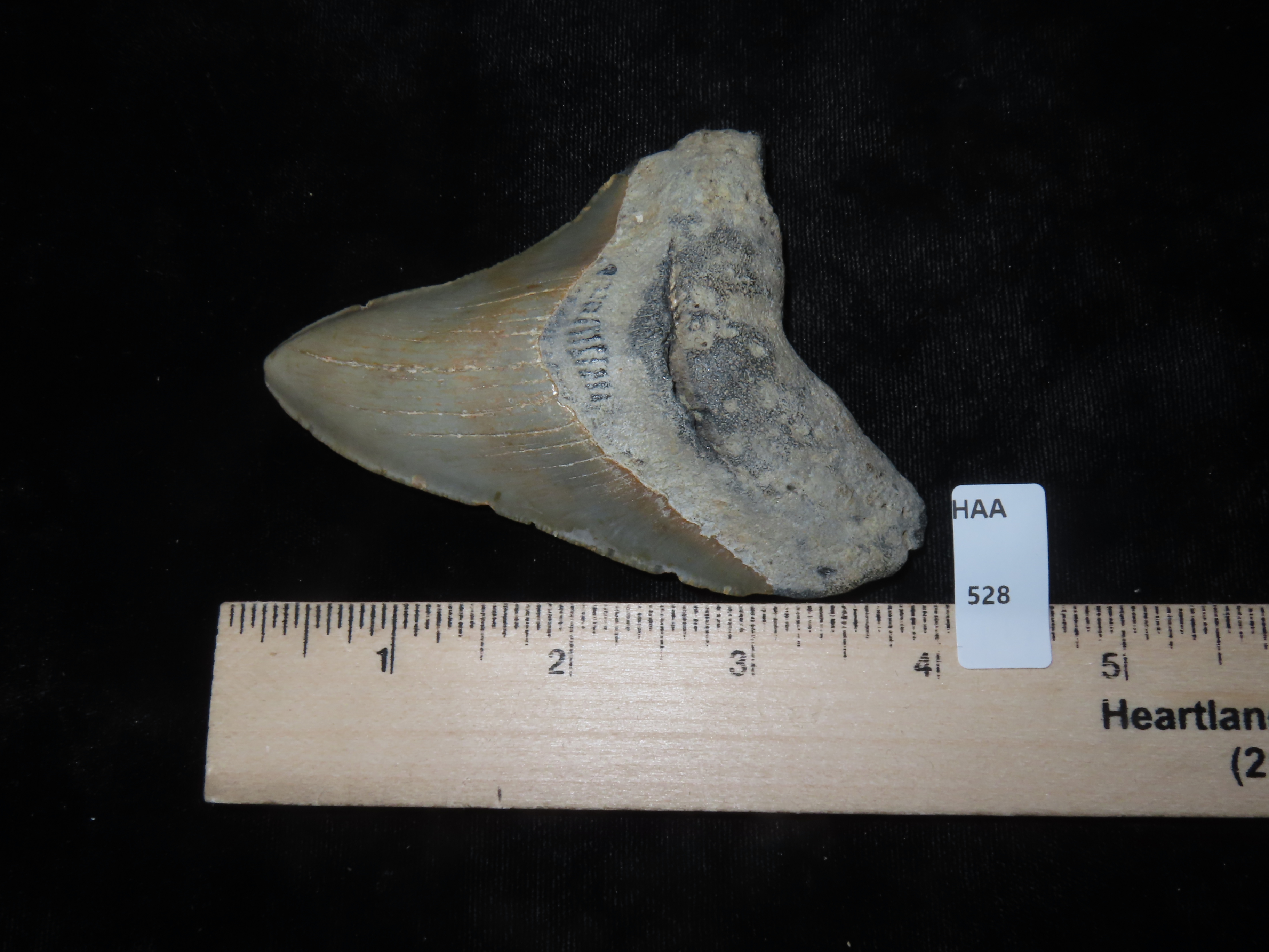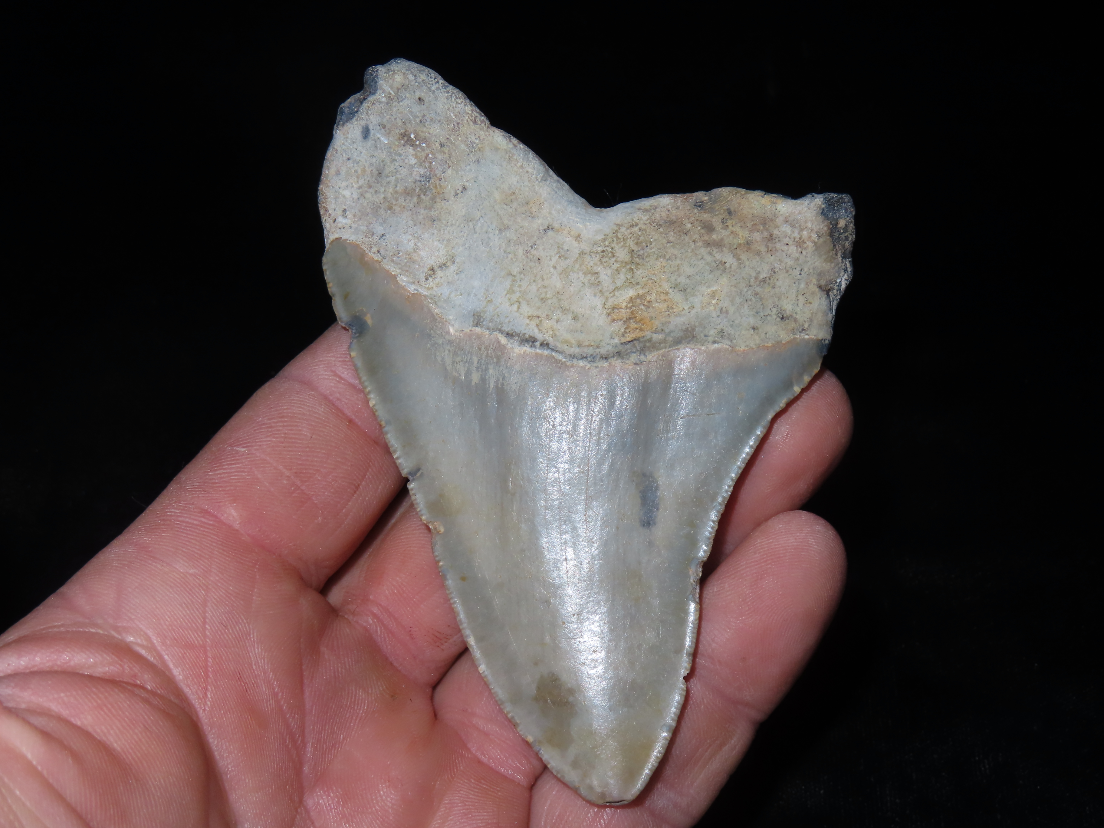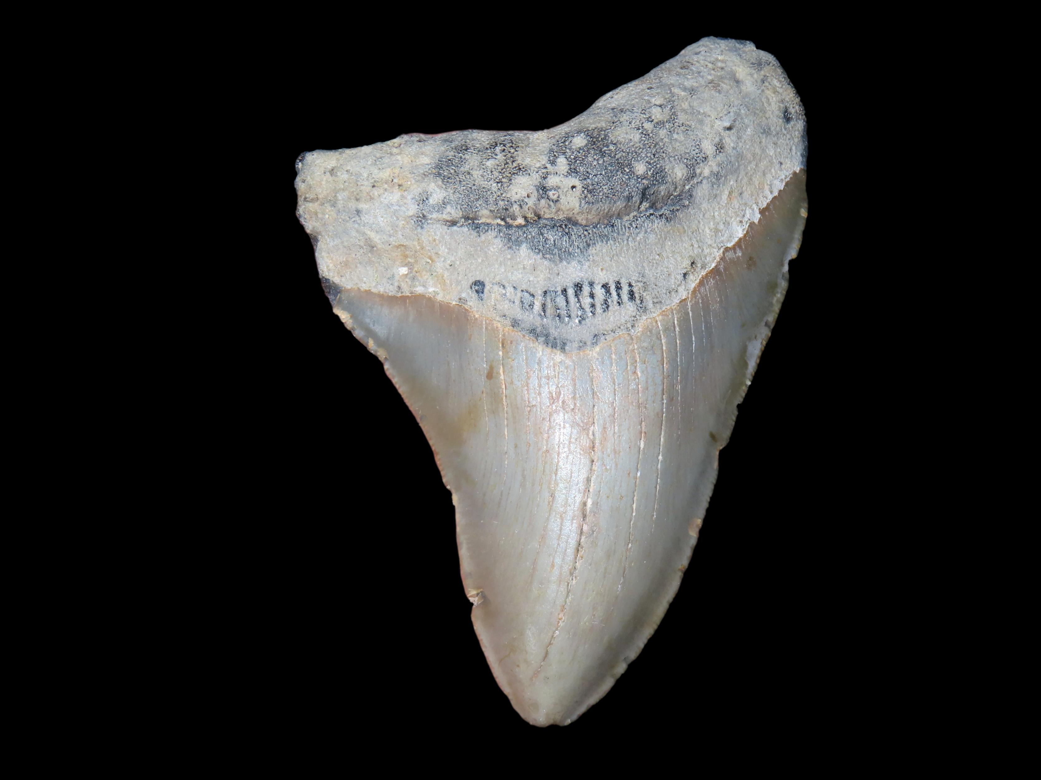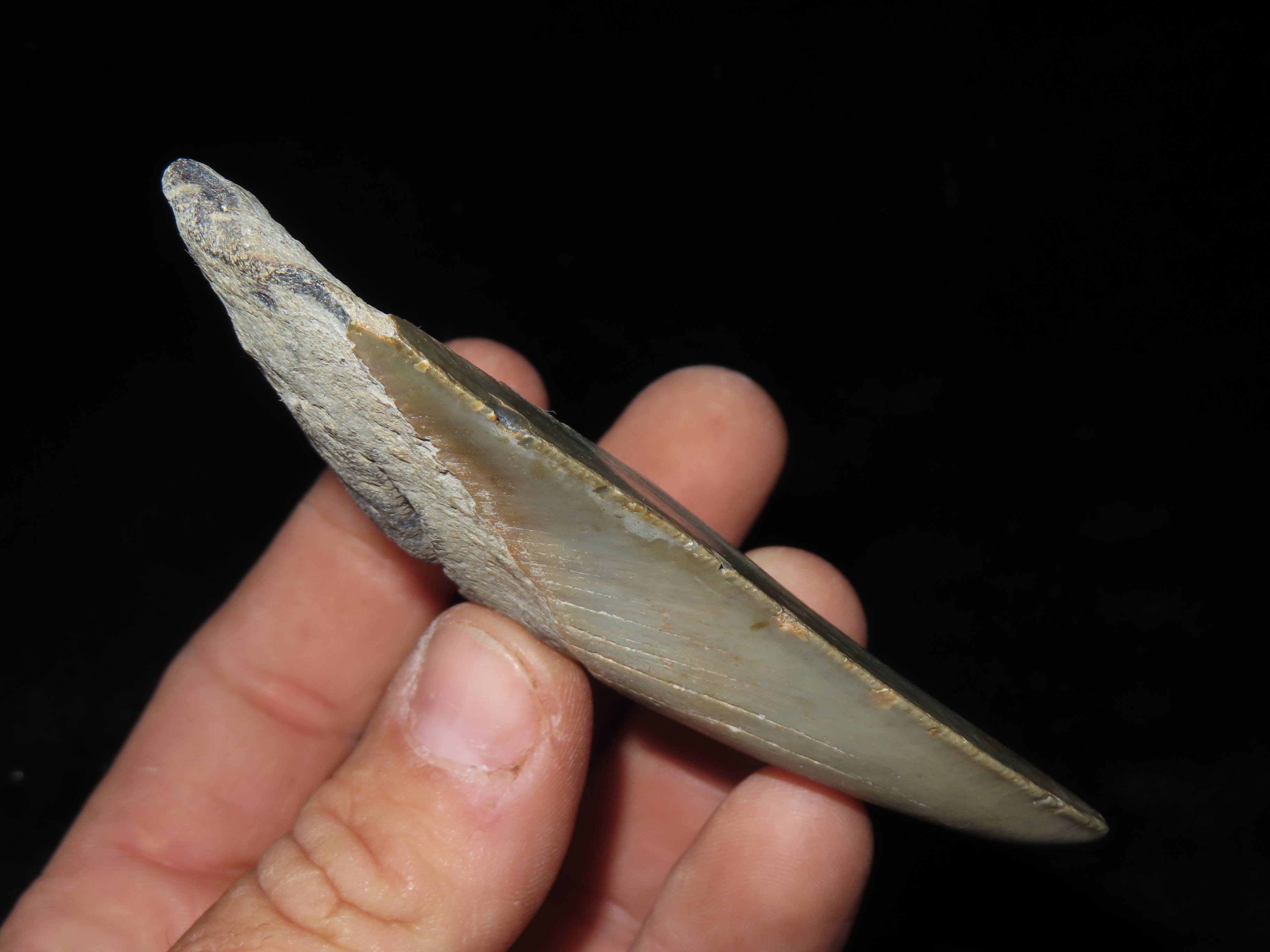 HUGE 4″ MEGALODON SHARK TOOTH, 23-2.5 MILLION YEAR OLD FOSSIL FOUND OFF THE COAST OF THE CAROLINA’S, NO REPAIR, NO RESTO, NO POLISH