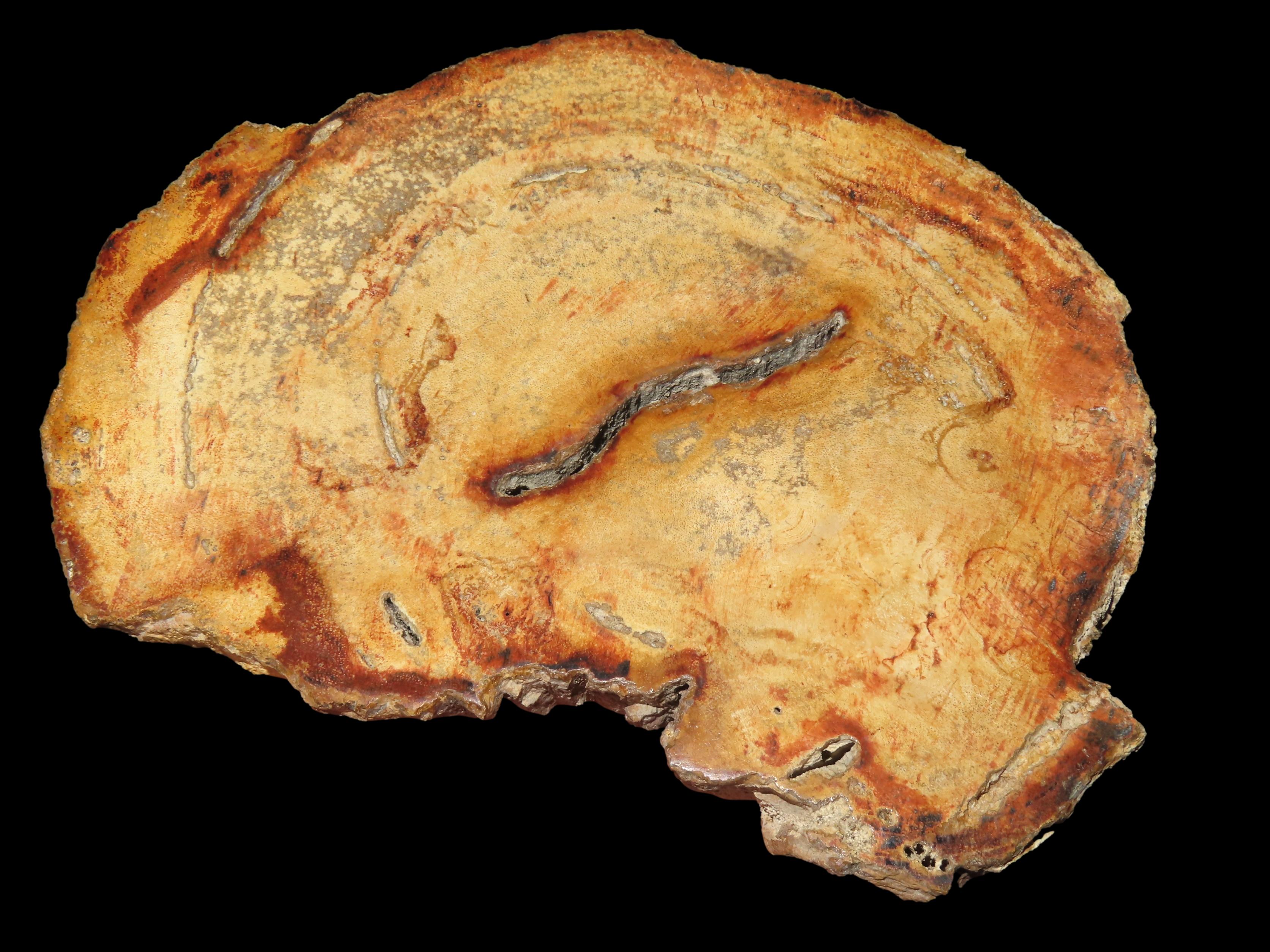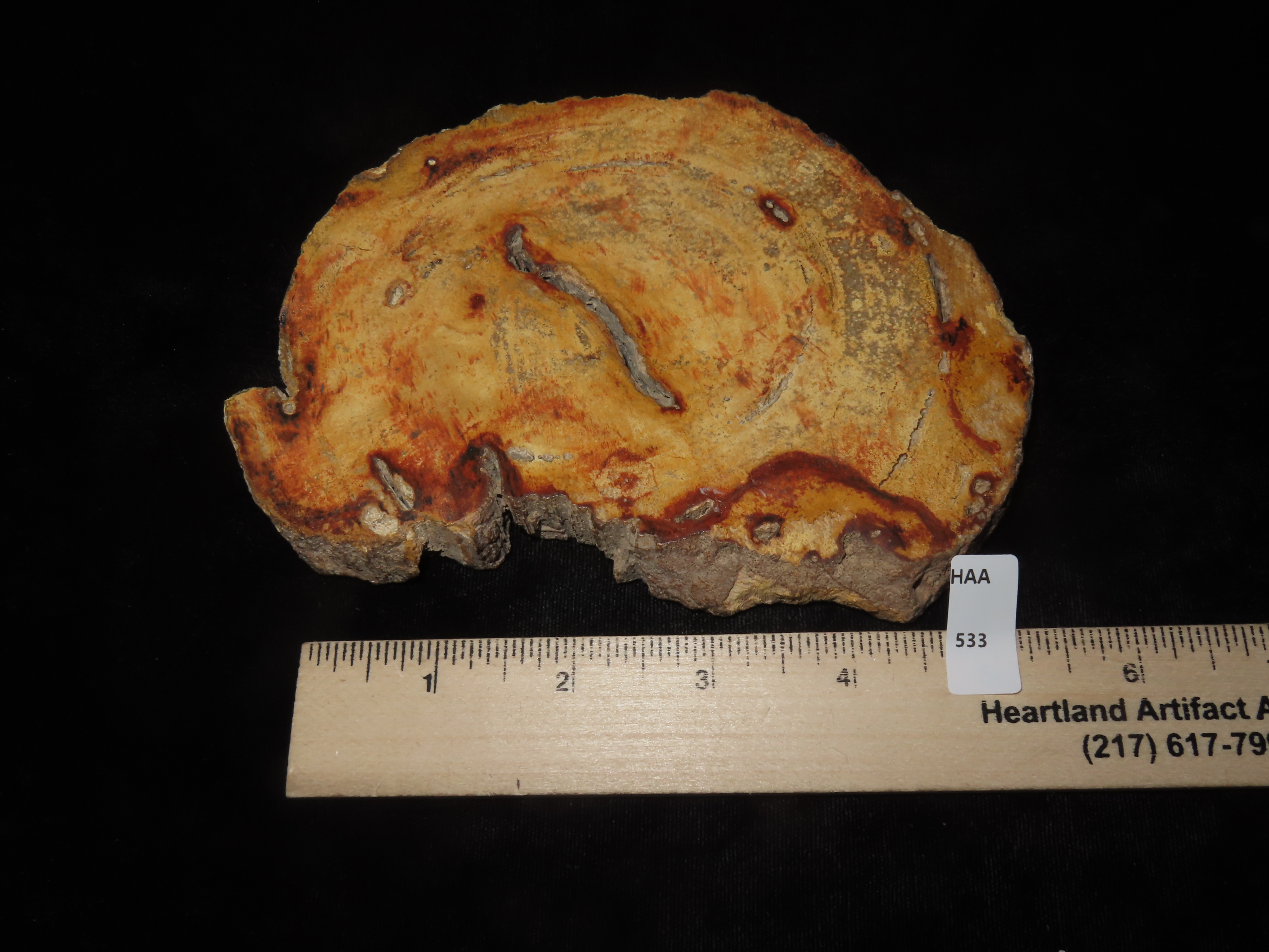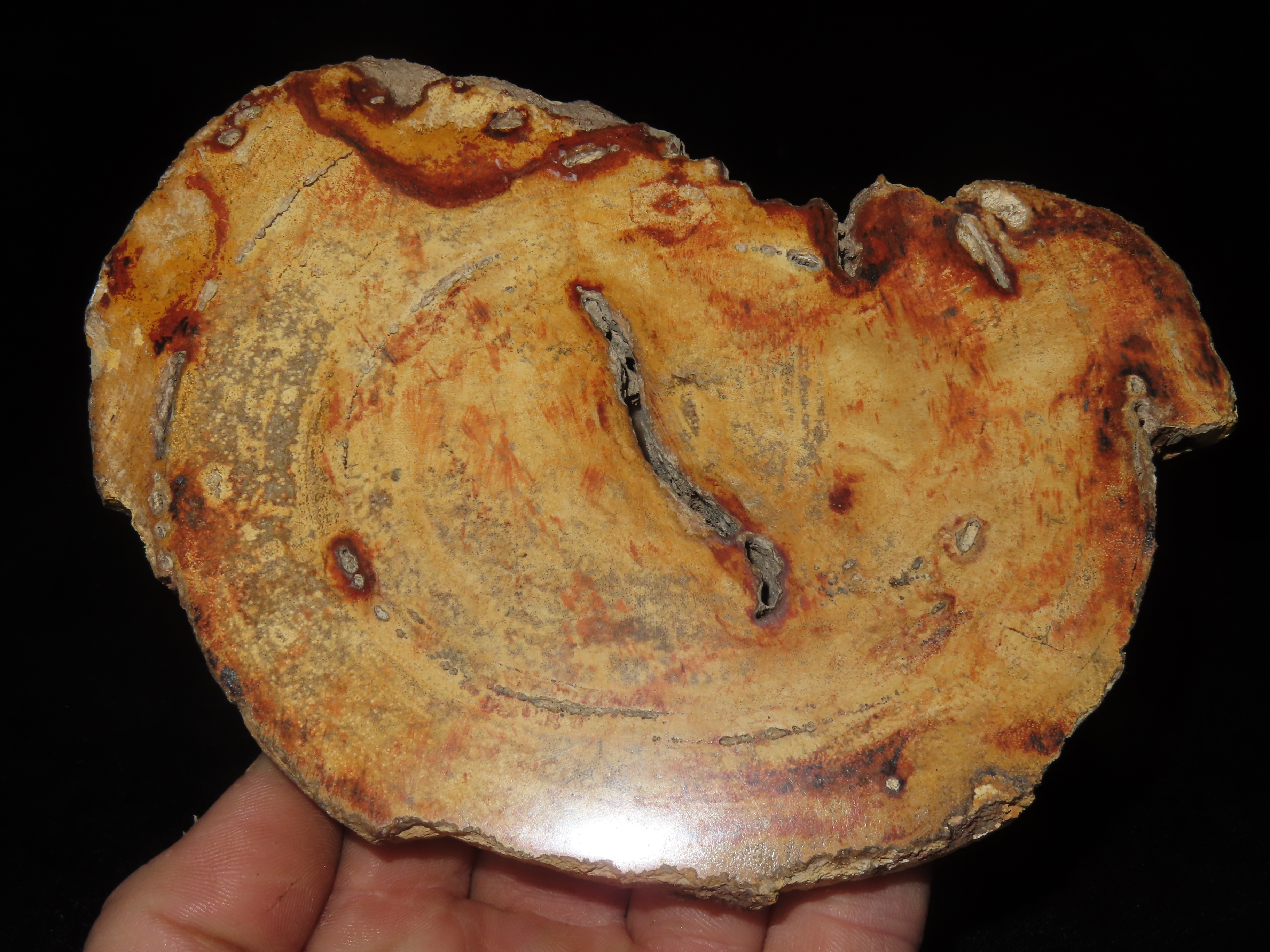 BEAUTIFUL LARGE 6 1/8″ SLAB OF PETRIFIED WOOD WITH SOME GREAT COLOR, NICELY POLISHED ON BOTH FACES, GREAT DISPLAY PIECE
