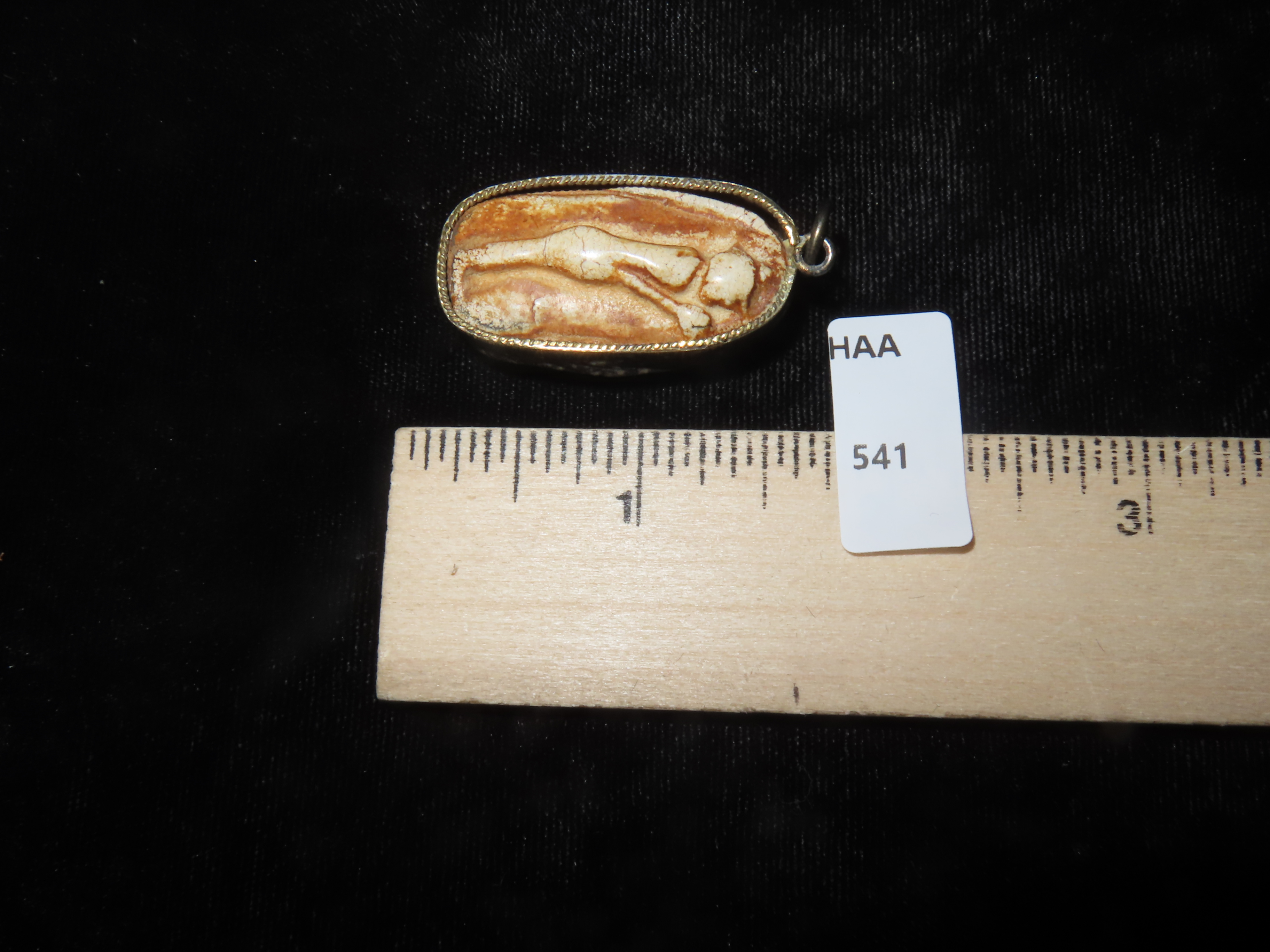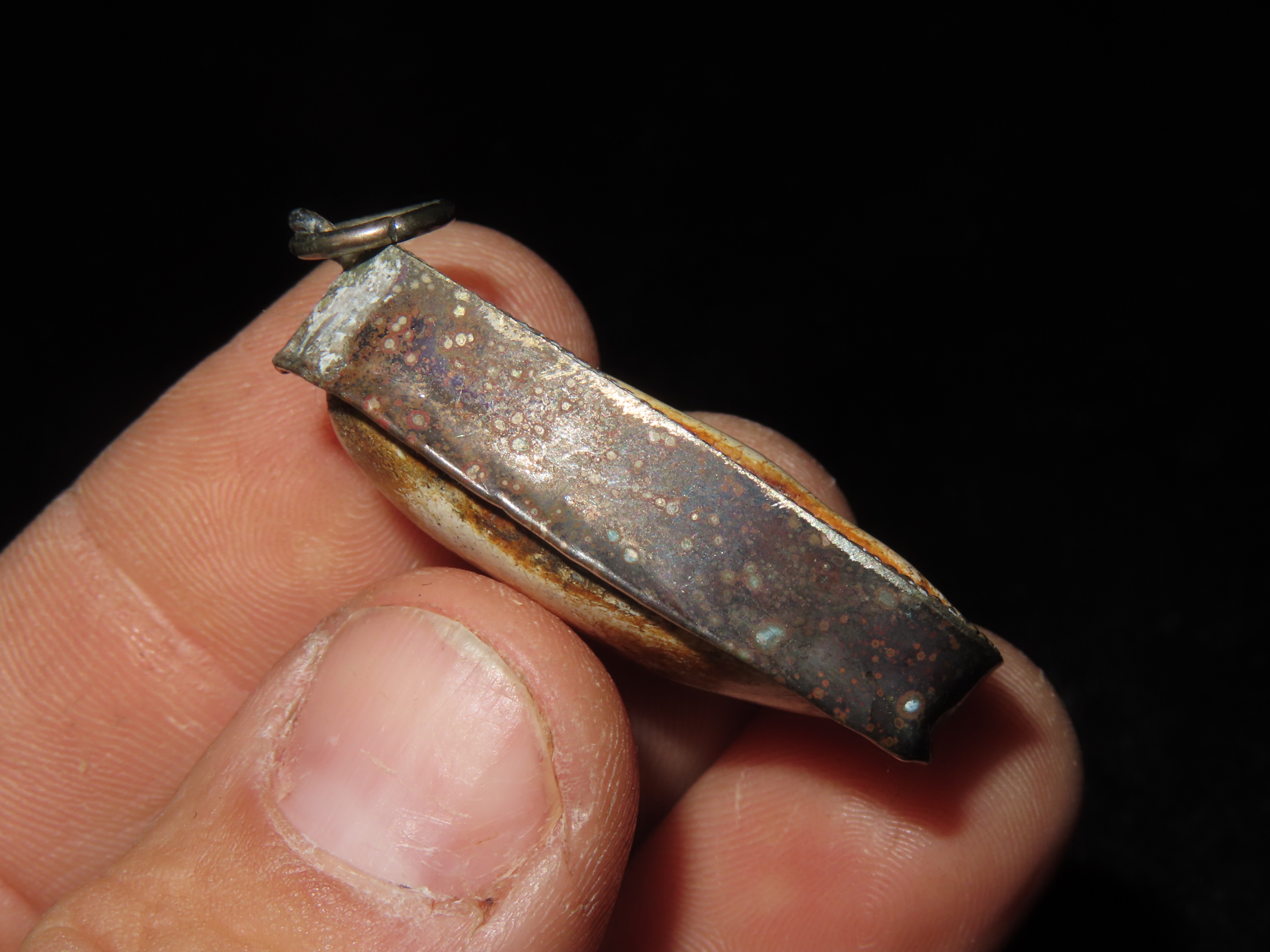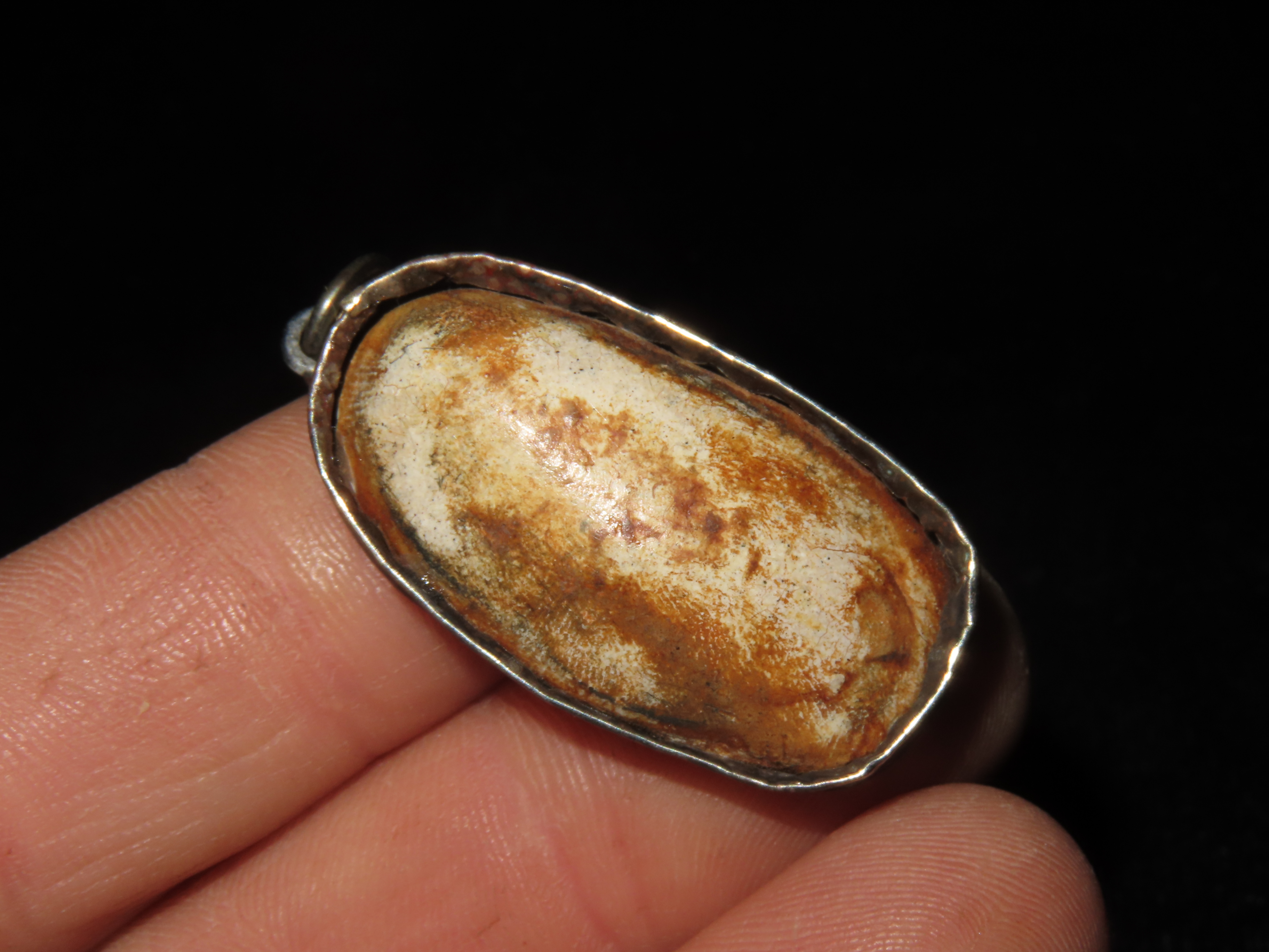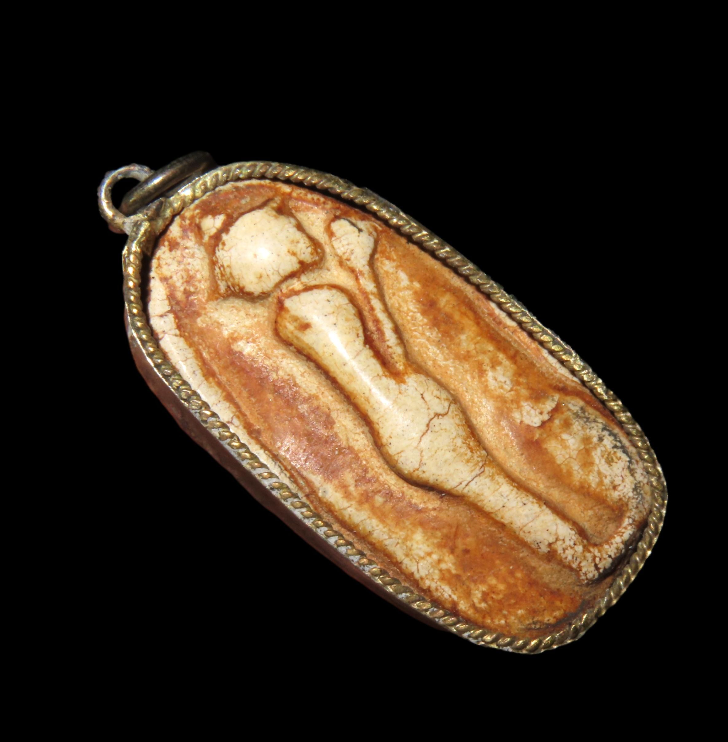 ANTIQUE CHINESE CARVED STONE RELIGOUS PENDANT, WRAPPED IN BRONZE BEZEL, GREAT VINTAGE PIECE OF JEWELRY