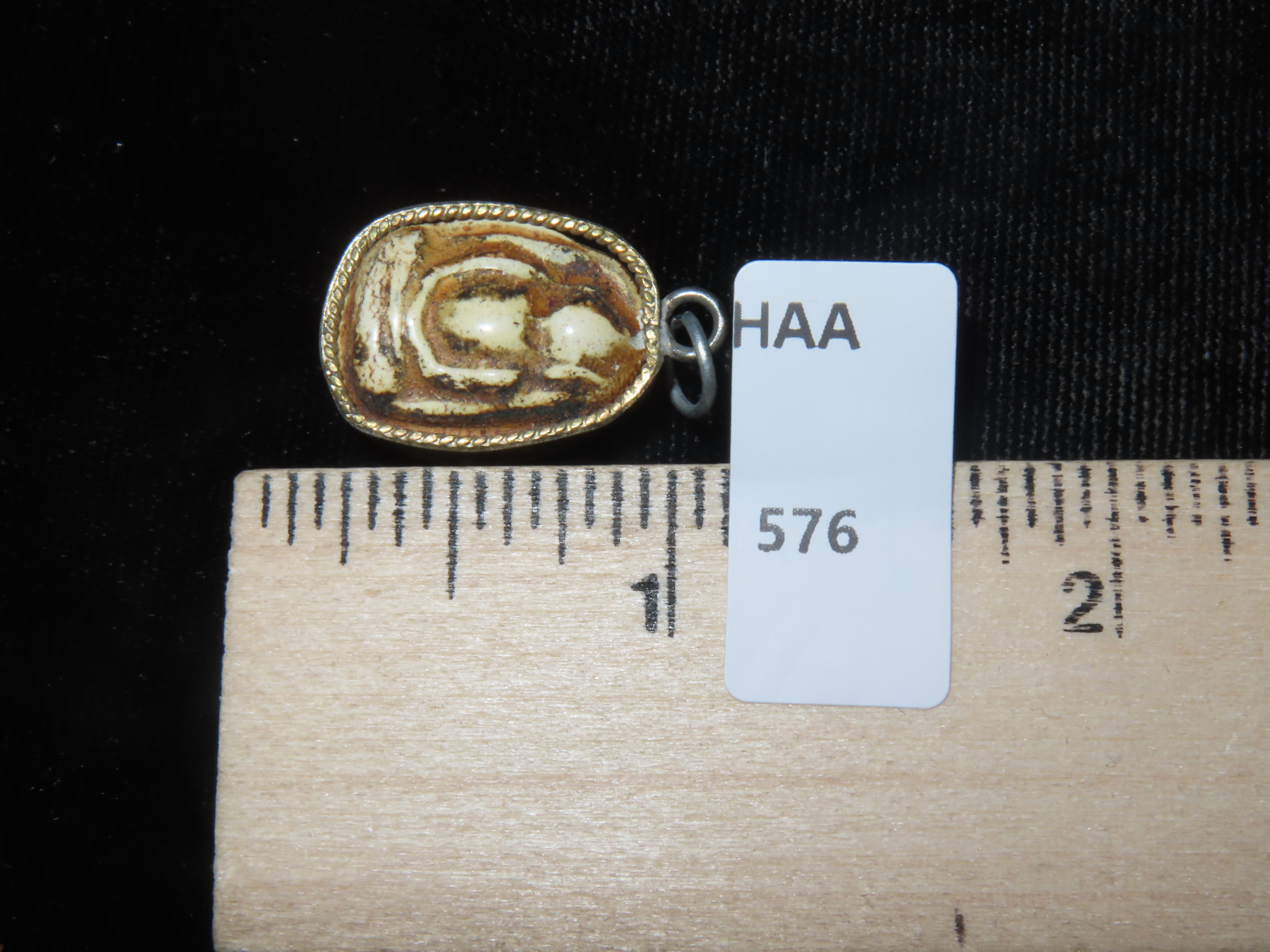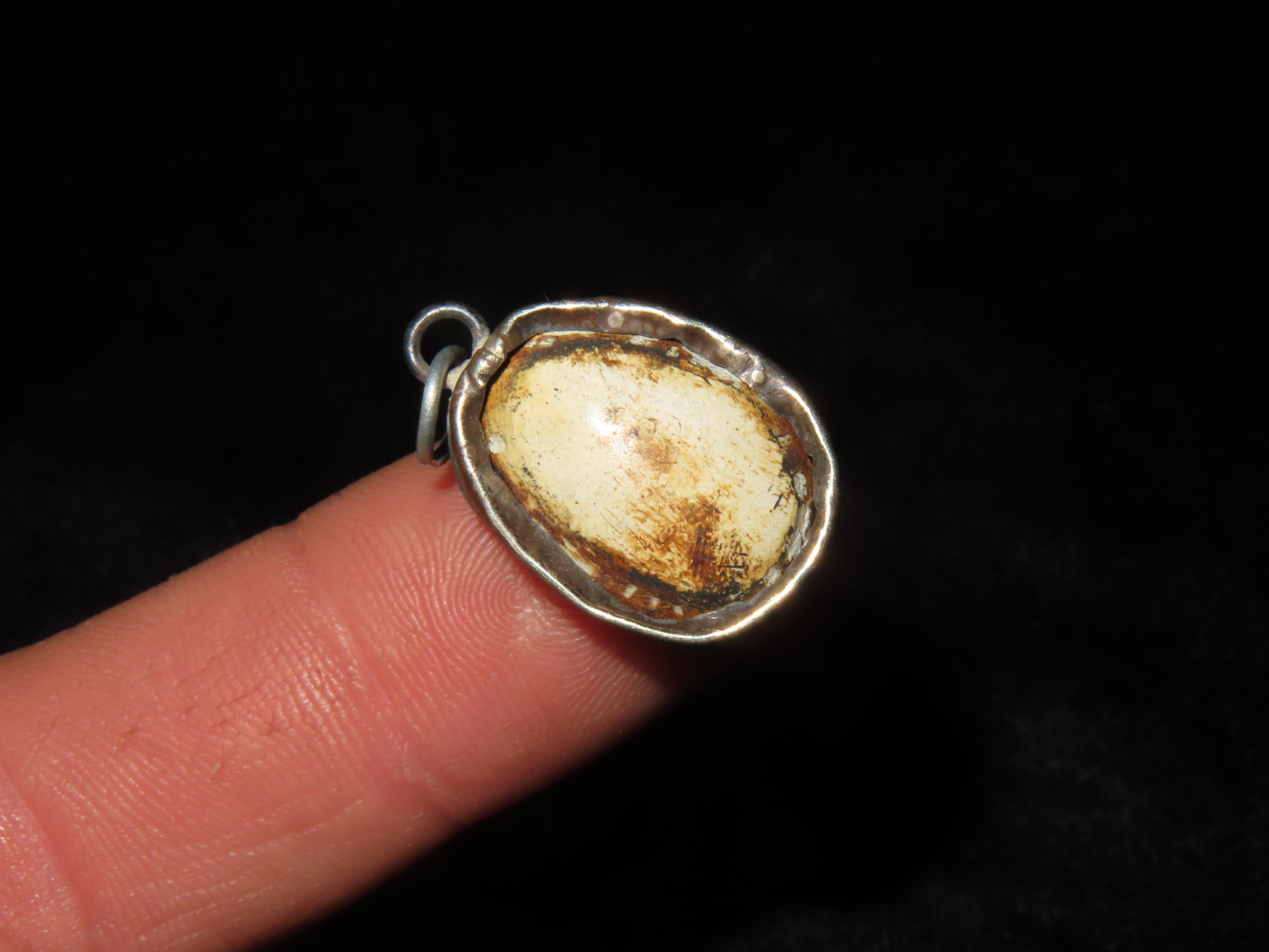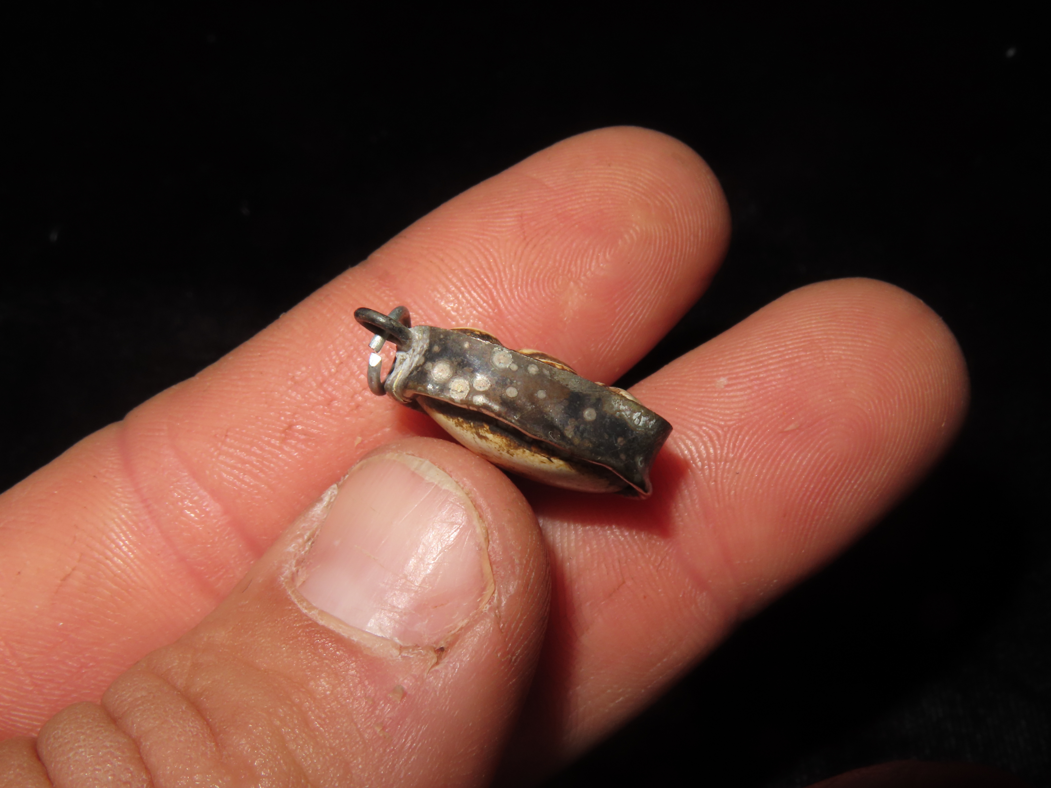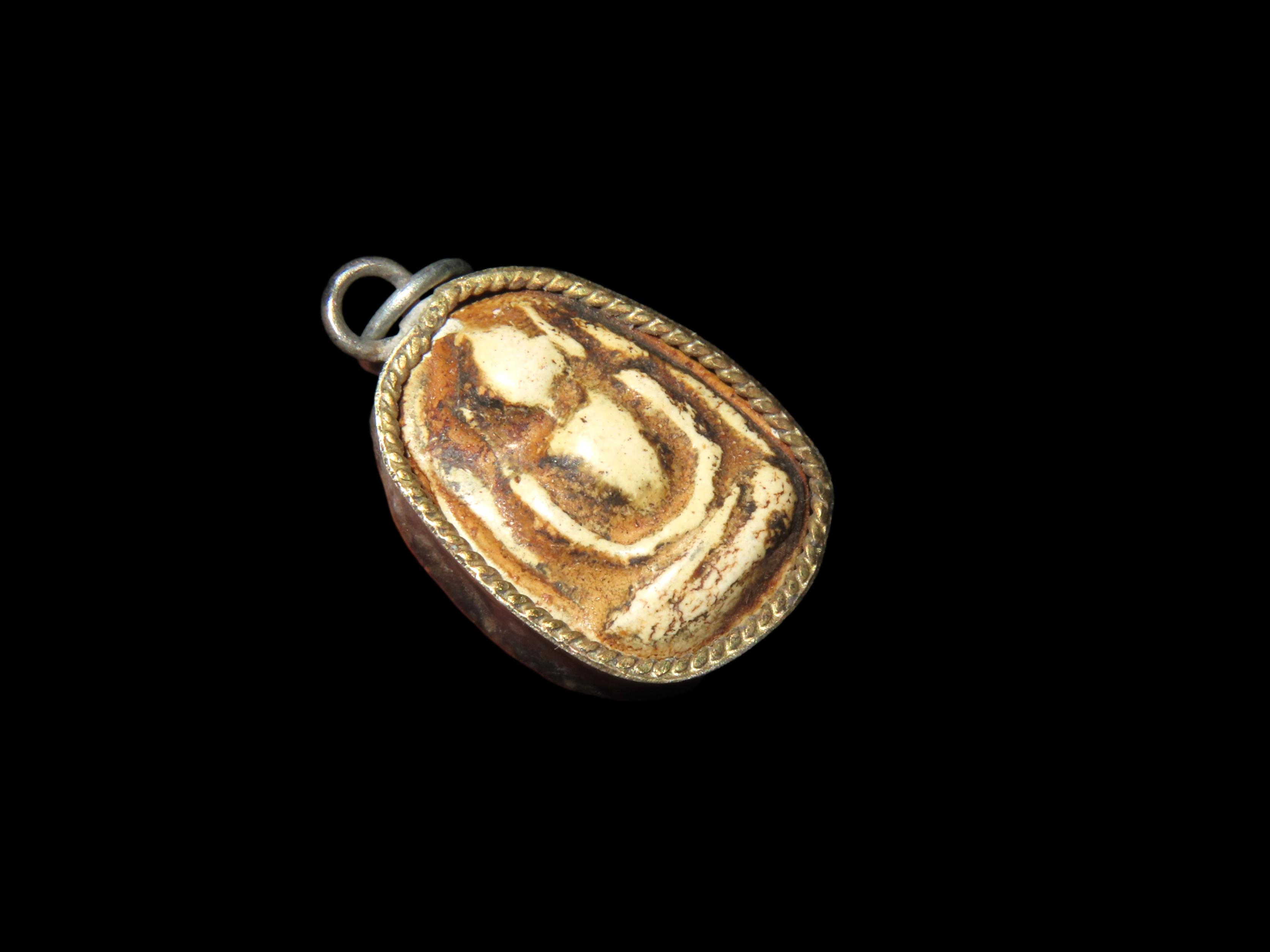 ANTIQUE CHINESE STONE BUDDAH PENDANT, WRAPPED IN BRONZE BEZEL, GREAT VINTAGE PIECE OF JEWELRY
