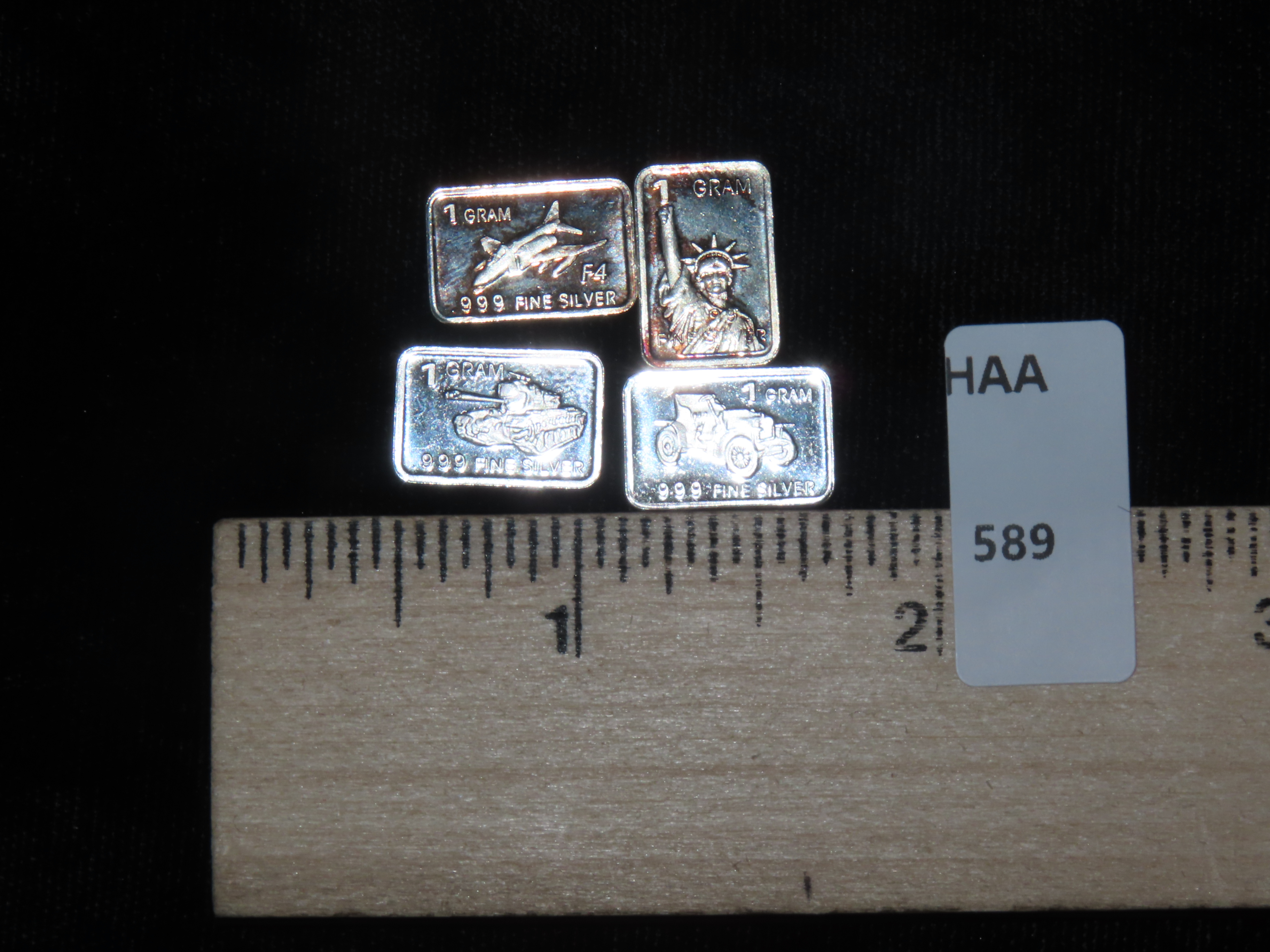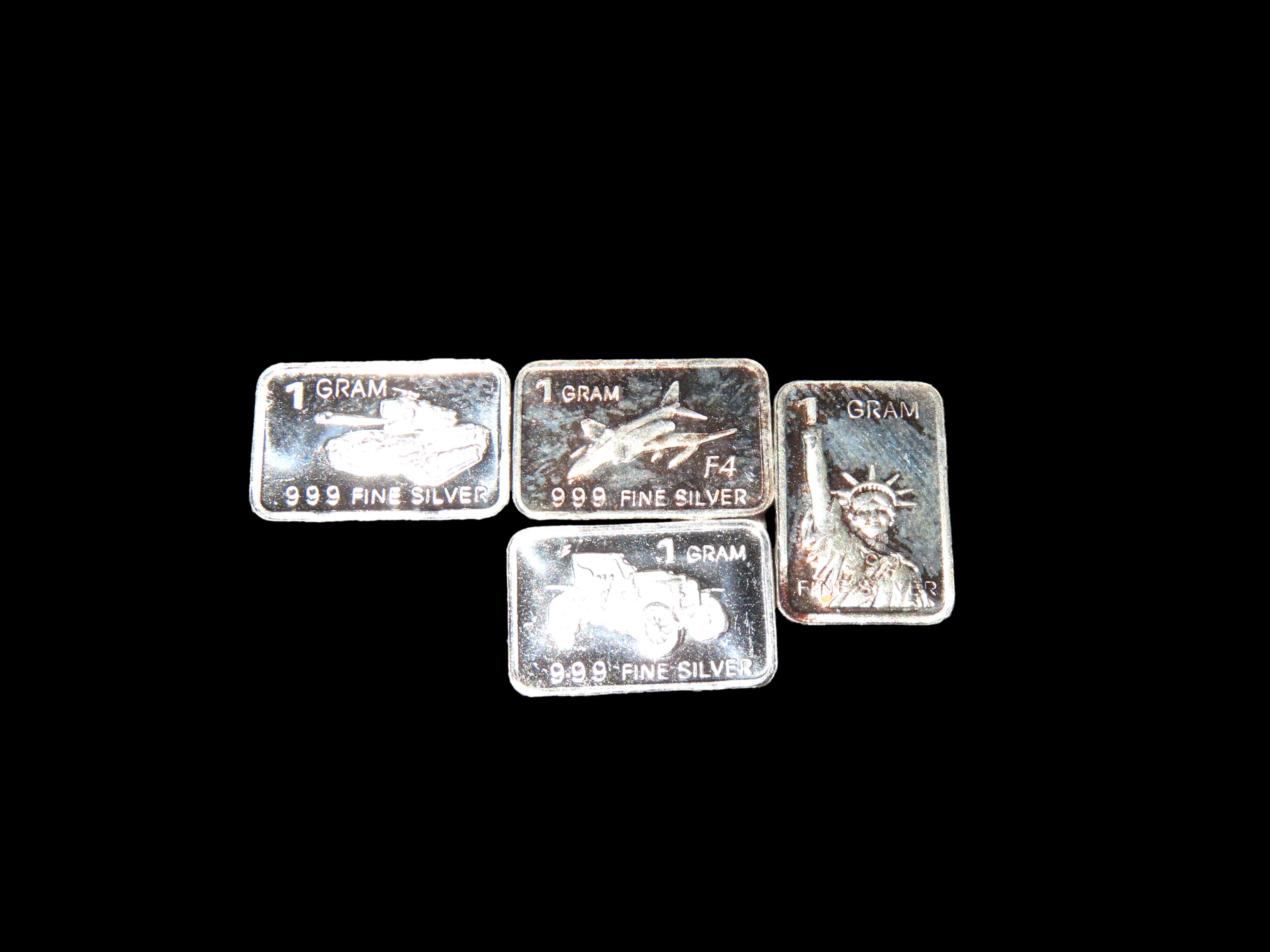 LOT OF 4 MINI SOLID SILVER BARS, 1 GRAM EACH, SILVER BULLION