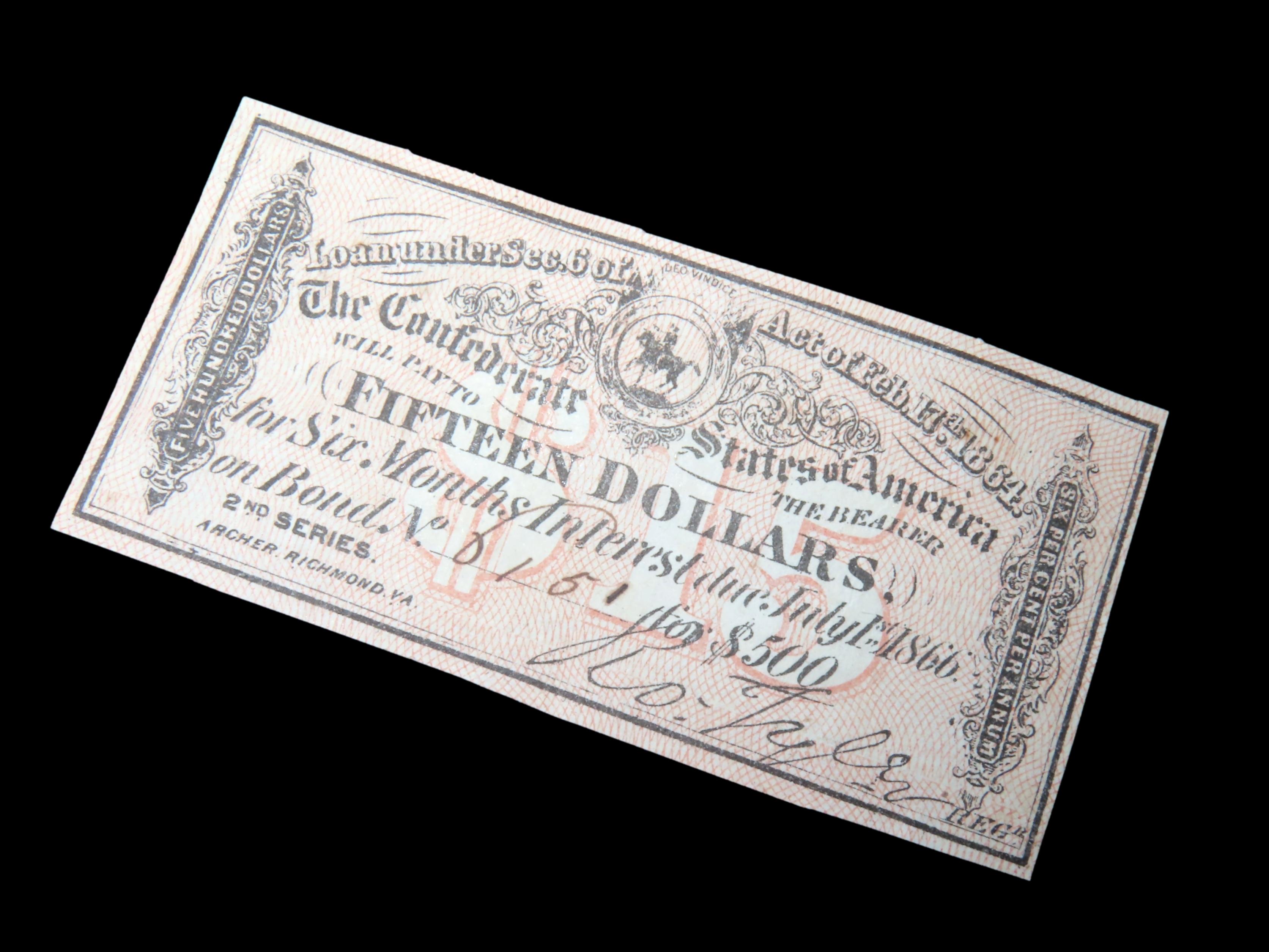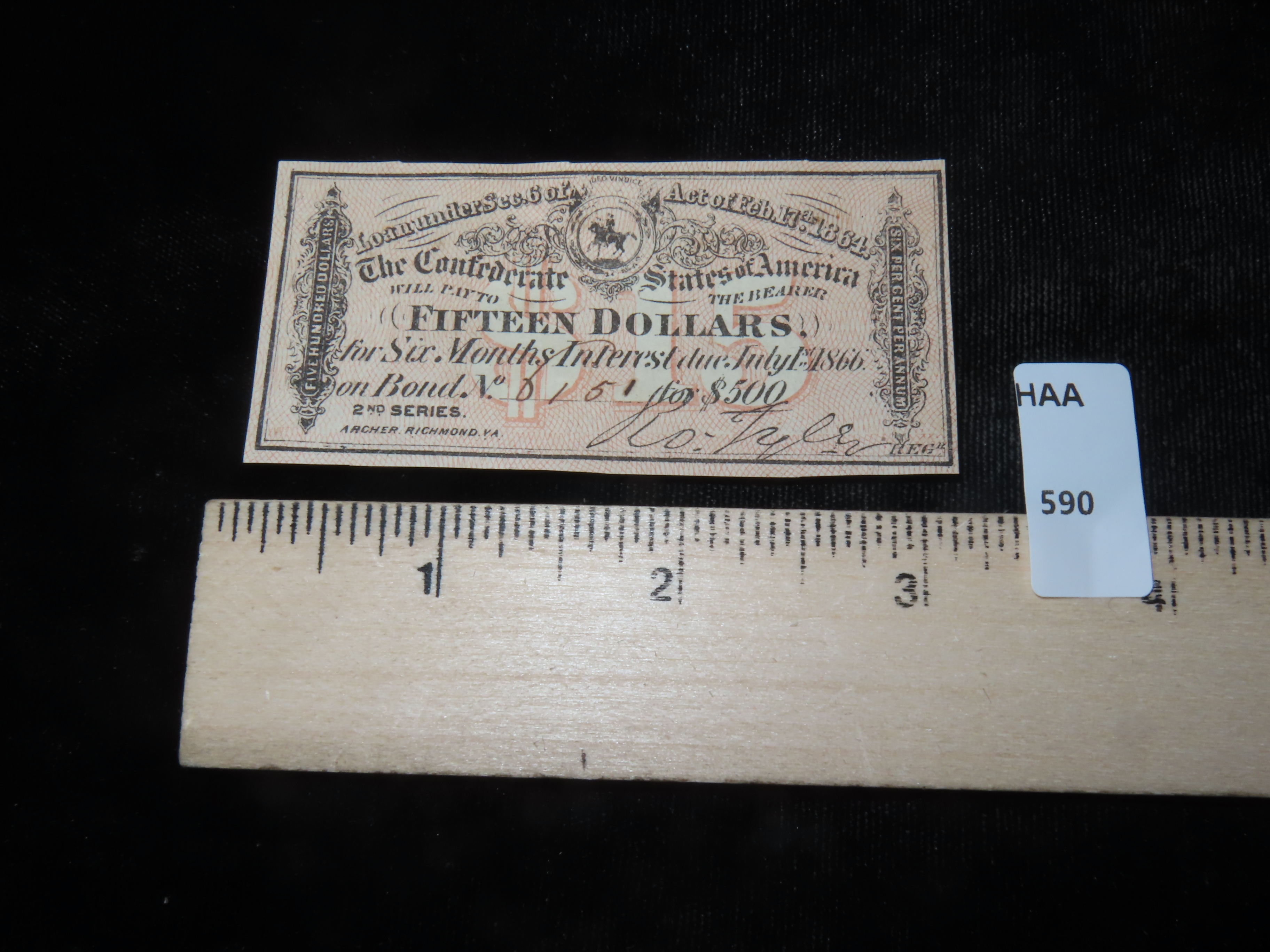 CIVIL WAR CONFEDERATE CURRENCY $15 BOND NOTE, DATED FEB 17, 1864, GREAT PIECE OF AMERICAN HISTORY