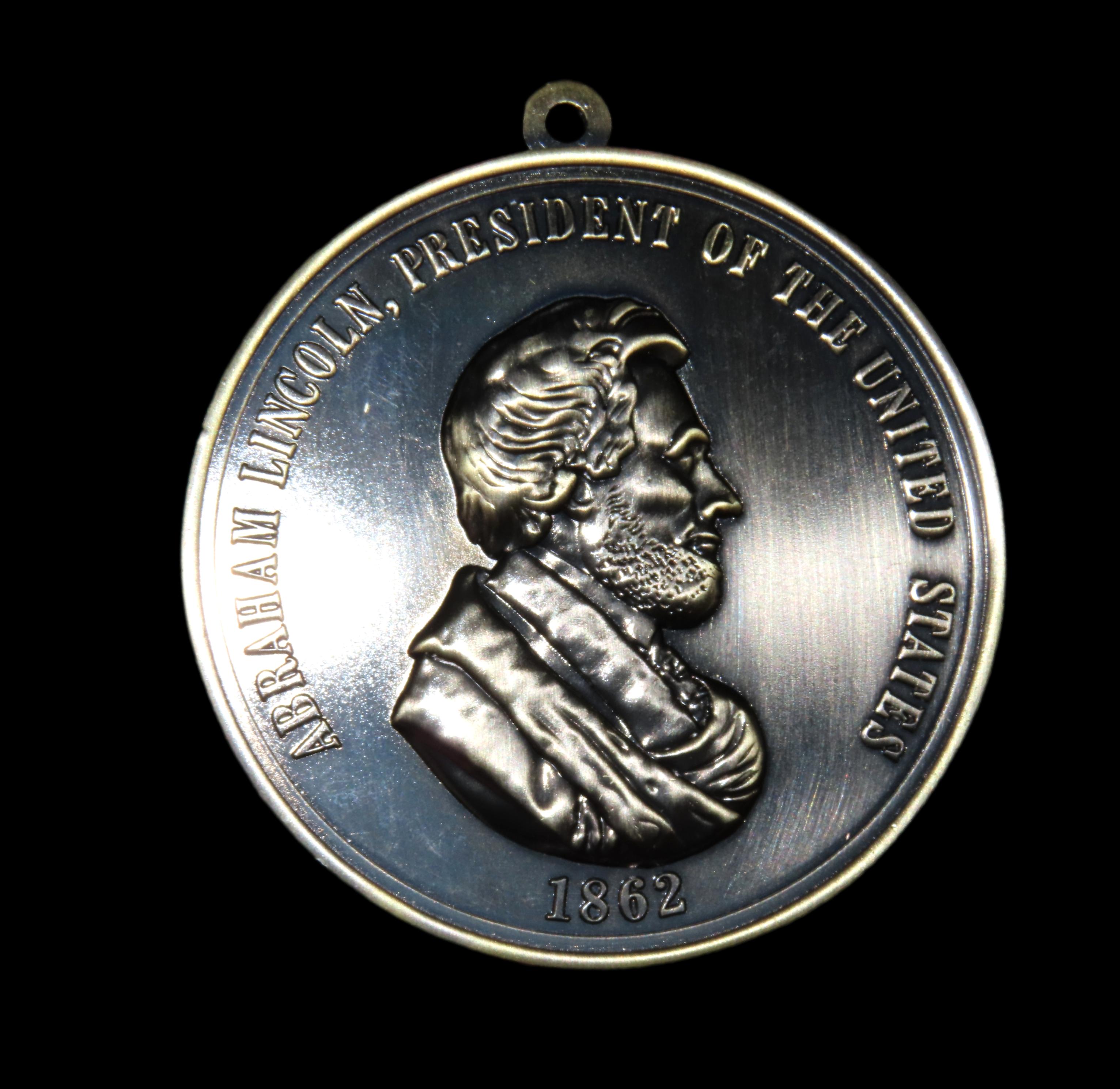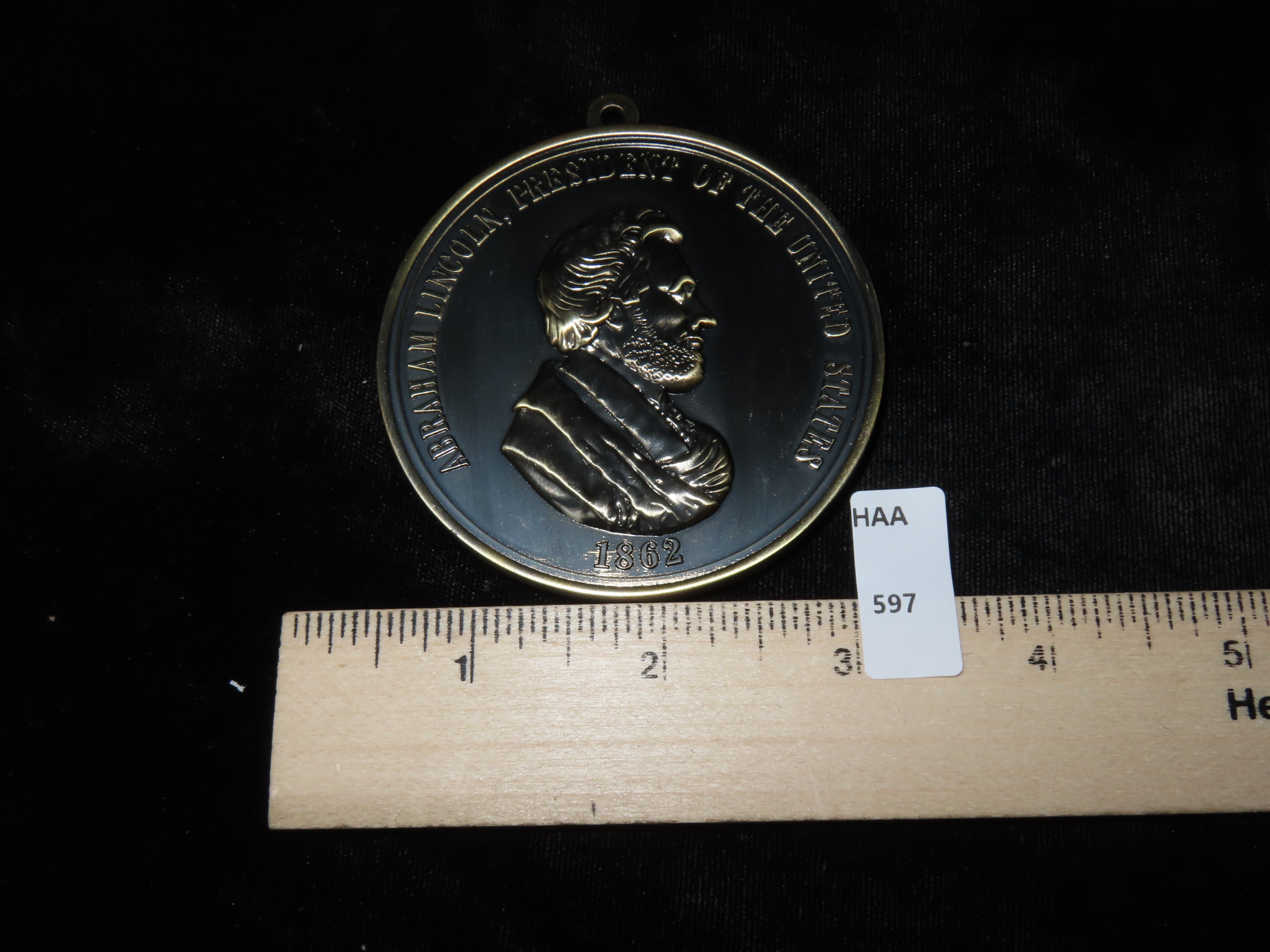 LARGE 2 7/8″ PRESIDENT LINCOLN INDIAN PEACE MEDAL, VINTAGE COMMEMORATIVE EXAMPLE DATED 1862