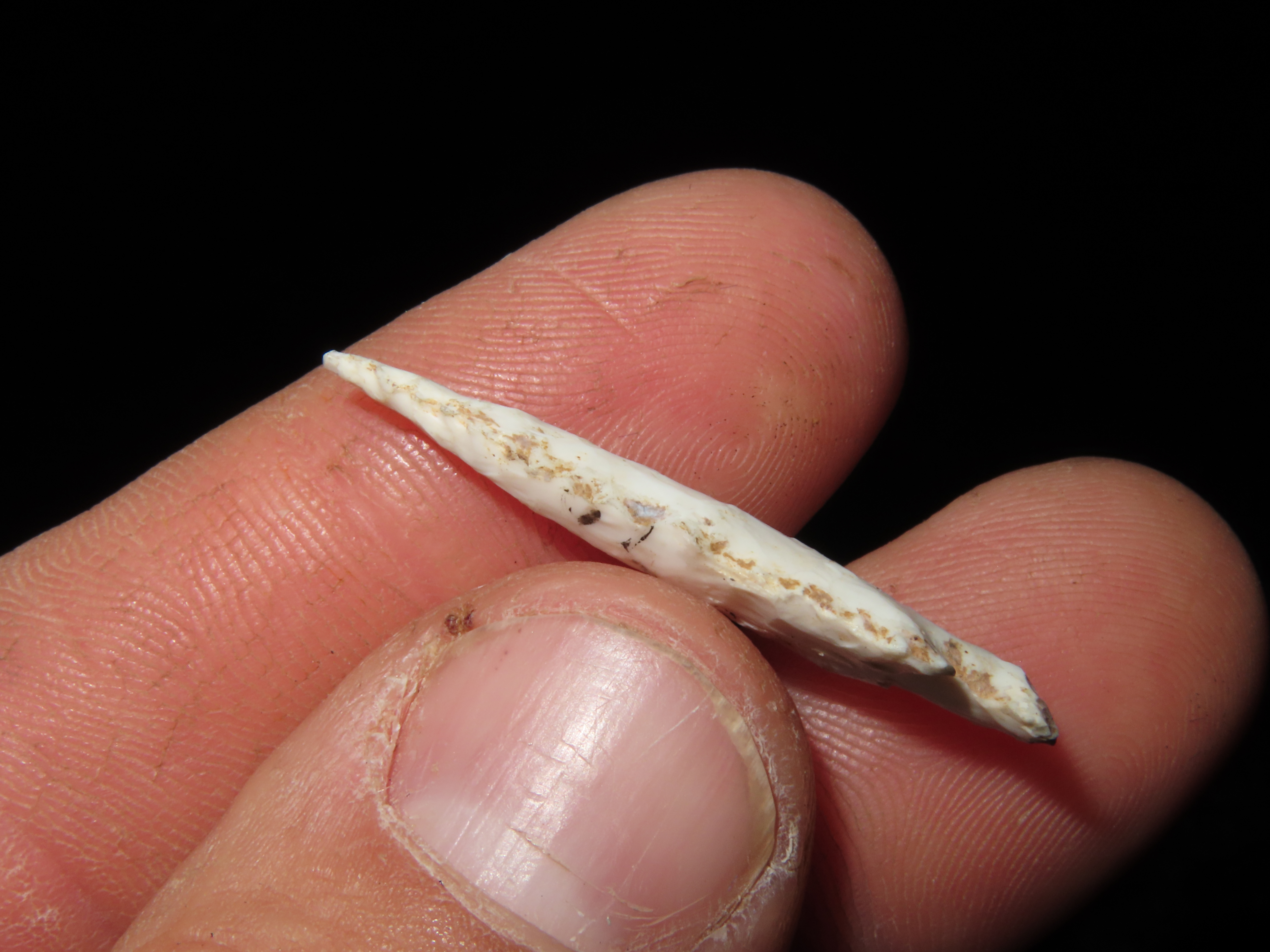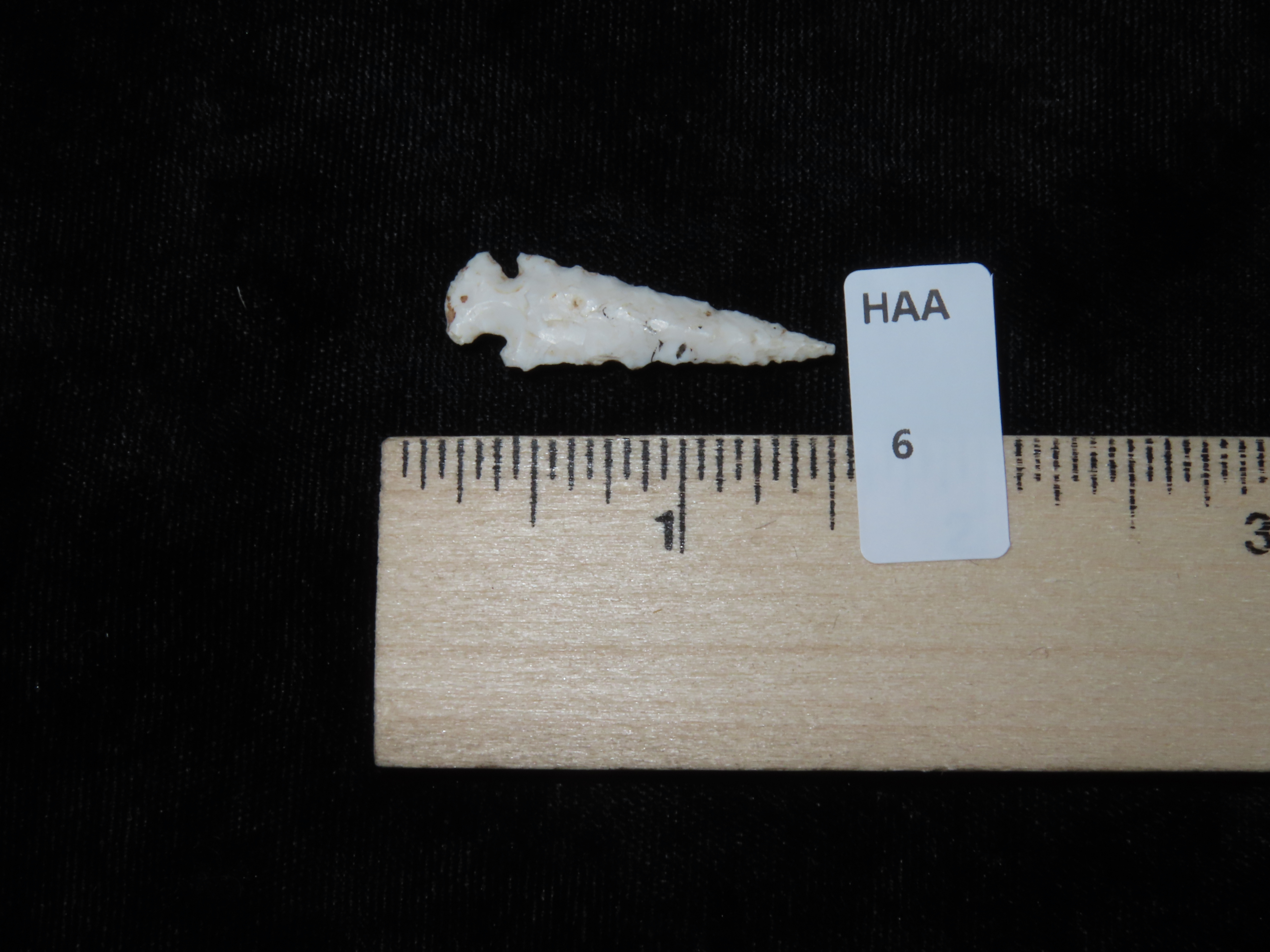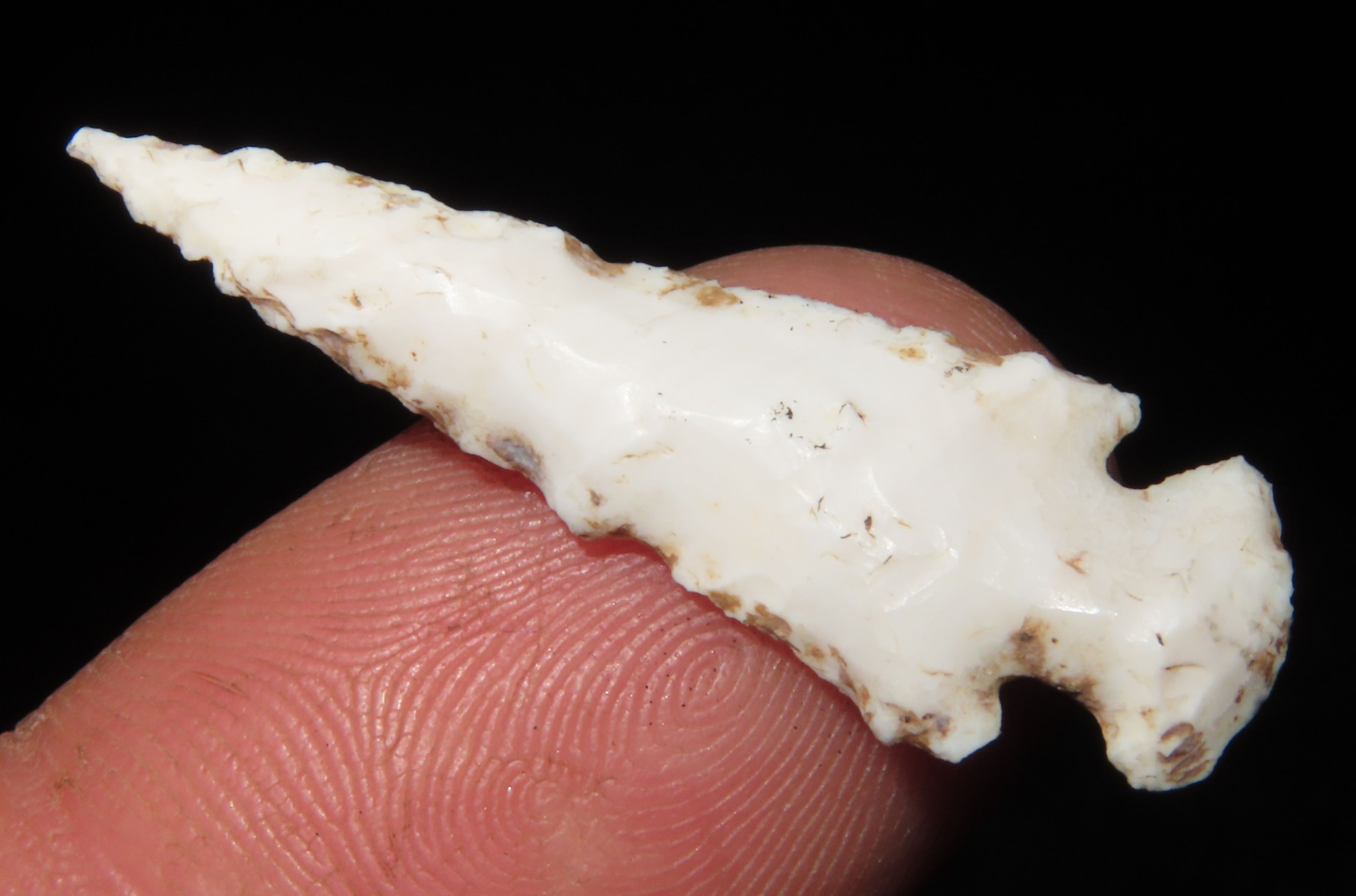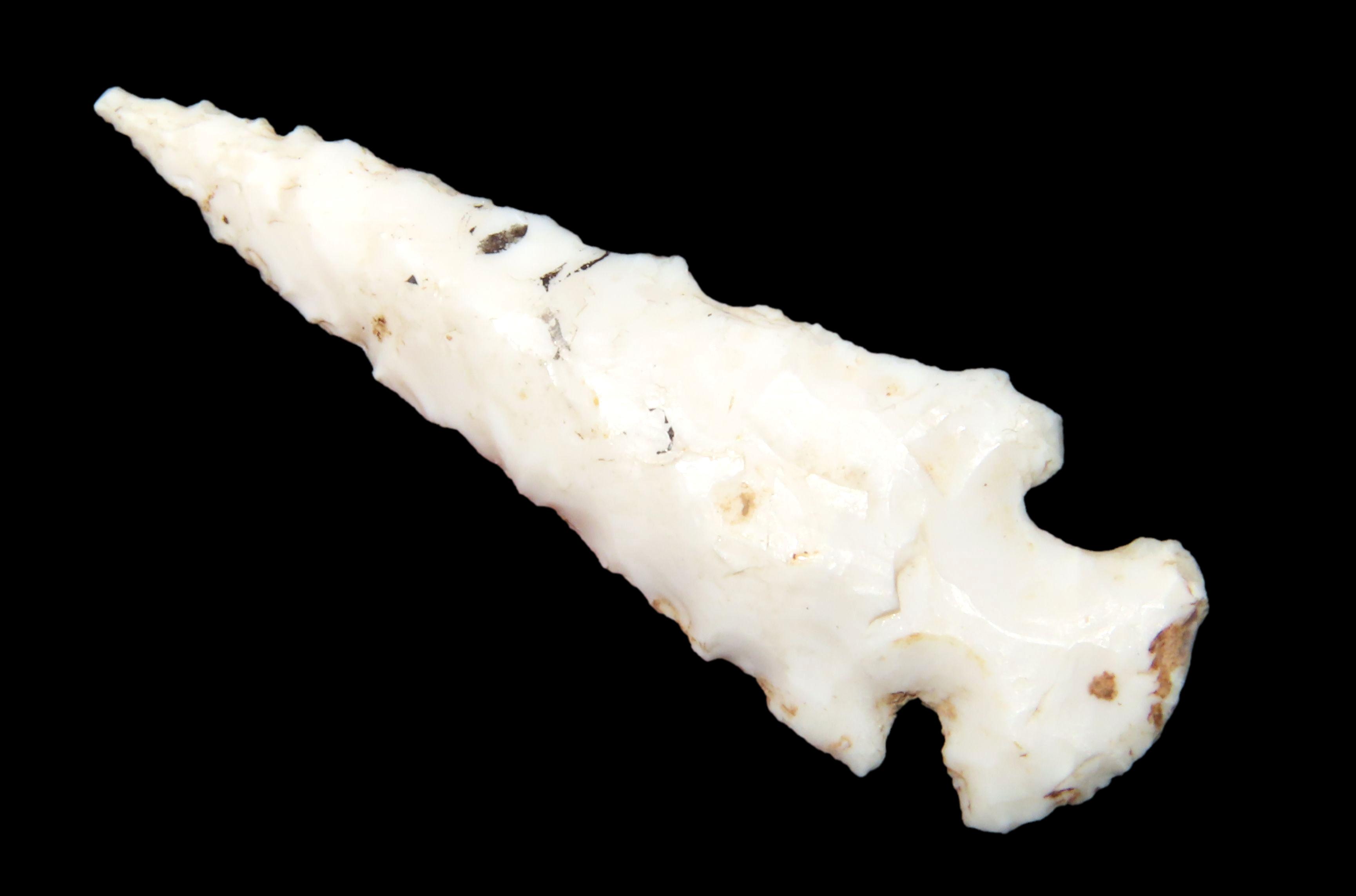 1 3/8″ INCREDIBLE SCALLORN BIRD POINT FOUND IN MADISON COUNTY ILLINOIS, AMAZING EXAMPLE, VERY WELL FLAKED WITH NICE PATINA, INDIAN ARROWHEAD