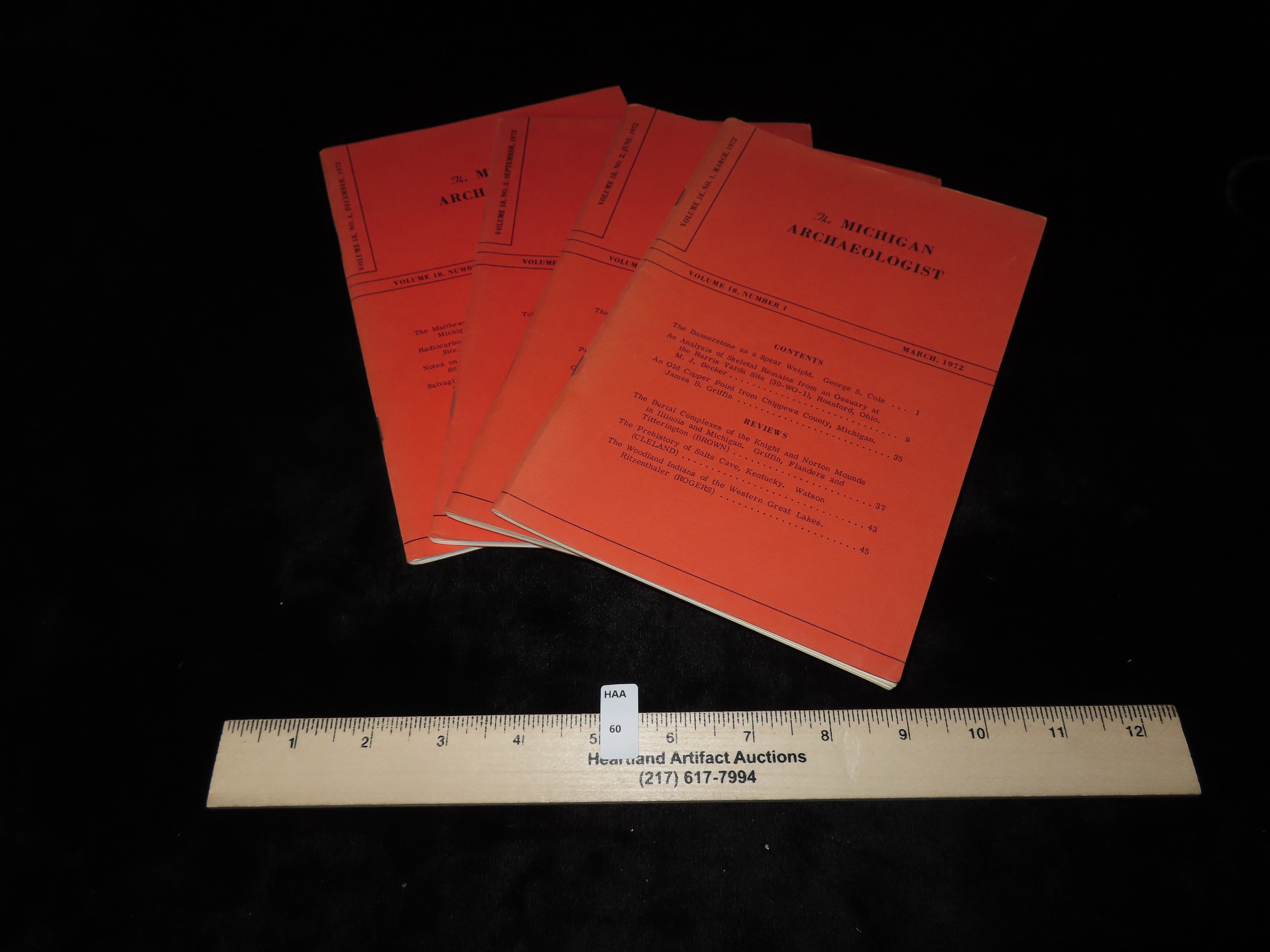 COMPLETE SET OF MICHIGAN ARCHAEOLOGIST JOURNALS FROM 1972, ARTICLES/PICS ON ARROWHEADS, AXES, CELTS, POTTERY, FUR TRADE RELICS, ETC.