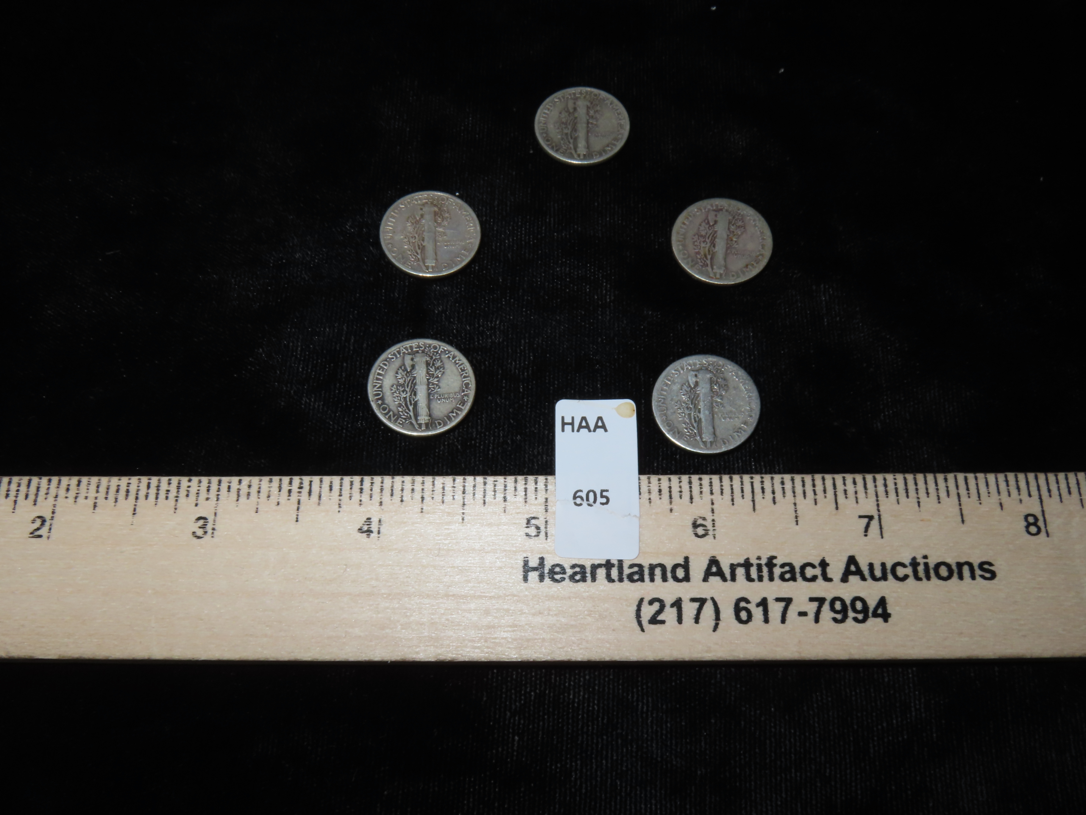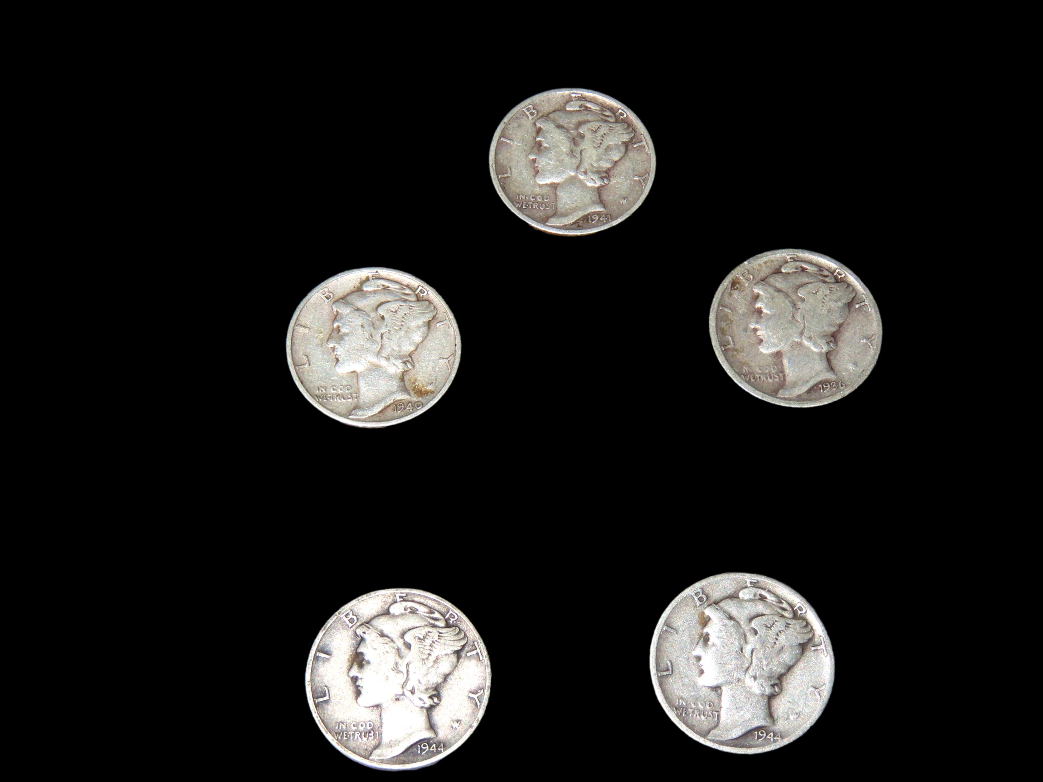 LOT OF 5 MERCURY DIMES FROM THE 1930’S & 1940’S, ALL DIFFERENT DATES AND VARIOUS MINT MARKS AS WELL