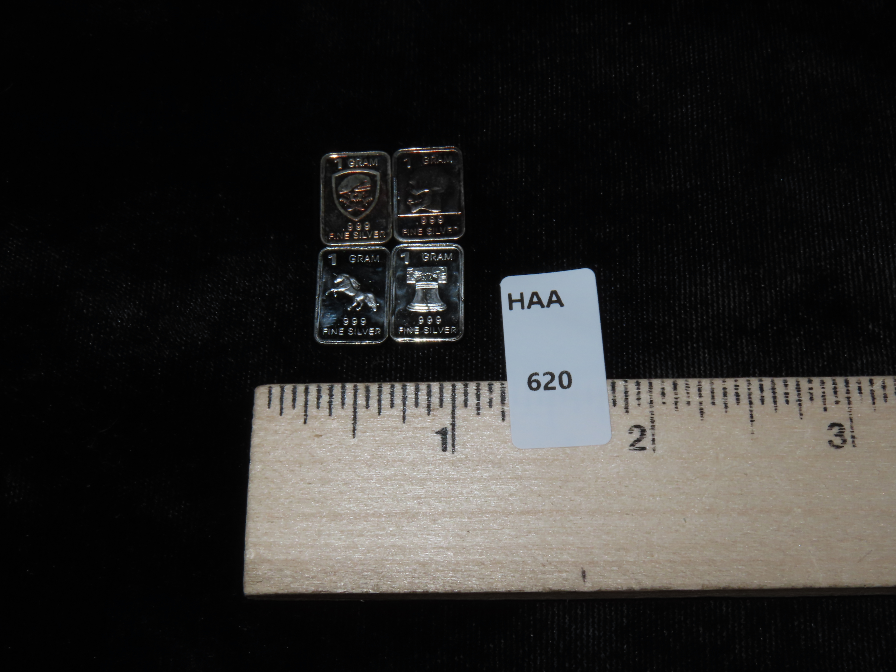 LOT OF 4 MINI SOLID SILVER BARS, 1 GRAM EACH, SILVER BULLION