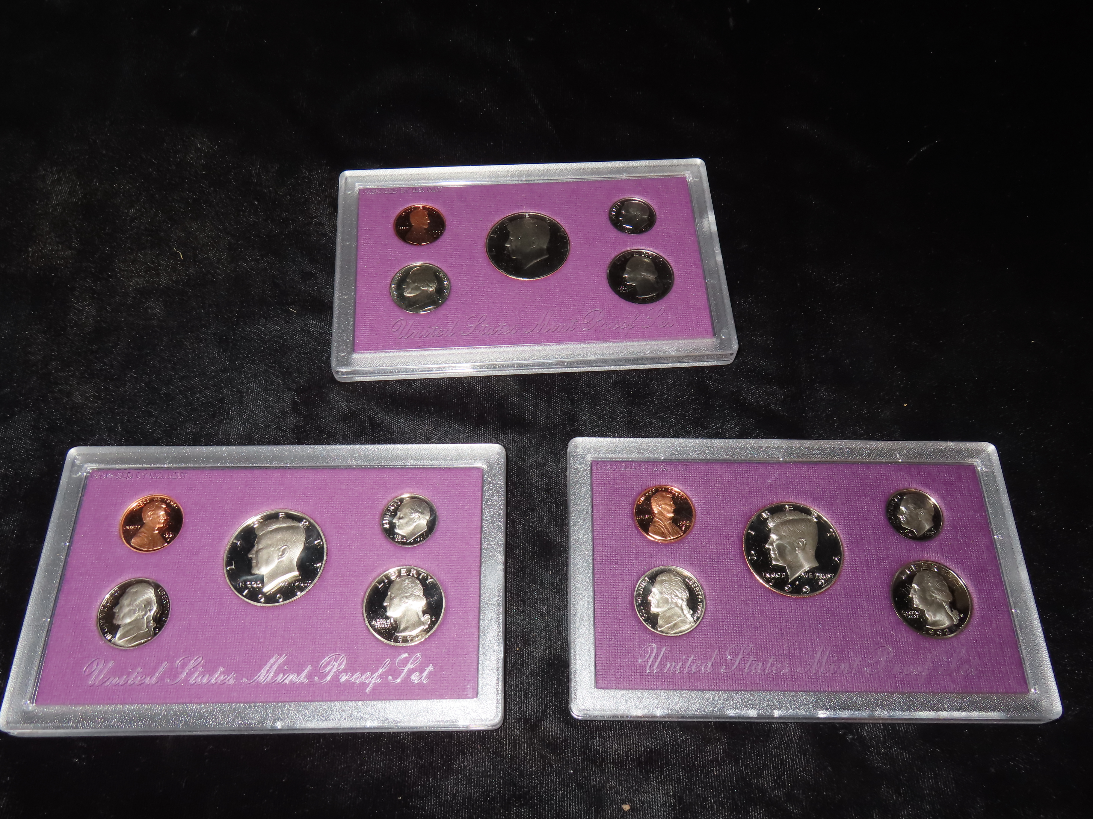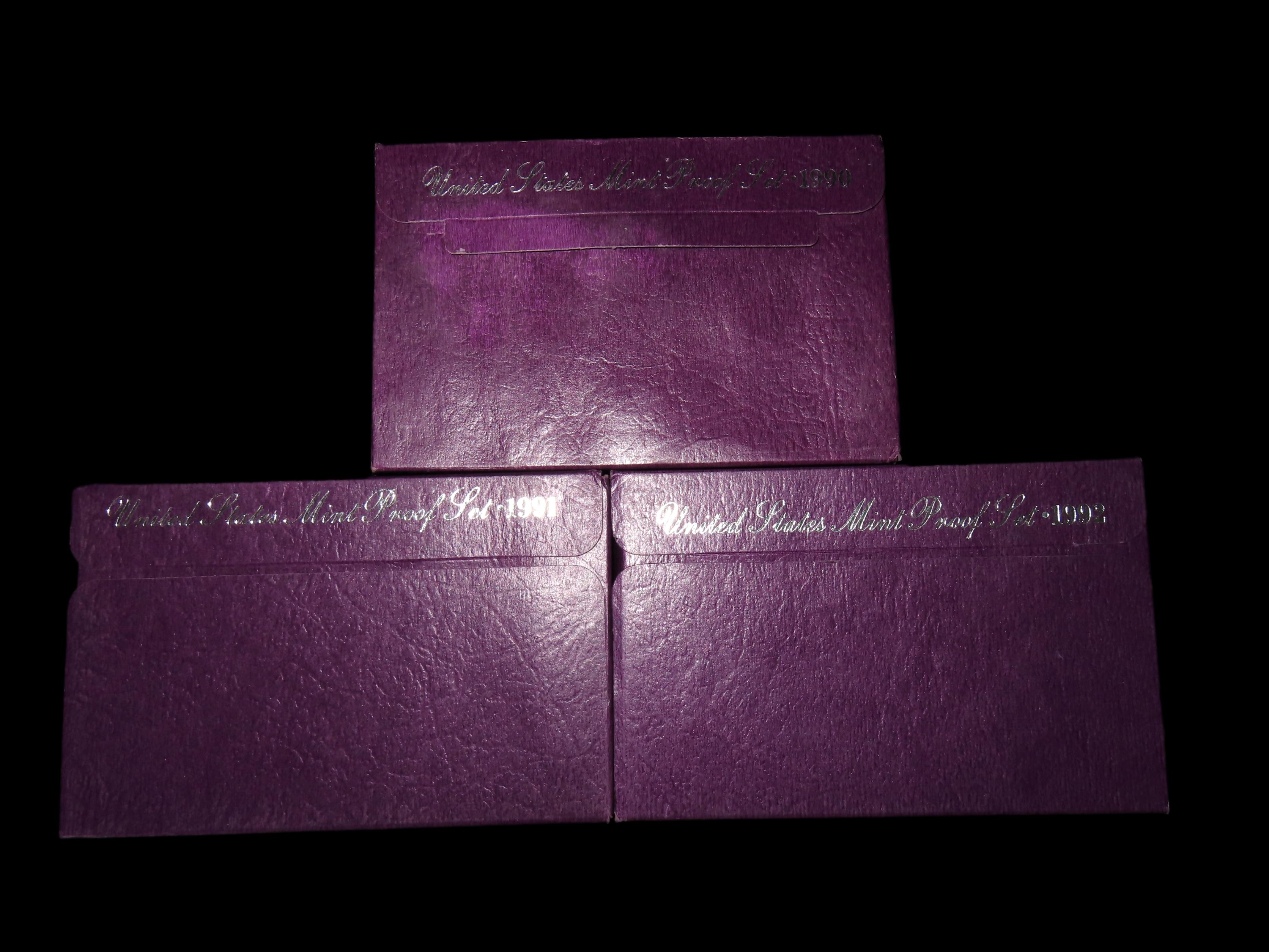LOT OF 3 US PROOF SETS, 1990, 1991, & 1992, 15 TOTAL COINS ALL IN ORIGINAL SEALED HOUSING BY THE UNITED STATES MINT, WITH ORIGINAL BOXES TOO