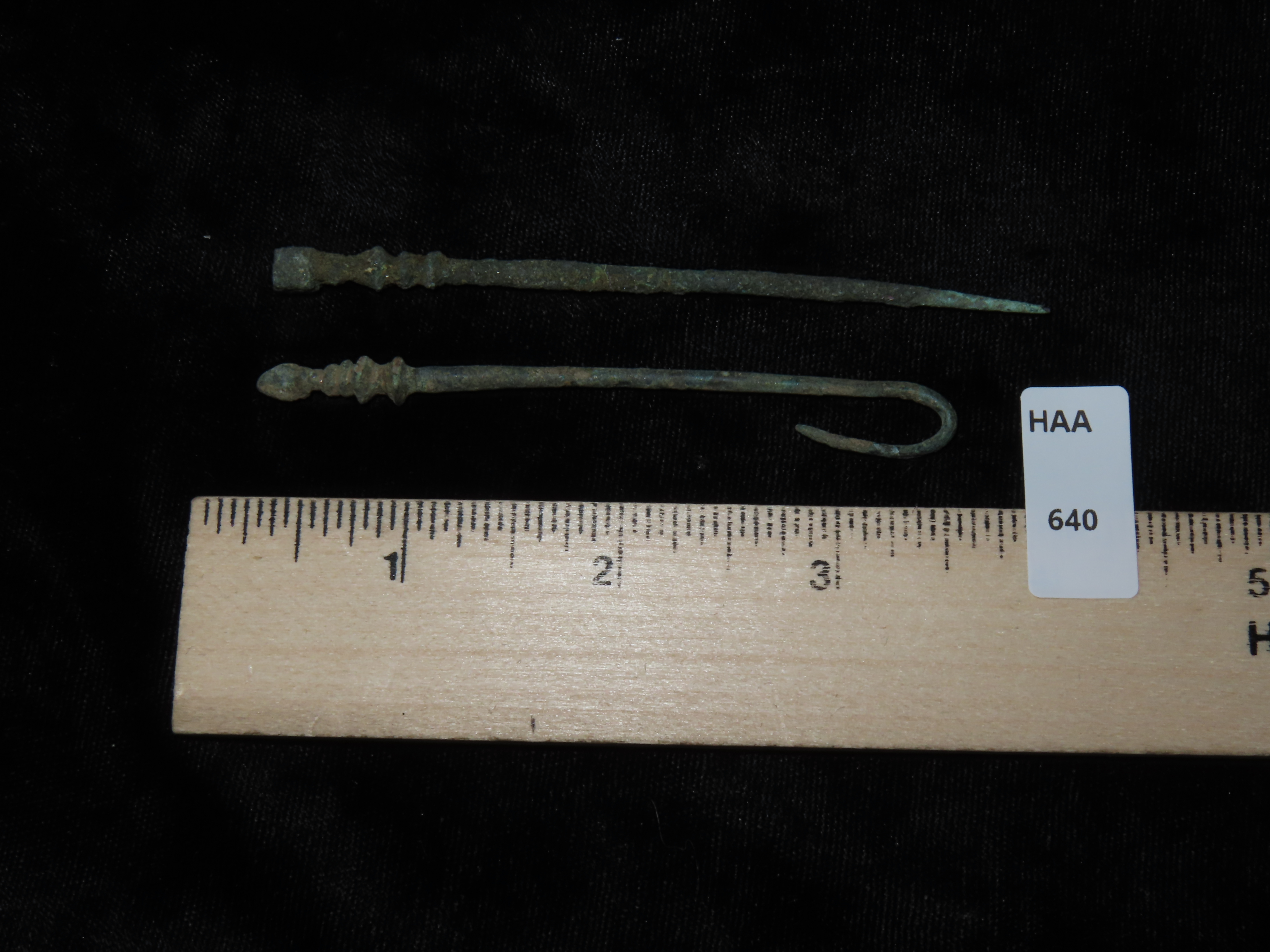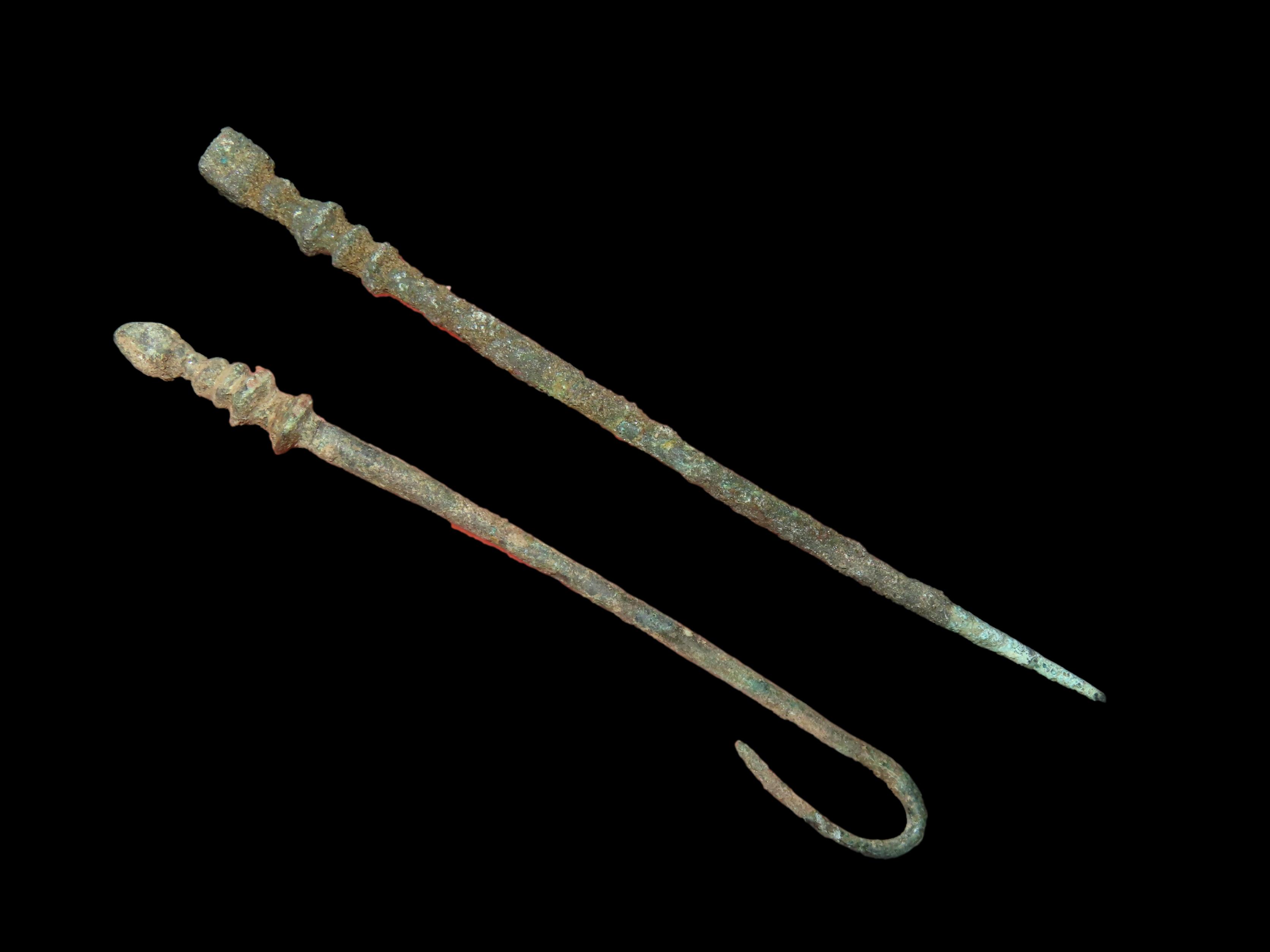 PAIR OF ANCIENT ROMAN VIKING BRONZE AGE HAIRPINS, AWLS, NEEDLES, NICE DECORATIVE TOPS, GREAT PATINA, ORIGINAL AUTHENTIC PERIOD RELICS