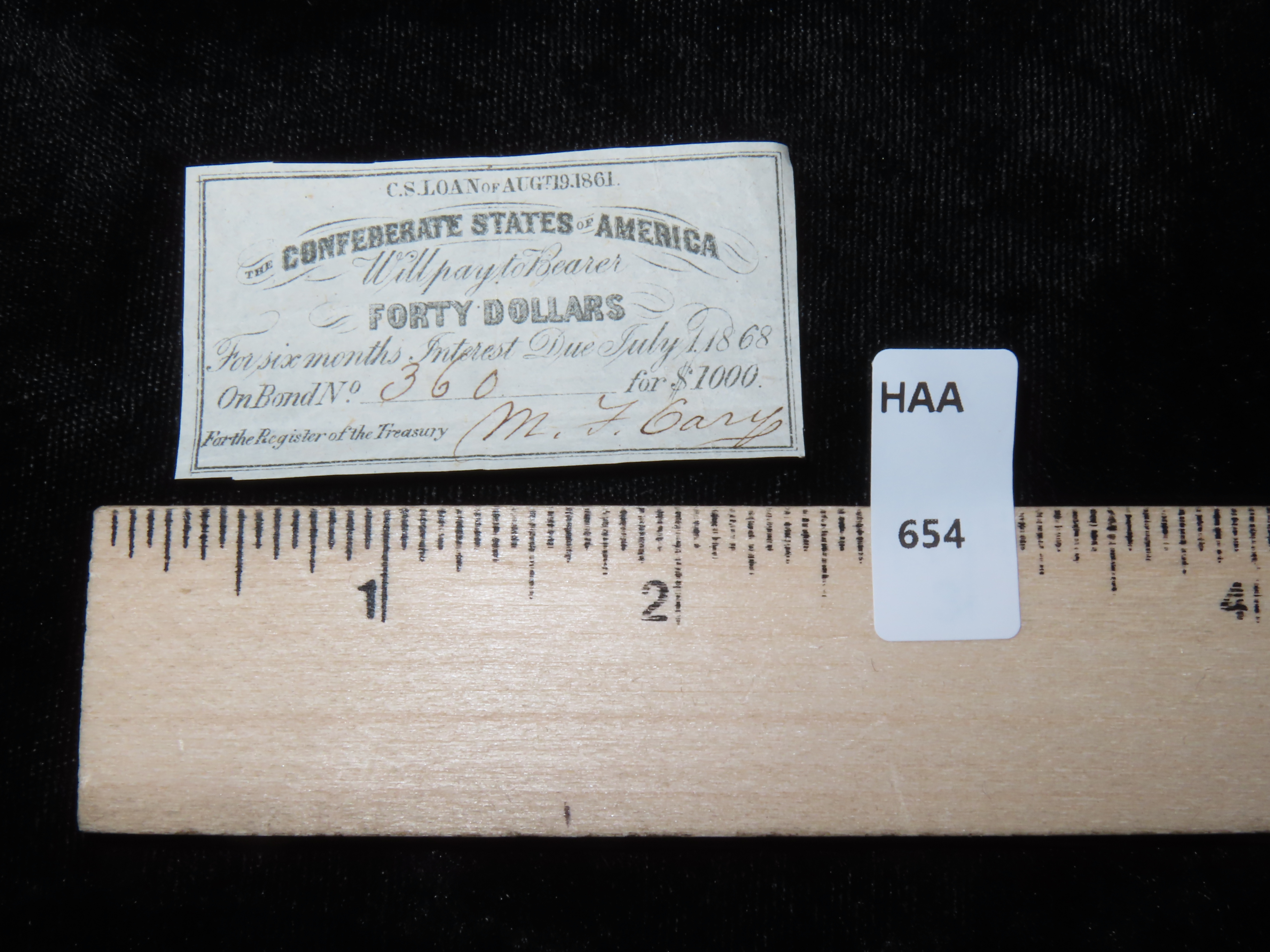 CIVIL WAR CONFEDERATE CURRENCY $40 BOND NOTE, DATED JULY 1ST, 1868, GREAT PIECE OF AMERICAN HISTORY