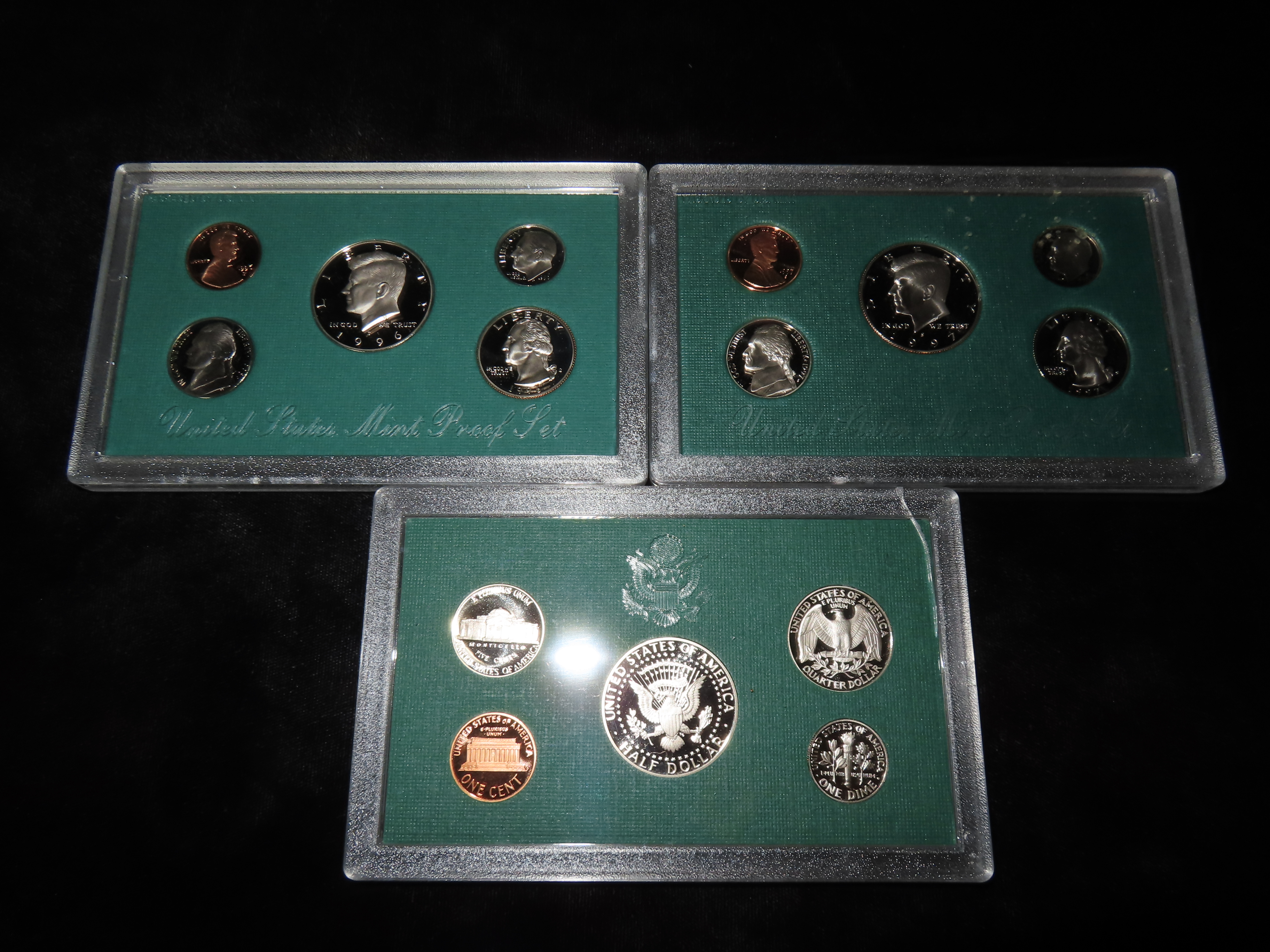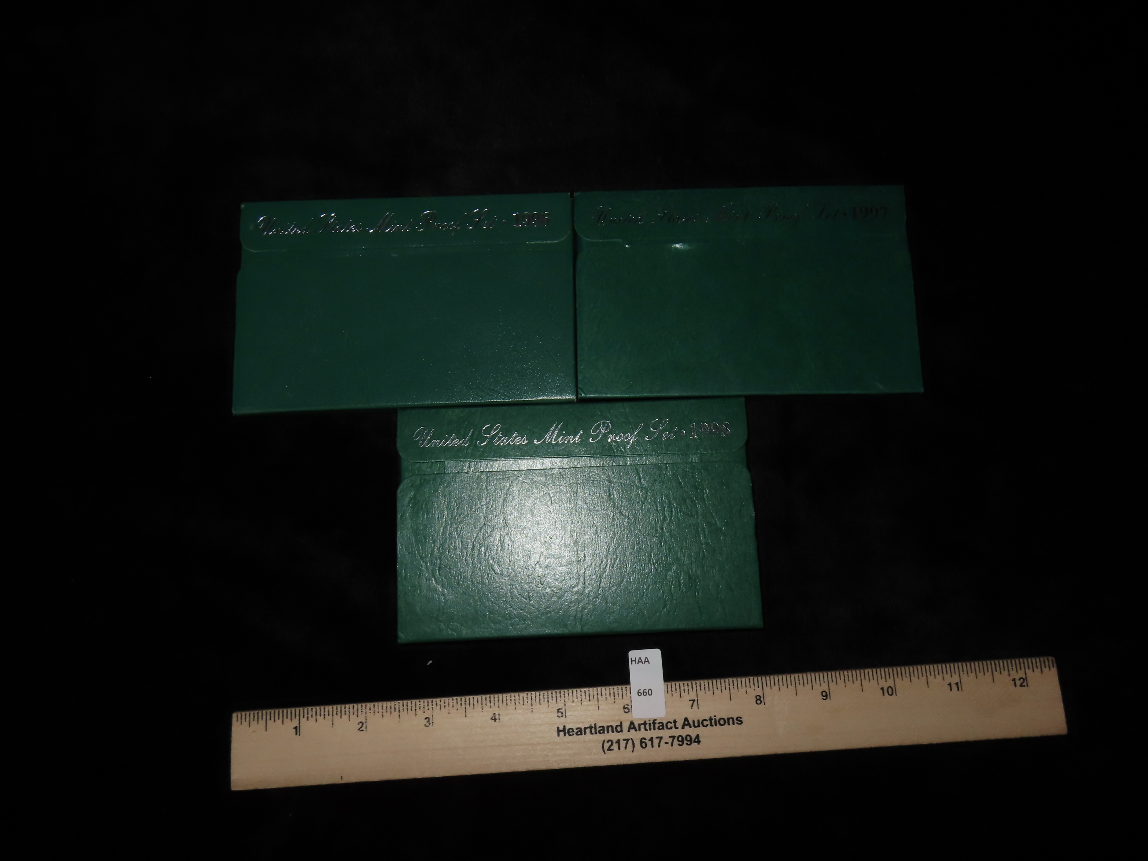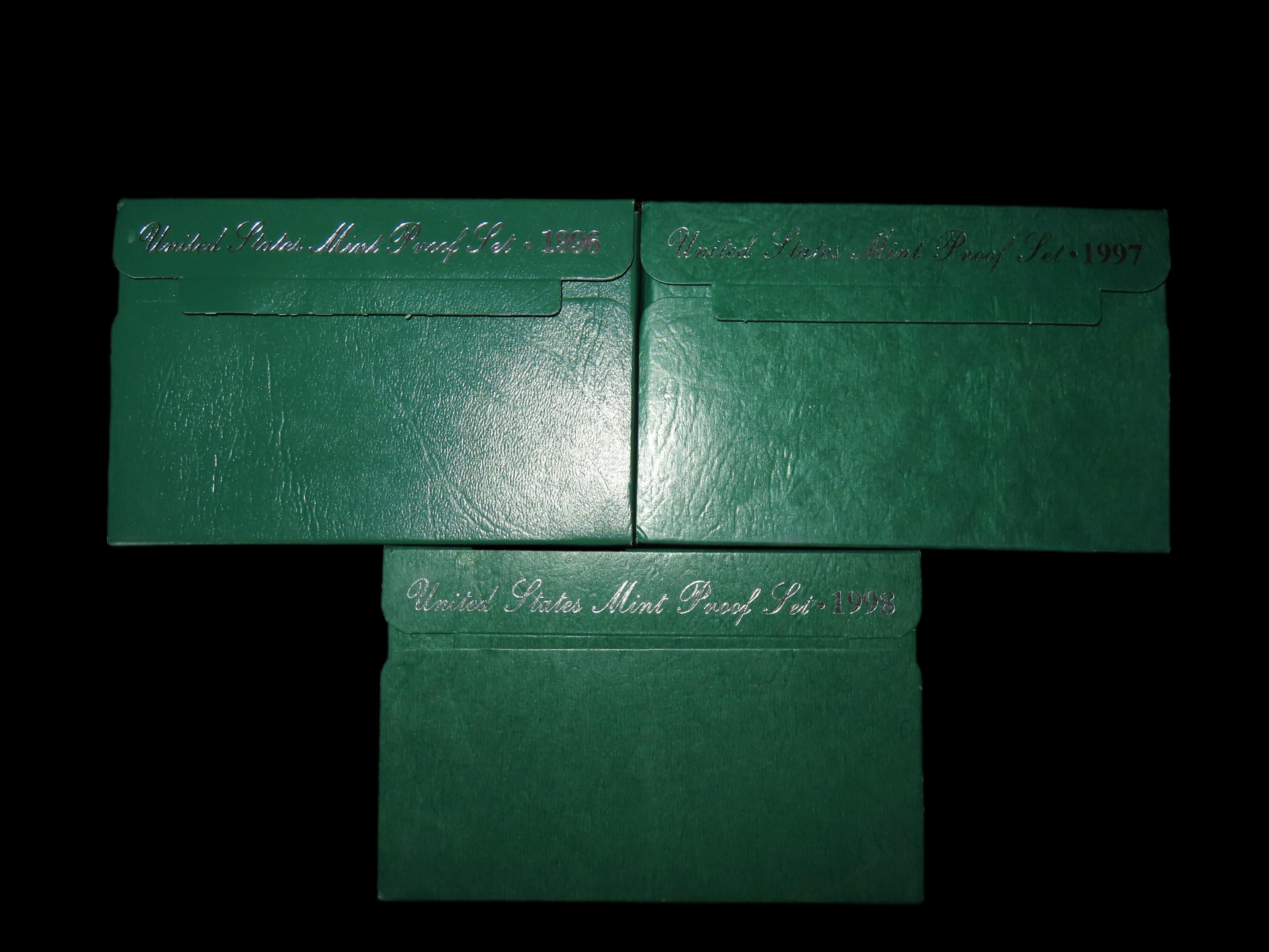 LOT OF 3 US PROOF SETS, 1996, 1997, & 1998, 15 TOTAL COINS ALL IN ORIGINAL SEALED HOUSING BY THE UNITED STATES MINT, WITH ORIGINAL BOXES TOO