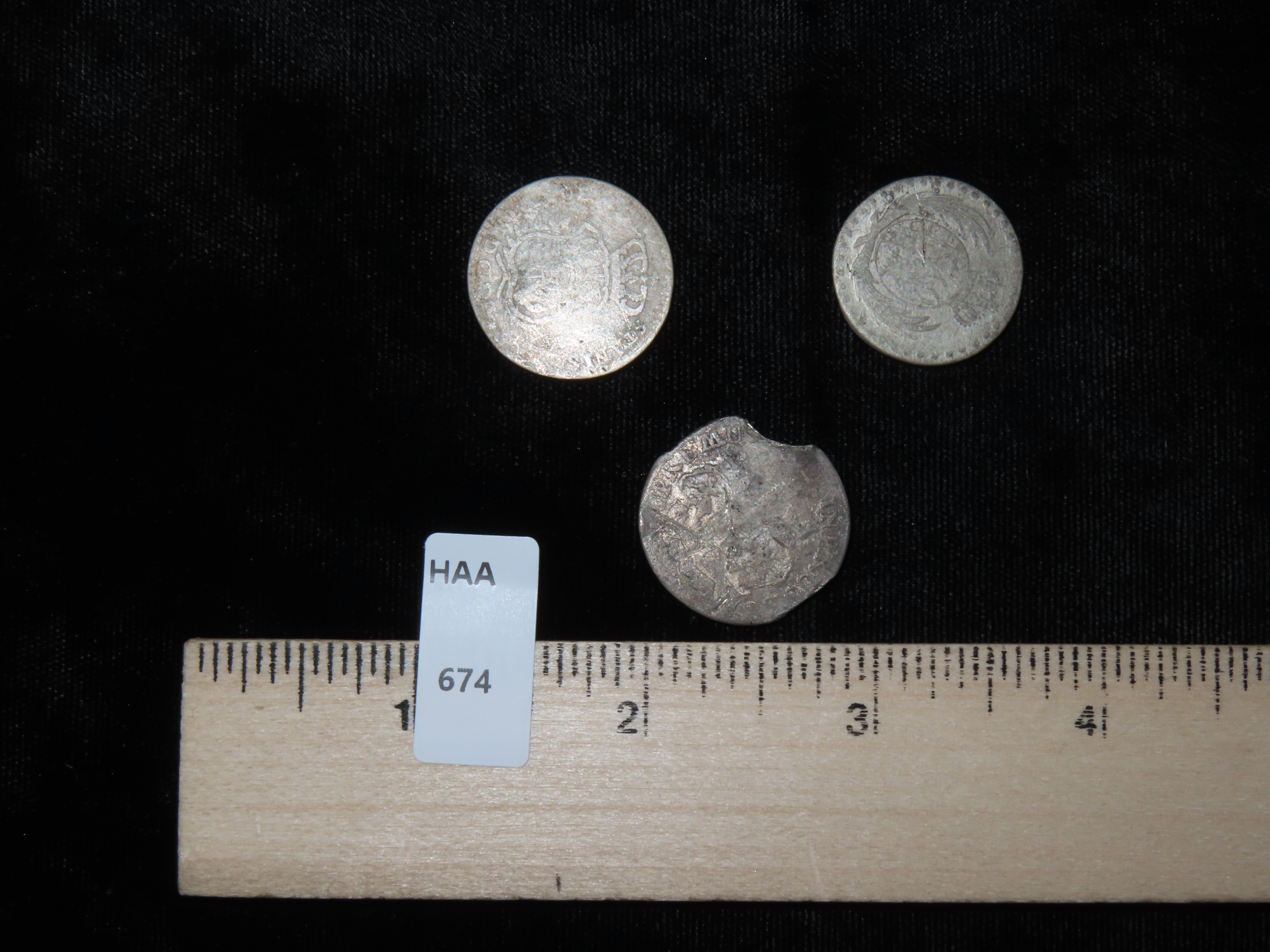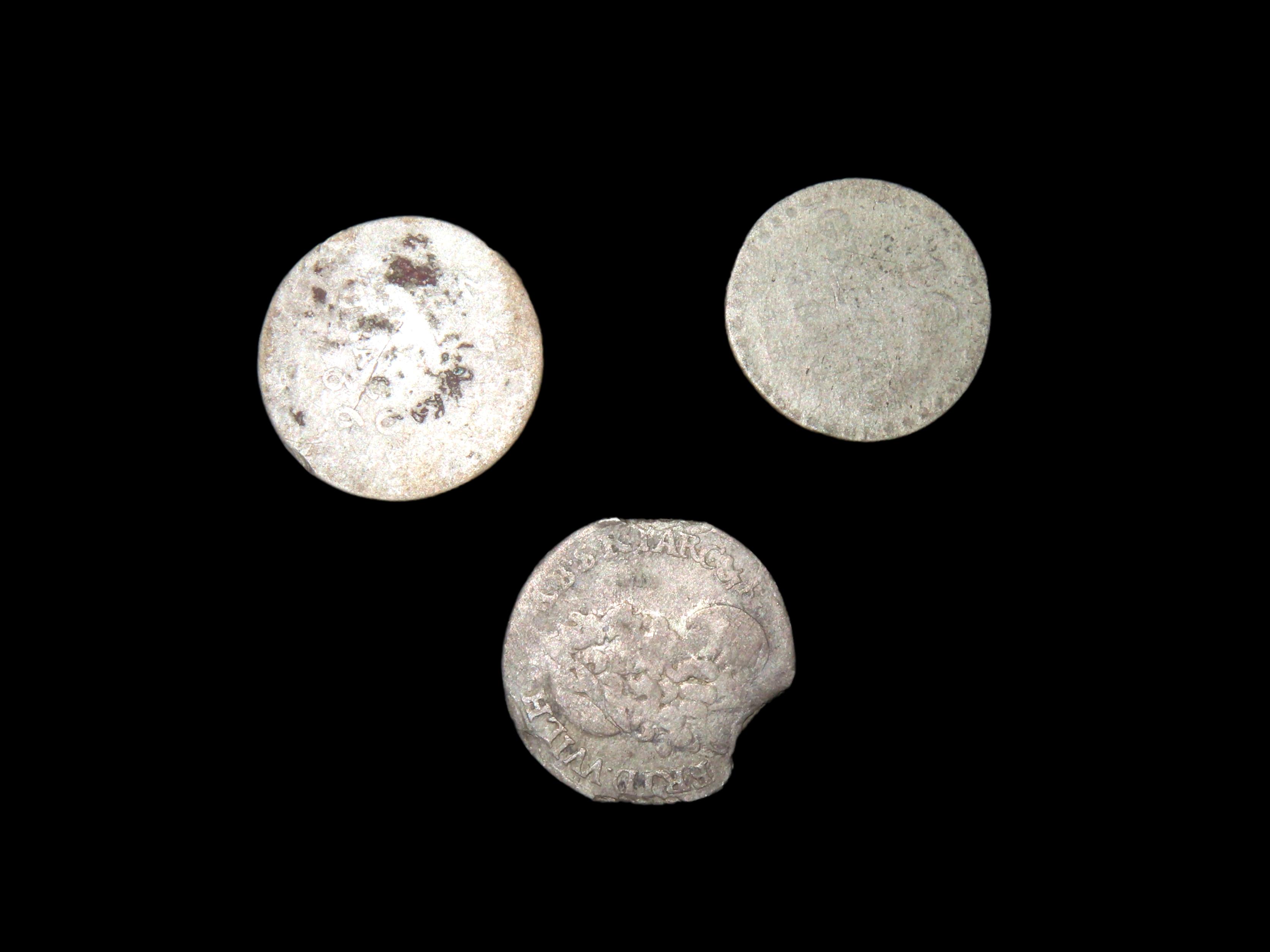 PAIR OF EARLY COLONIAL ERA SILVER COINS, ONE 1600’S & OTHER 1700’S, LOT OF WEAR, BUT MANY FEATURES STILL VISIBLE, VERY OLD CURRENCY