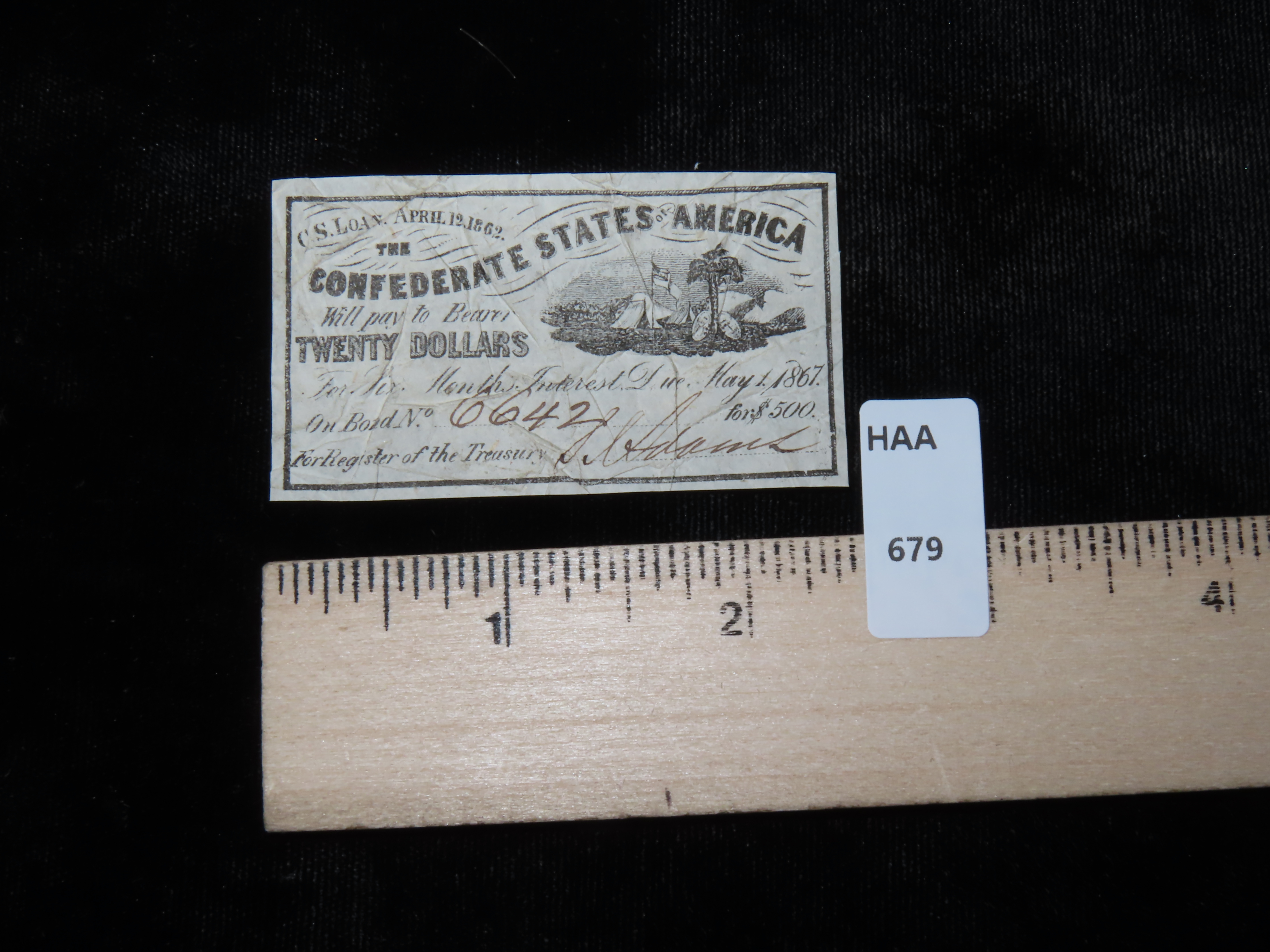 CIVIL WAR CONFEDERATE CURRENCY $20 BOND NOTE, DATED MAY 1, 1867, GREAT PIECE OF AMERICAN HISTORY