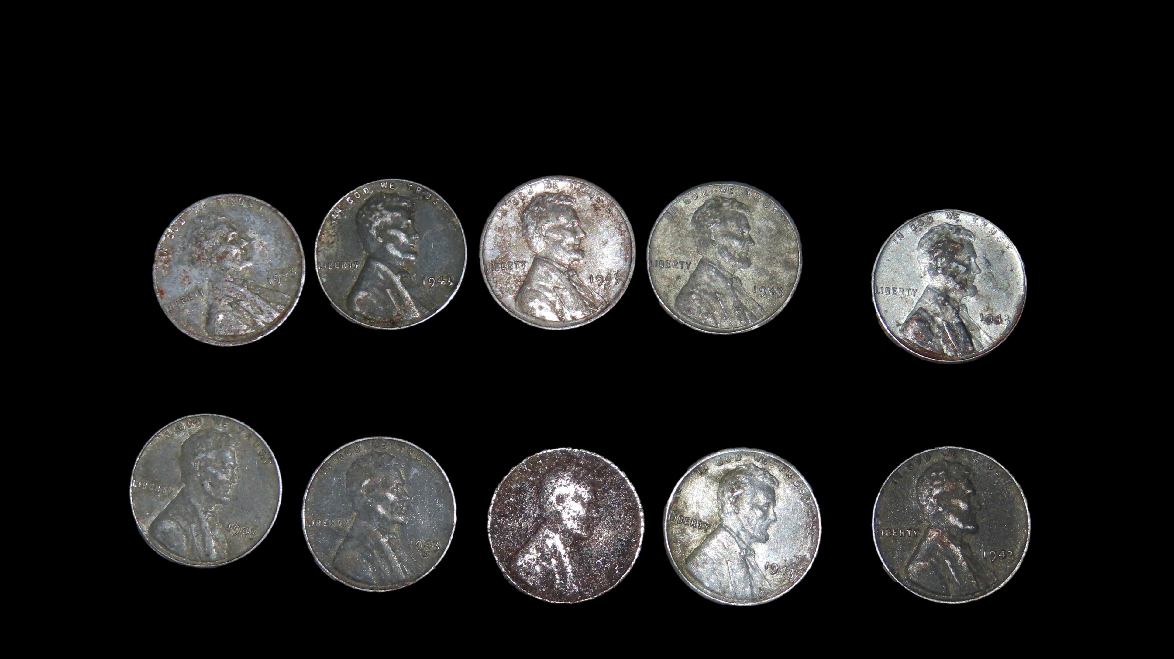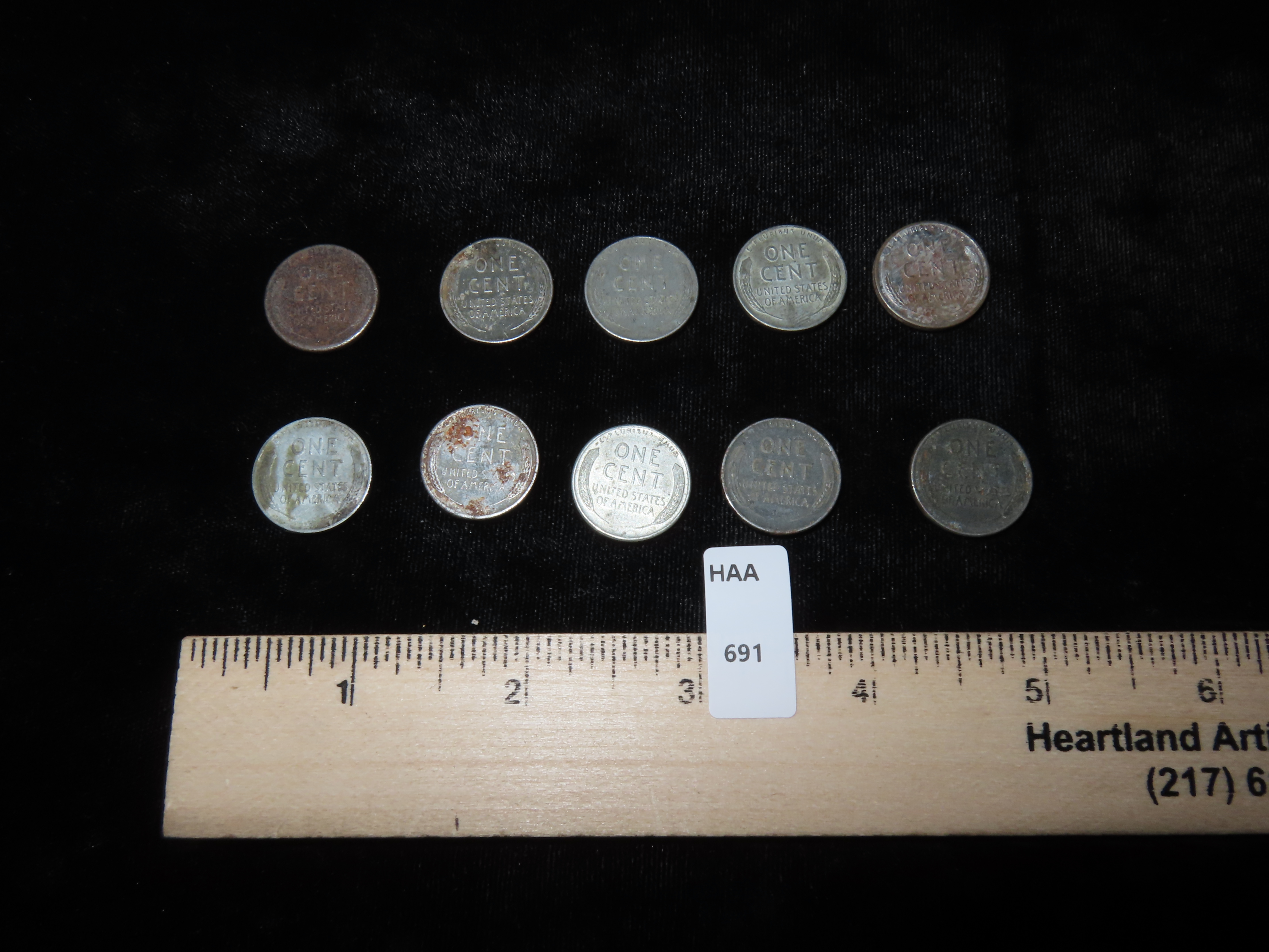 LOT OF 10 WWII ERA STEEL PUNNY, WHEAT PENNIES, LINCOLN CENT, 1943 DATED, ONLY MINTED FOR ONE YEAR!
