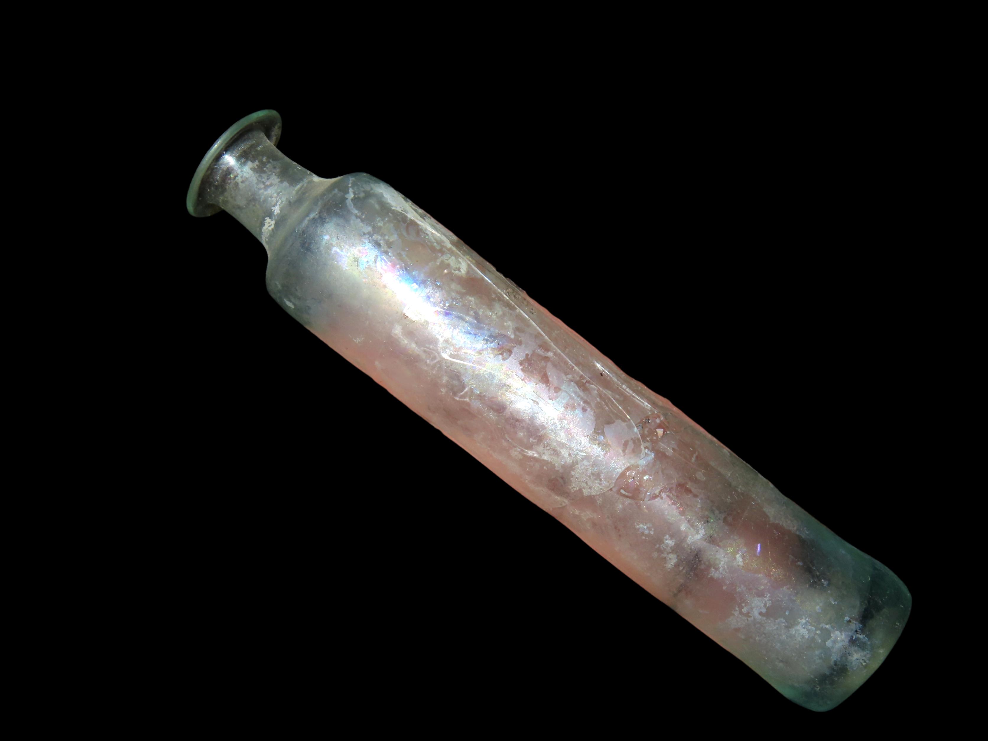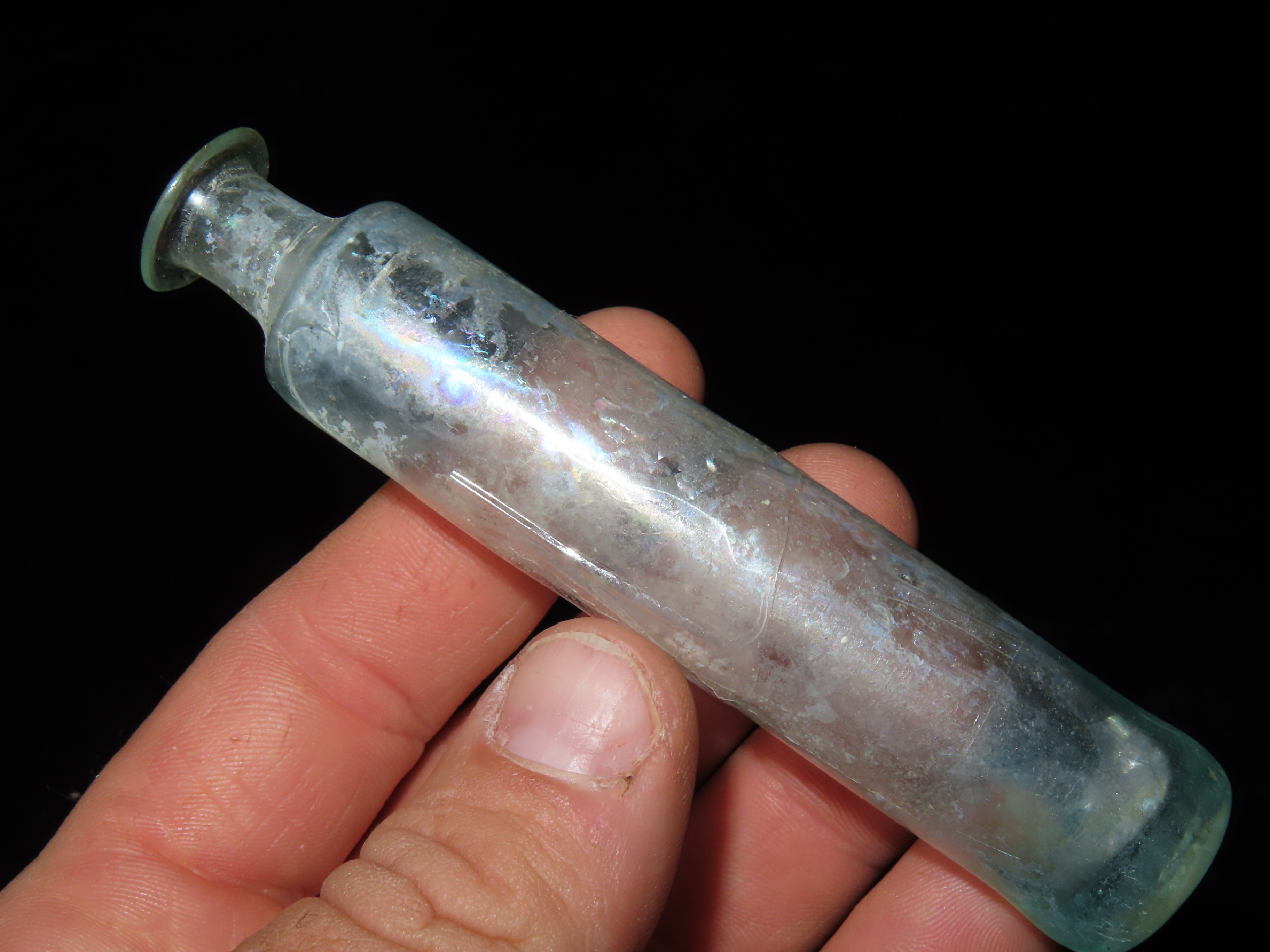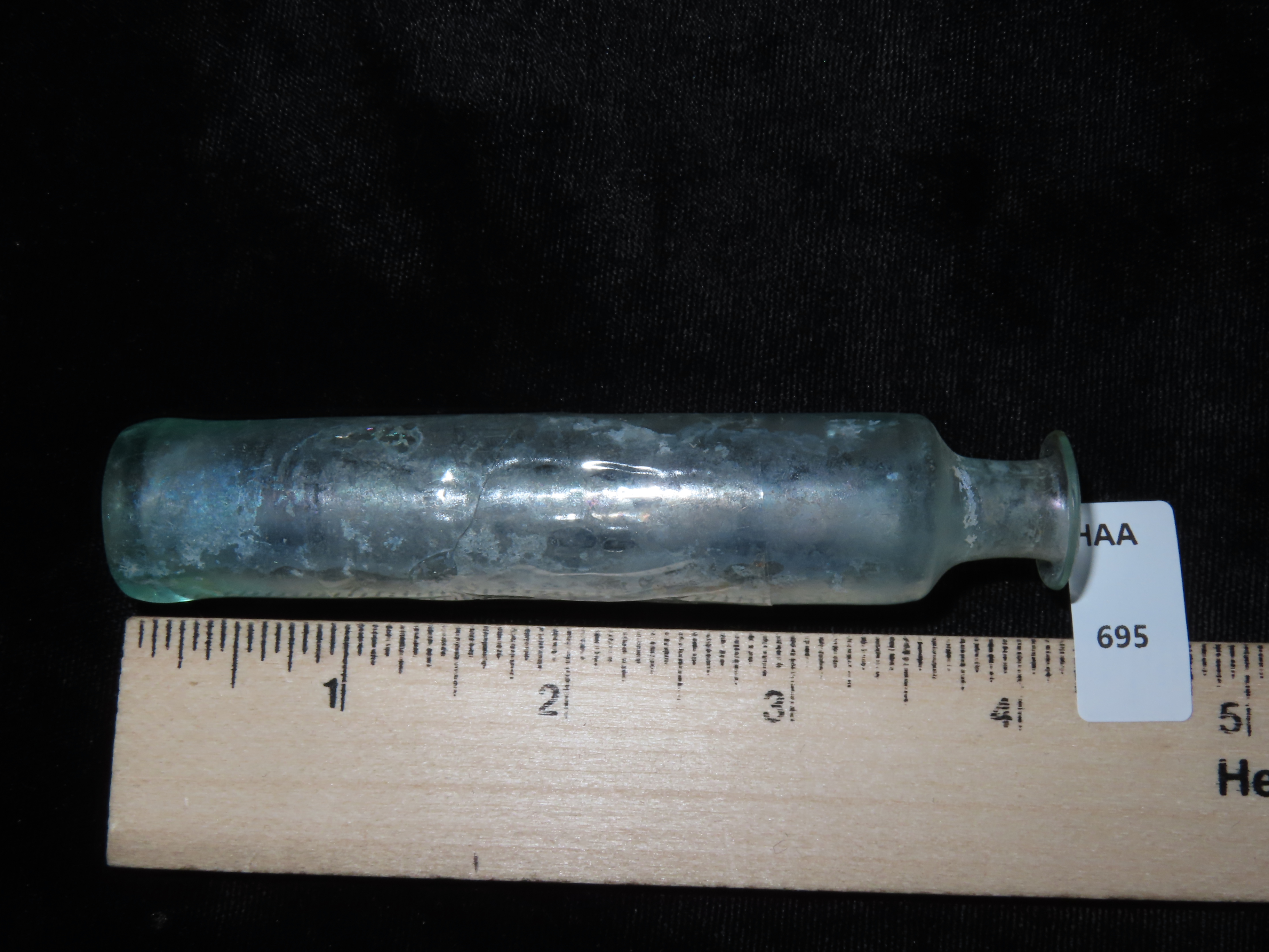 RARE CIVIL WAR HAND BLOWN GLASS MEDICINE VILE, JAR, BOTTLE, CRACKED AND TAPED TOGETHER, ORIGINAL AUTHENTIC PERIOD ITEM, CAMP DUG