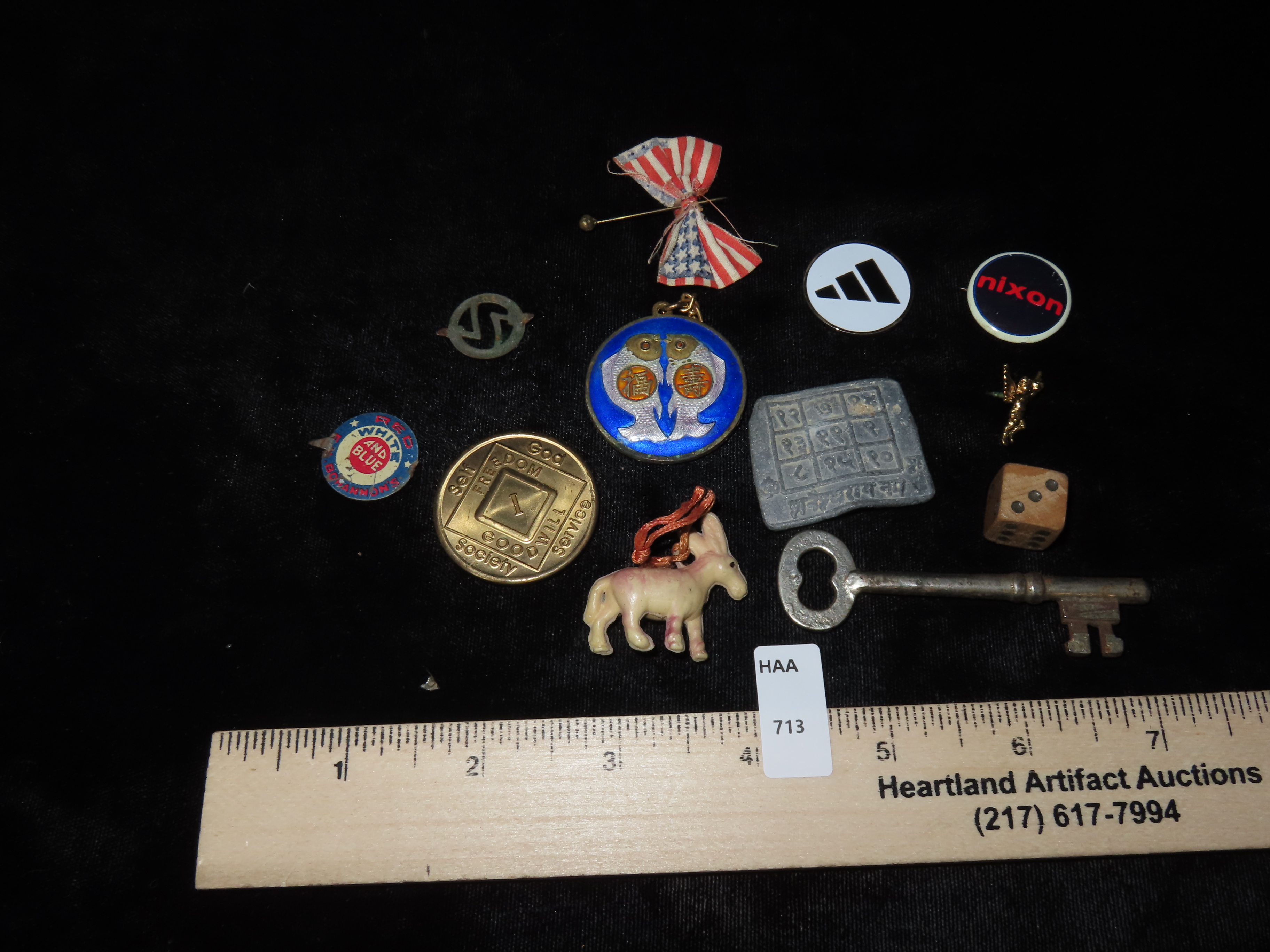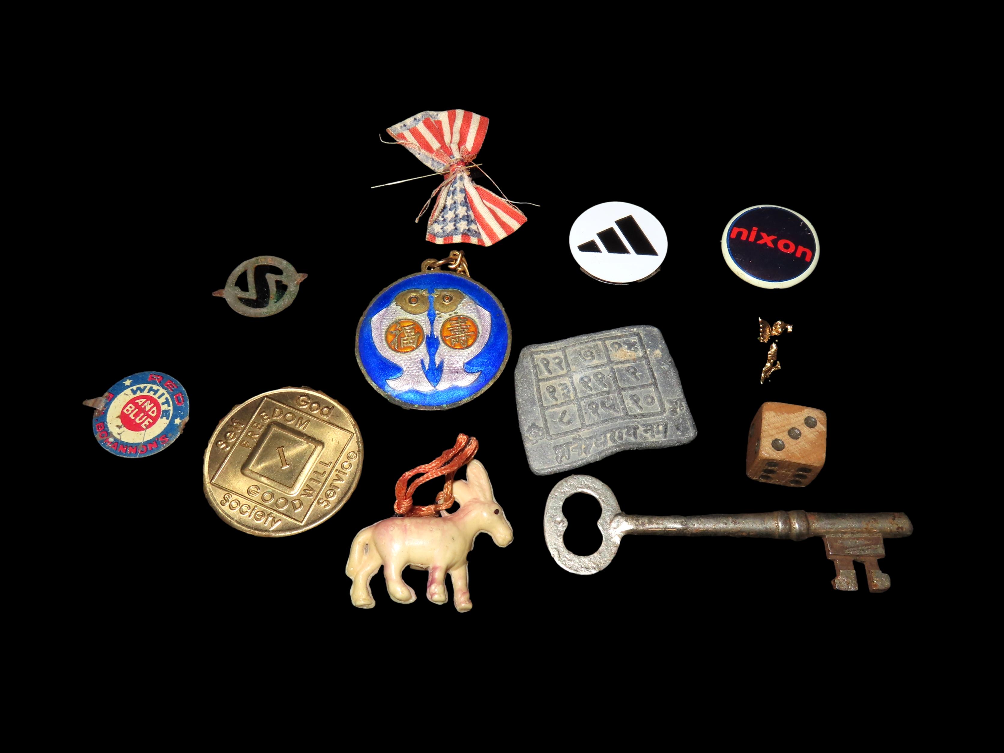 LOT OF VINTAGE & ANTIQUE PINS, BUTTONS, DICE, TOKENS, COINS, TOBACCO TAGS, POLITICAL, GAMBLING, JUNK DRAWER