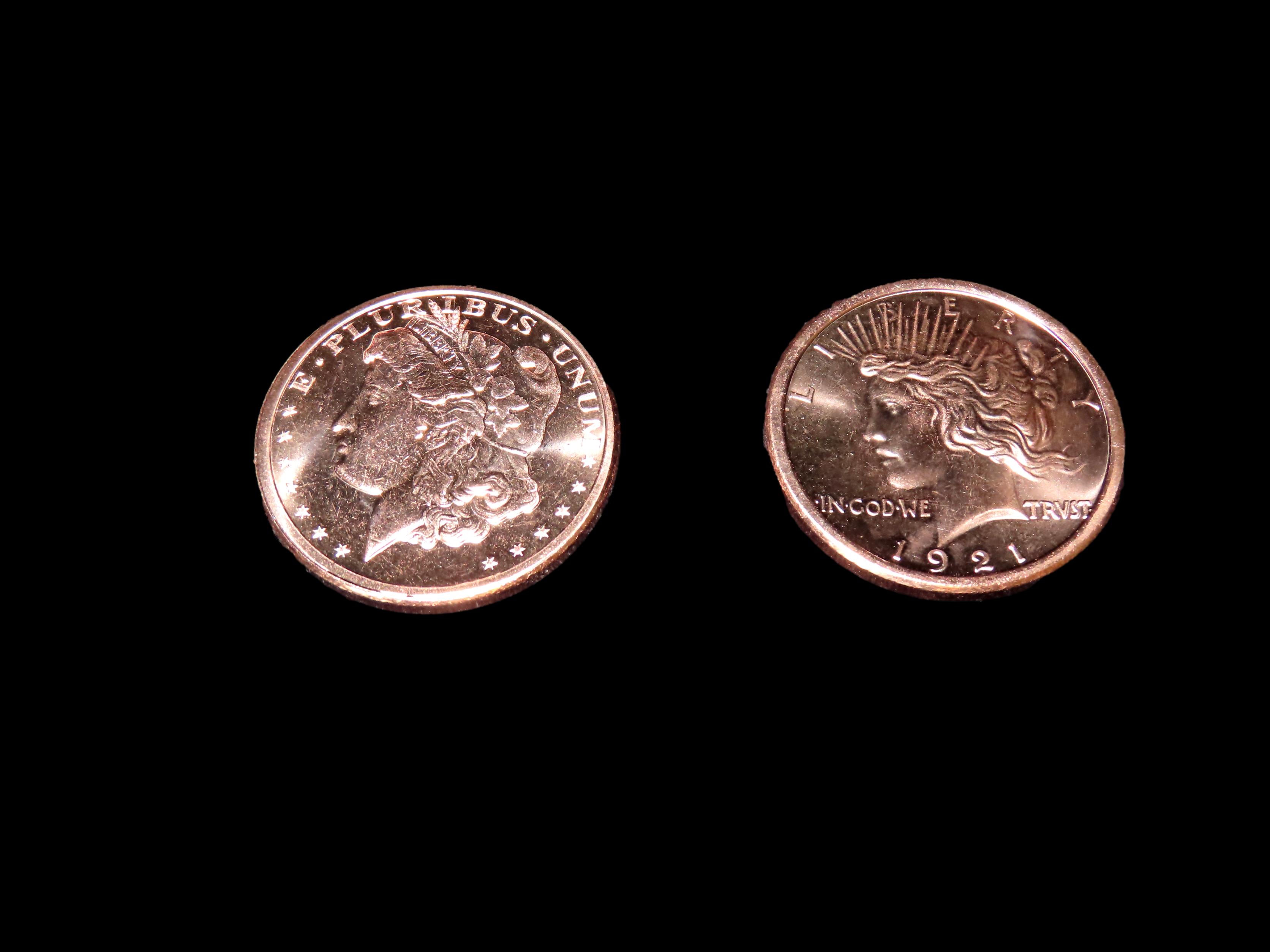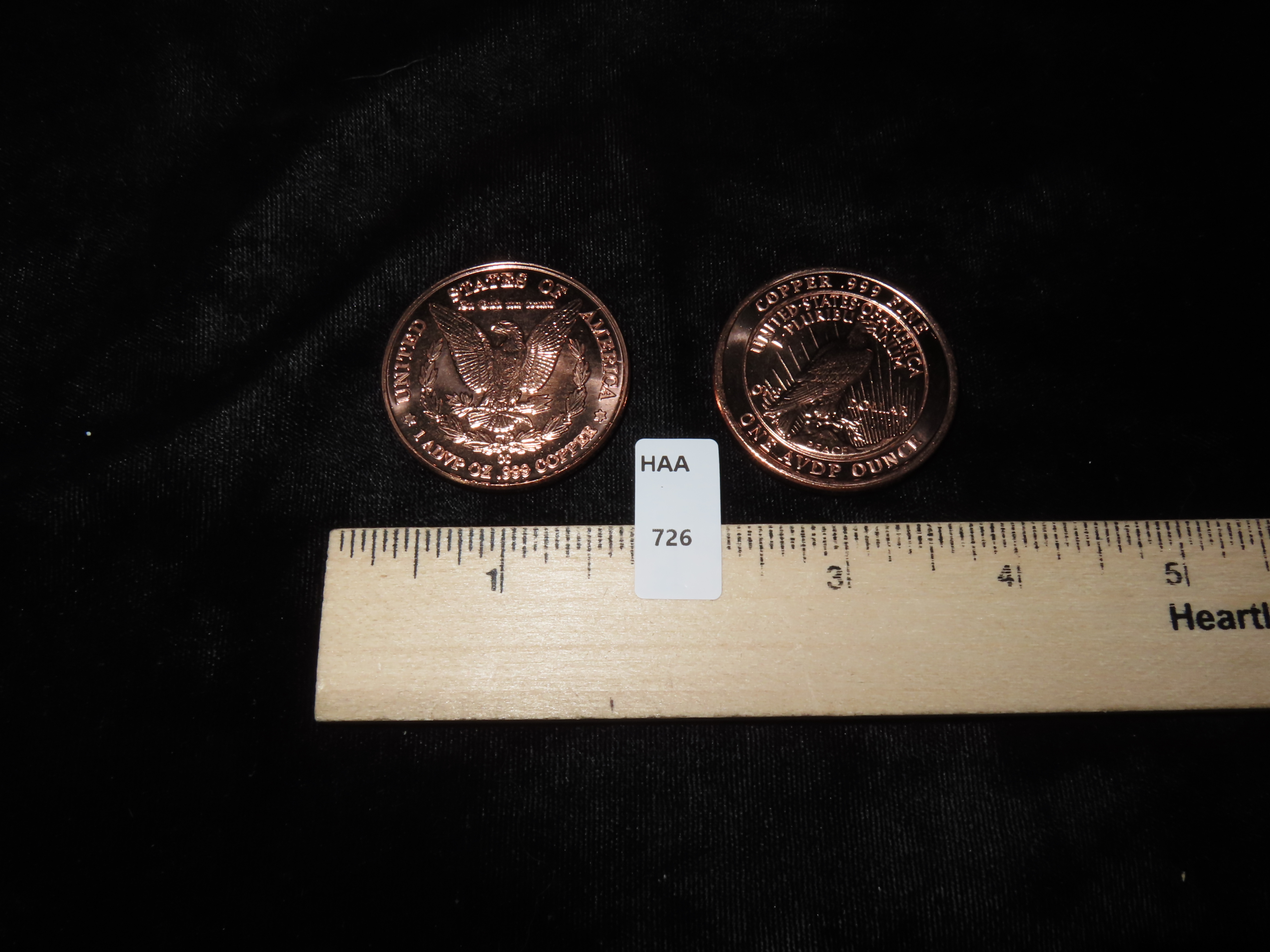 PAIR OF 1 OUNCE COPPER ROUNDS, MORGAN & PEACE DOLLAR