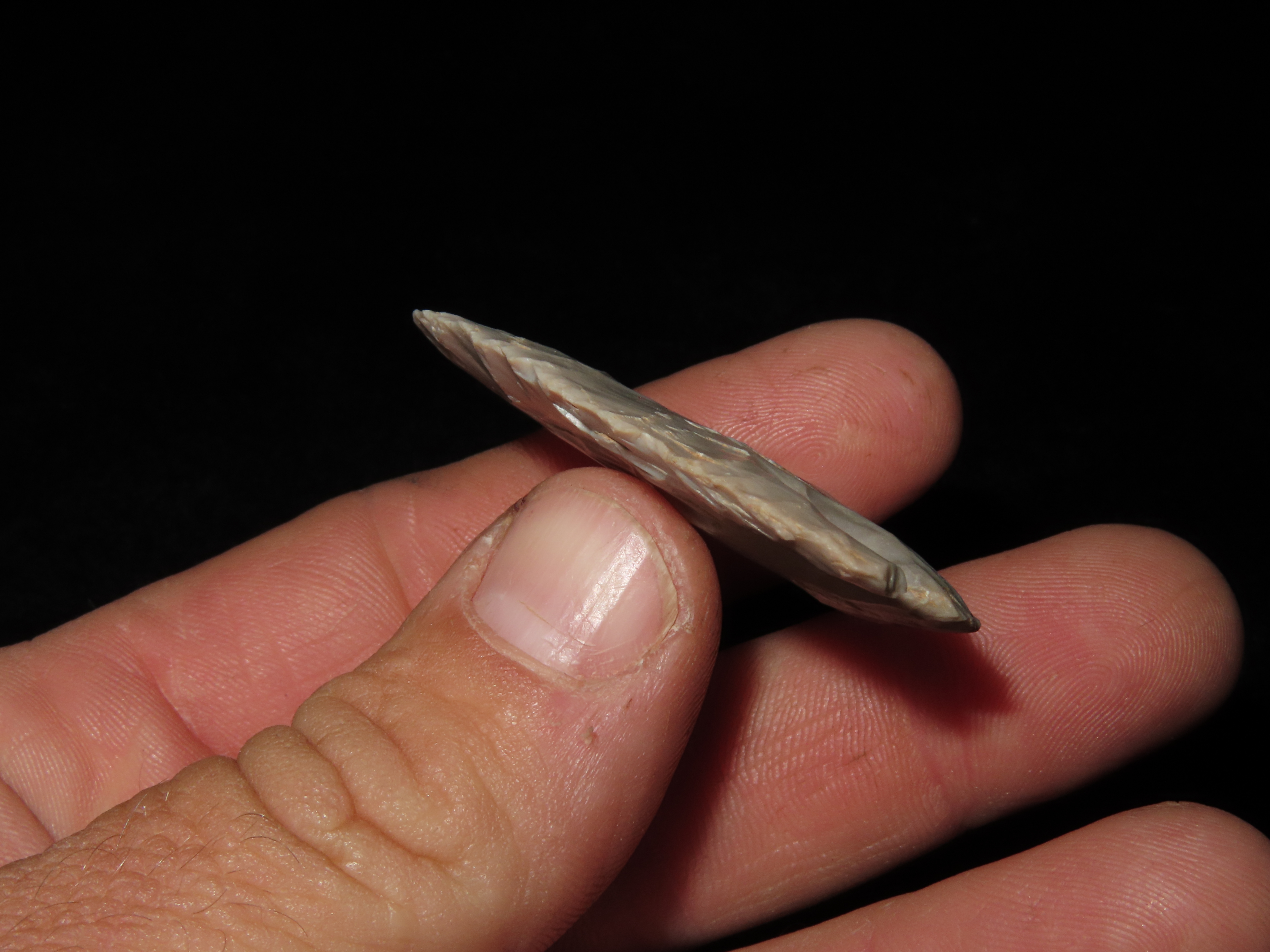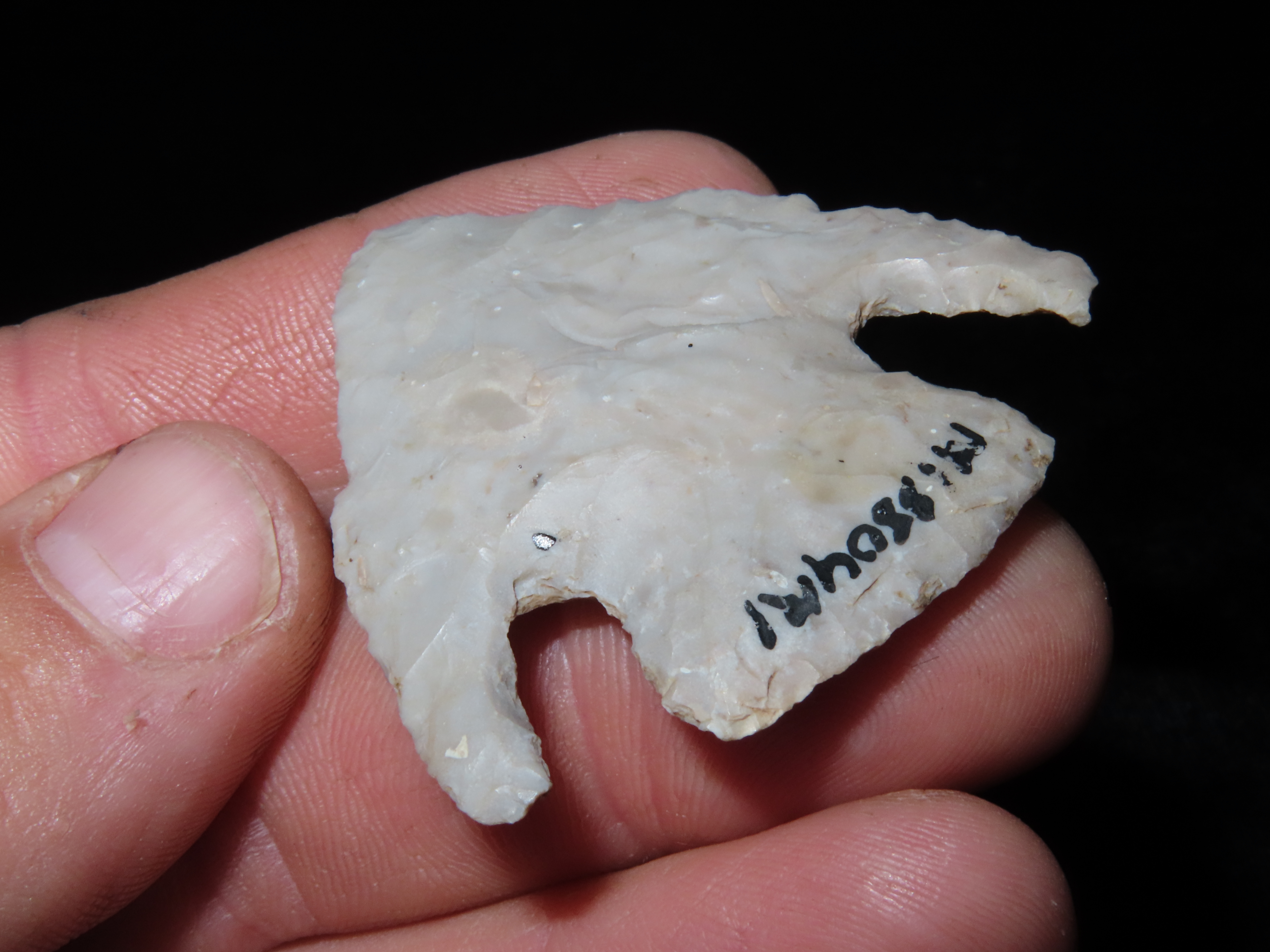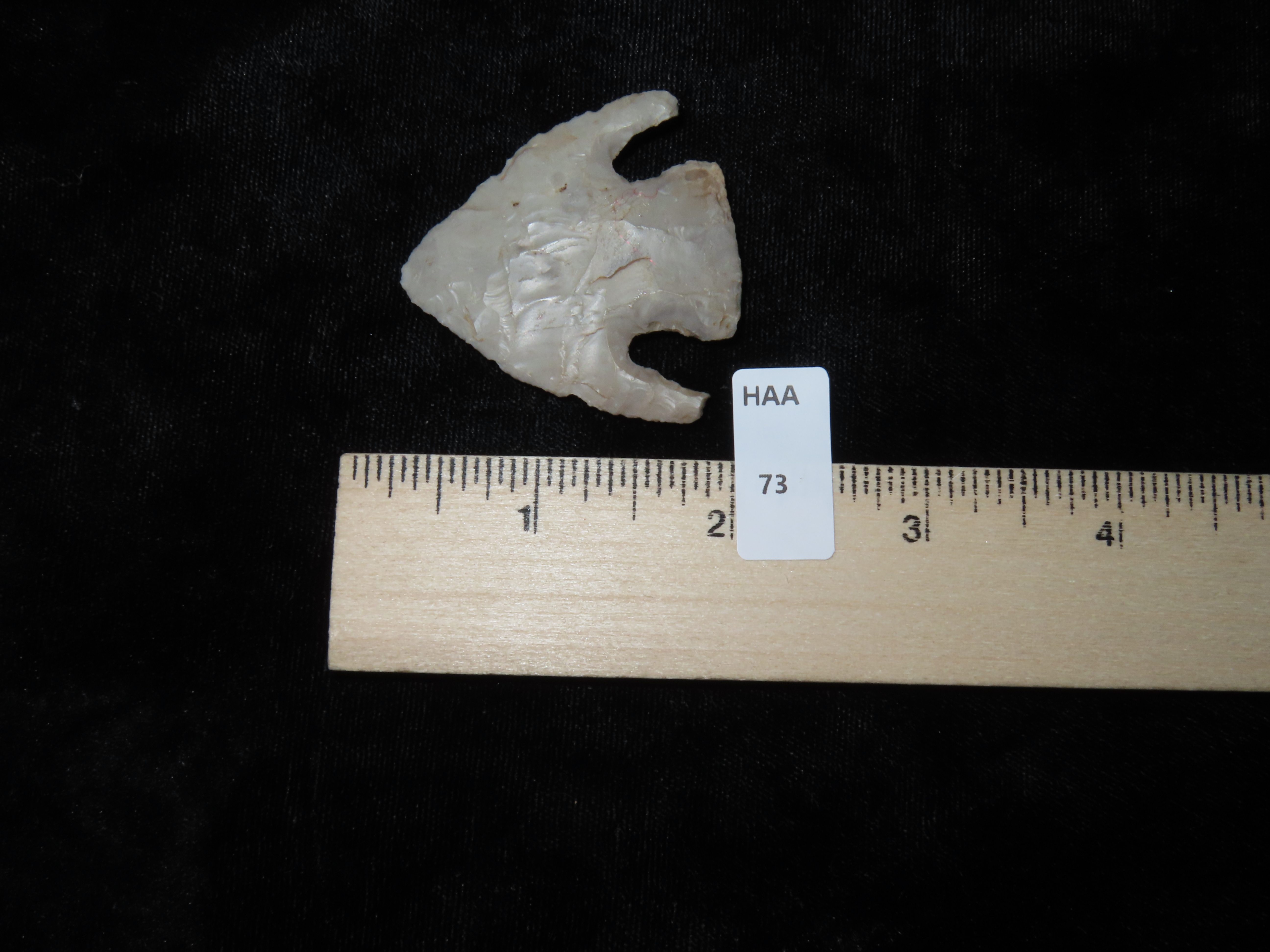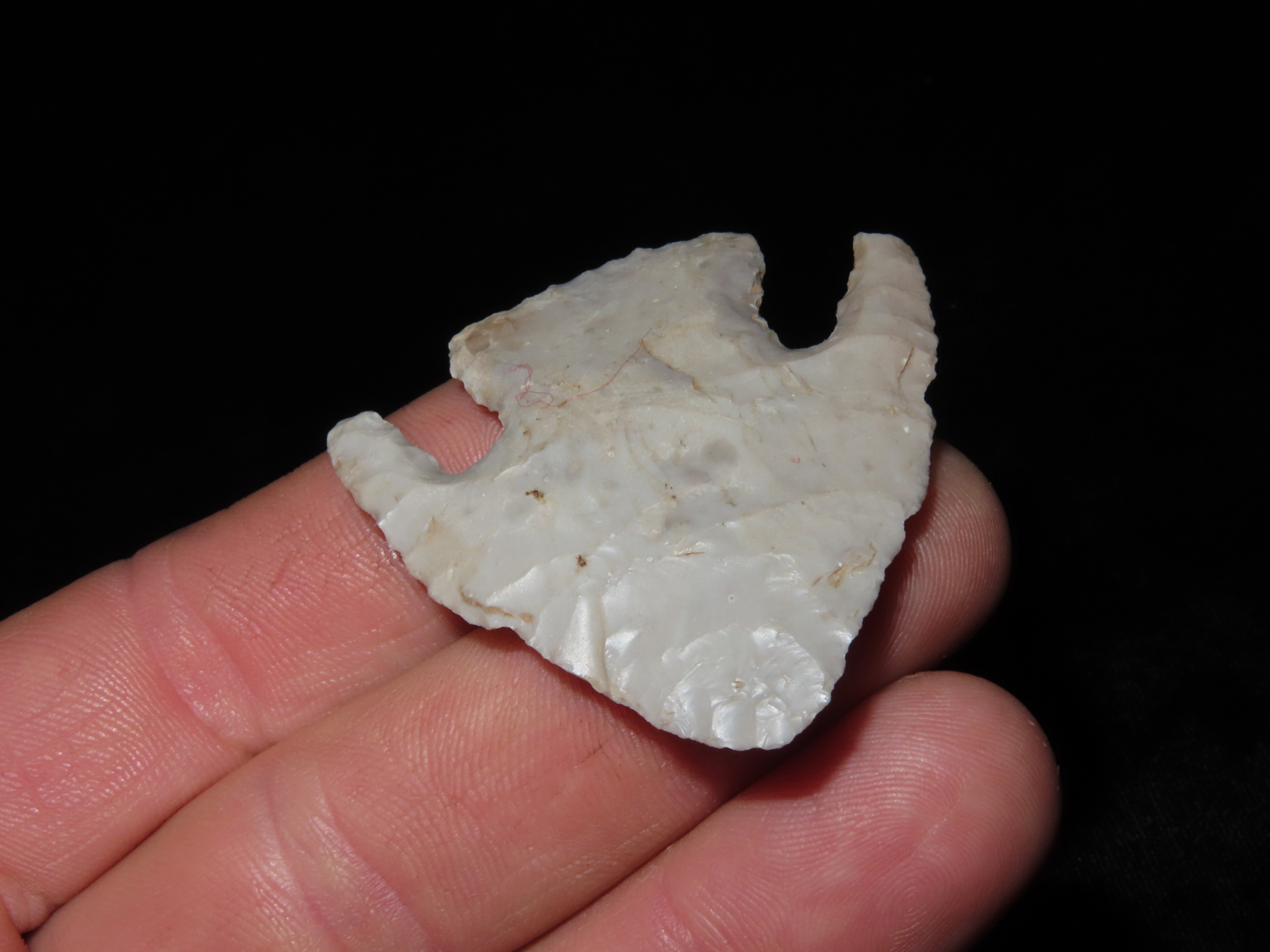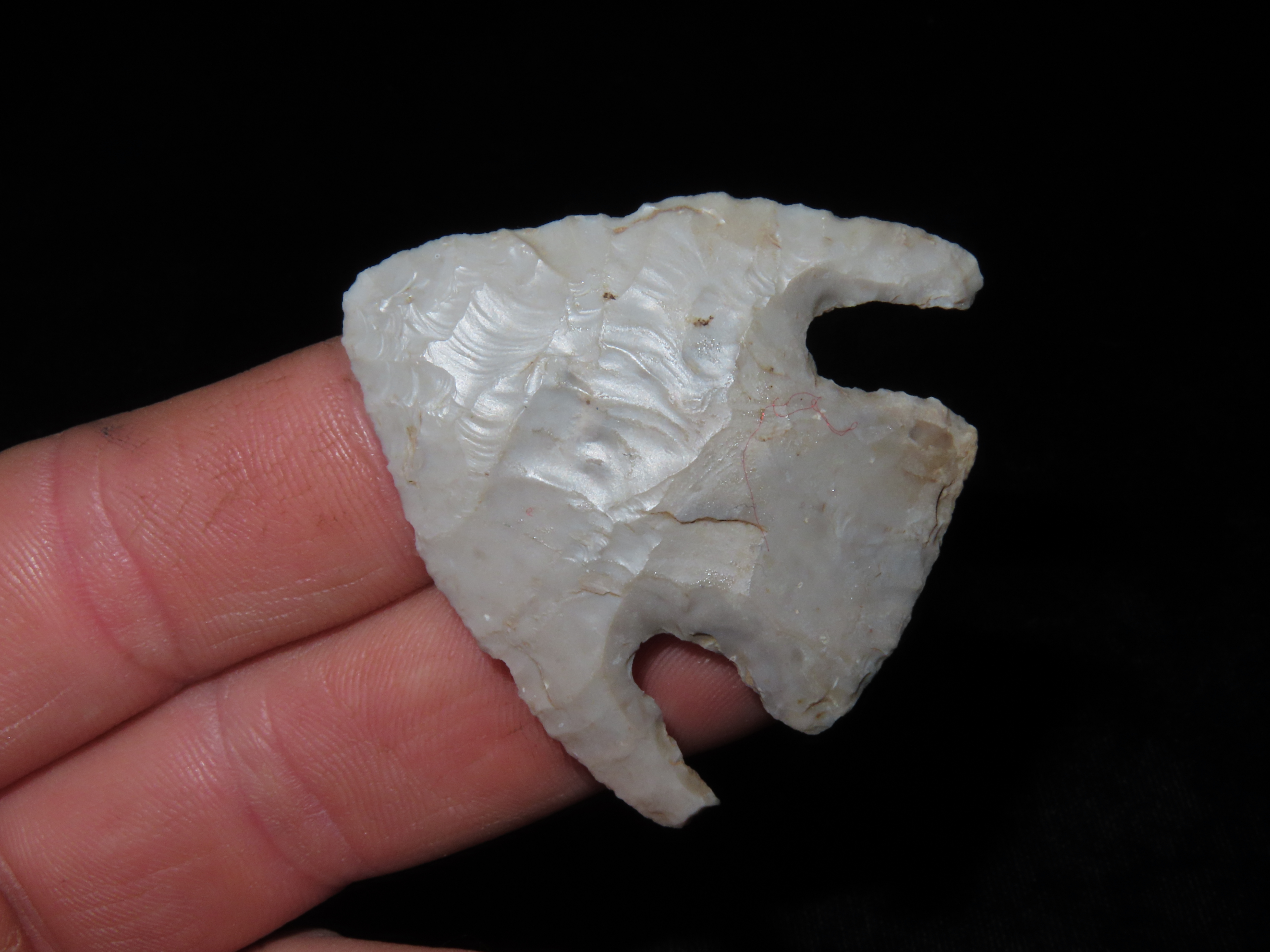 1 7/8″ CALF CREEK FOUND IN MISSOURI, VERY THIN WELL FLAKED EXAMPLE WITH BOTH EARS INTACT, GREAT PATINA, INDIAN ARROWHEAD, ARTIFACT