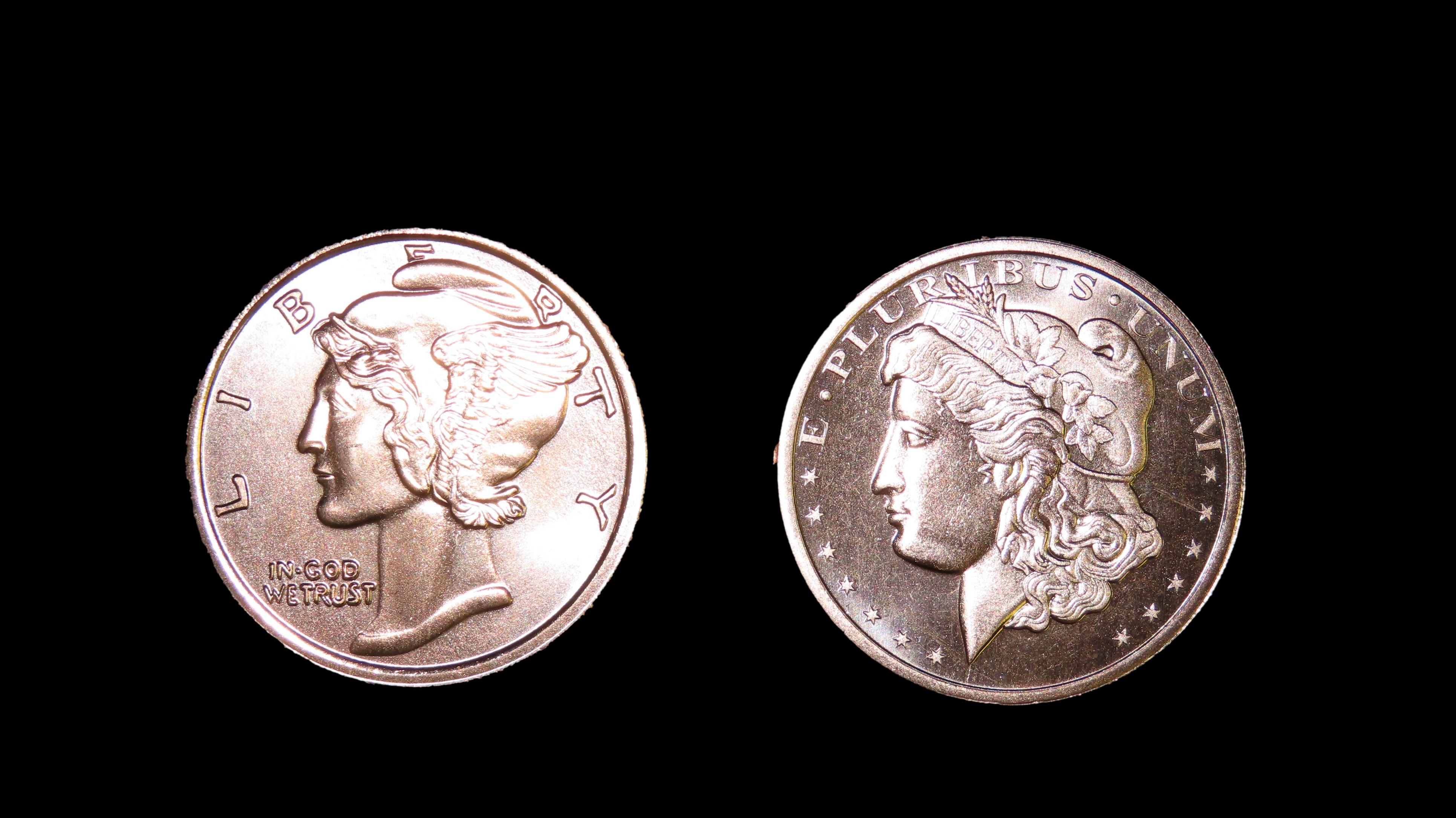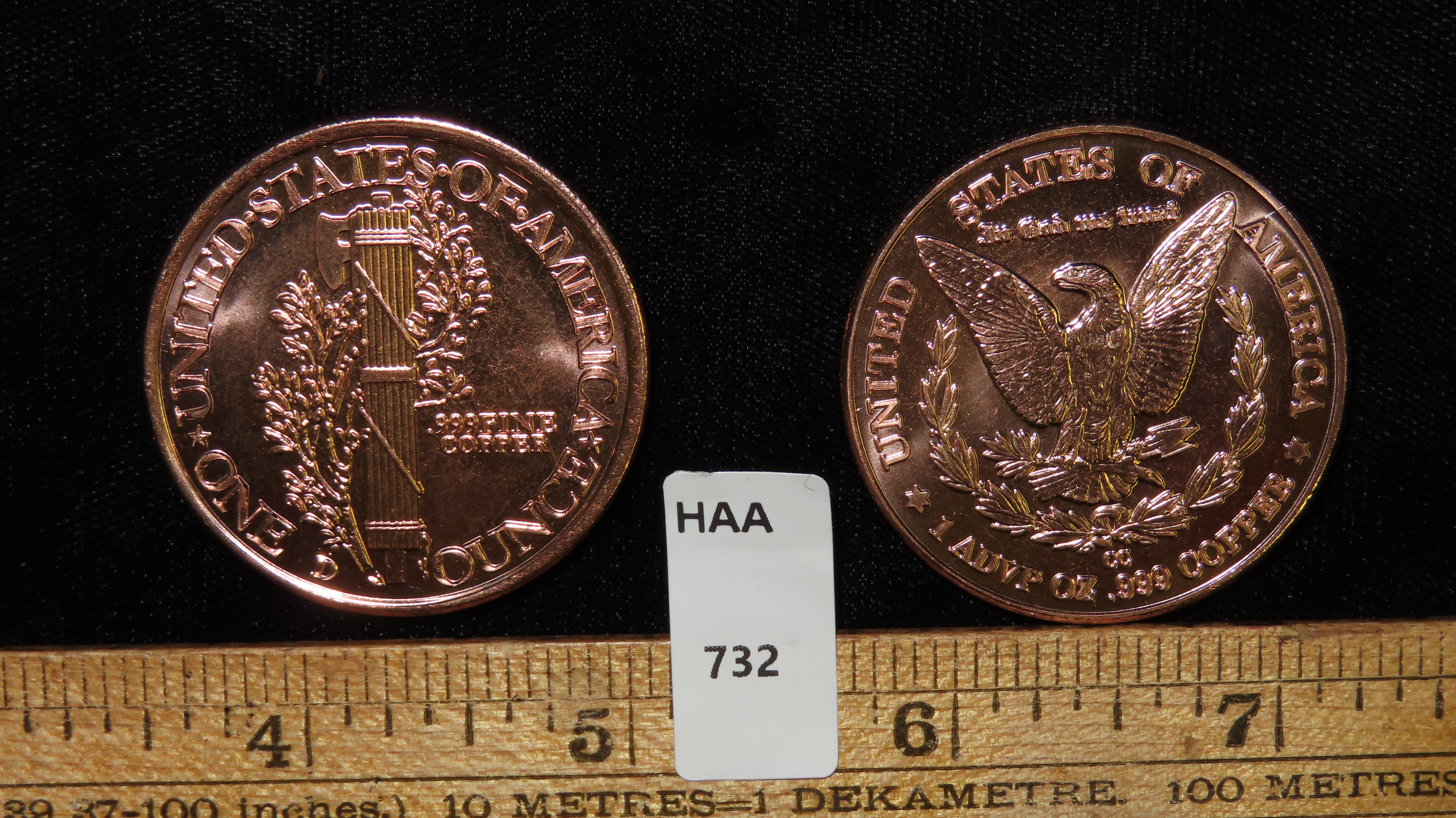 PAIR OF 1 OUNCE COPPER ROUNDS, PEACE DOLLAR & MERCURY DIME
