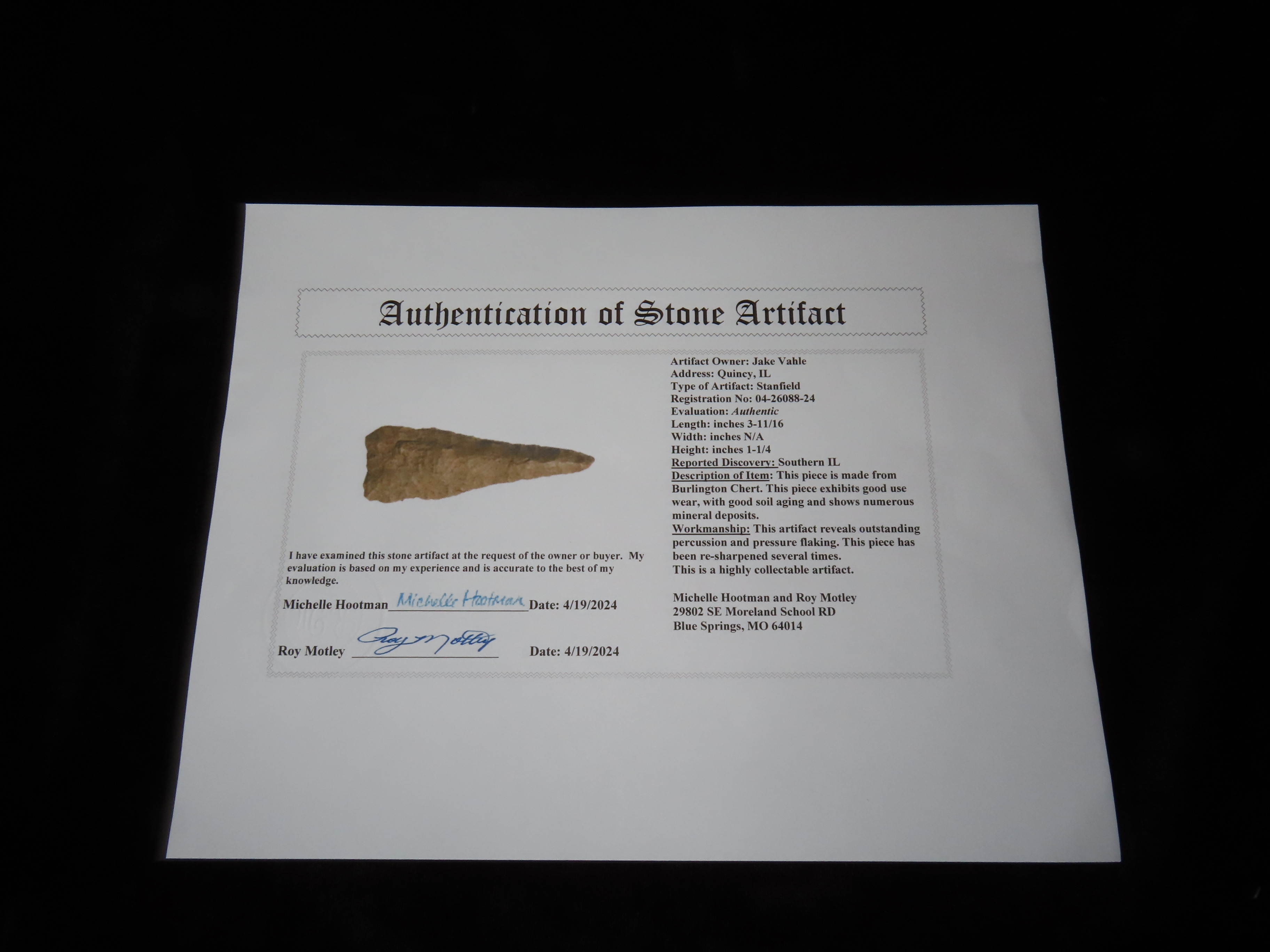 3 11/16″ Stanfield, Motley COA, found in Southern Illinois