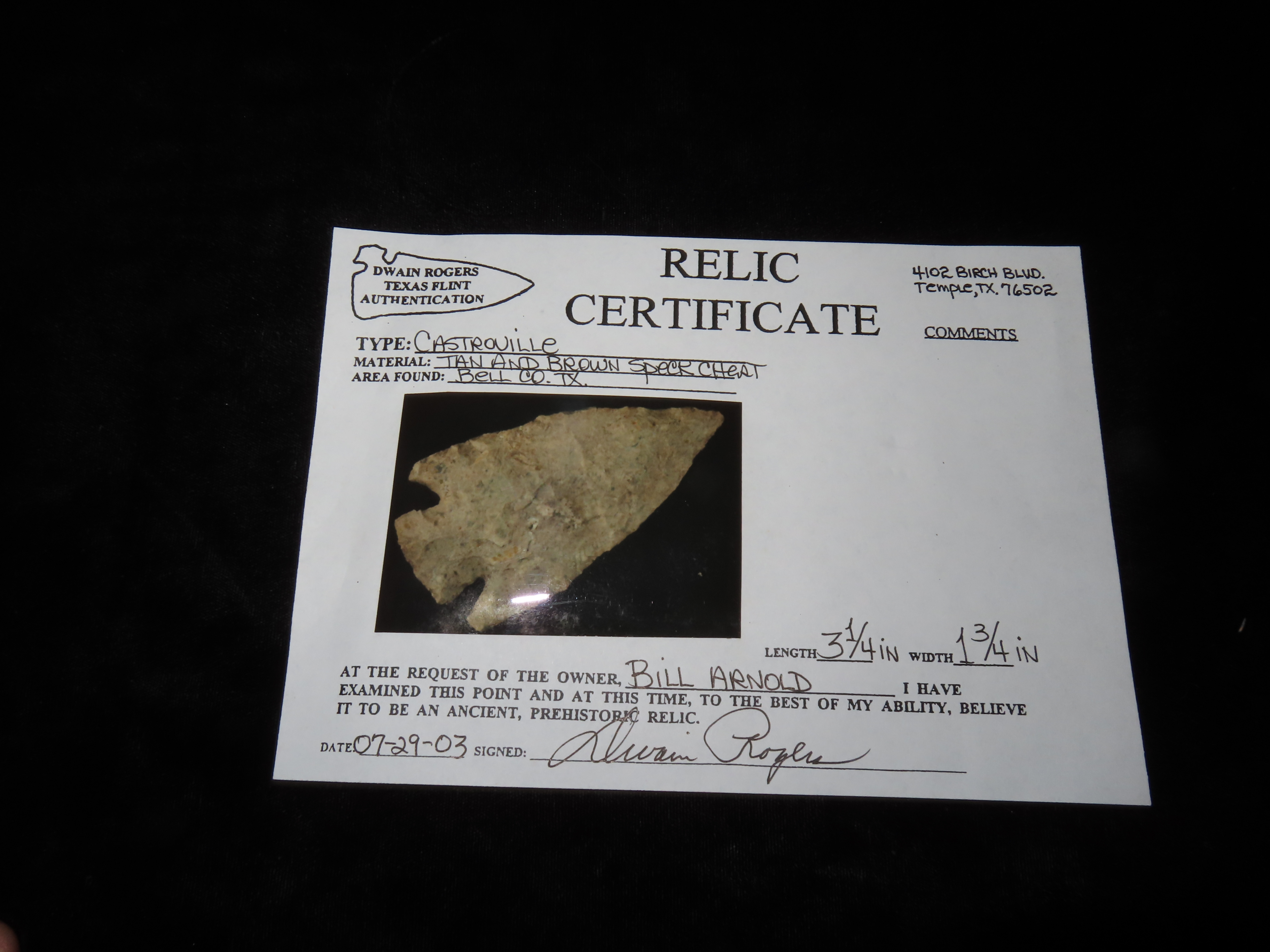 3 1/4″ Castroville, Rogers COA, found in Bell Co., Texas