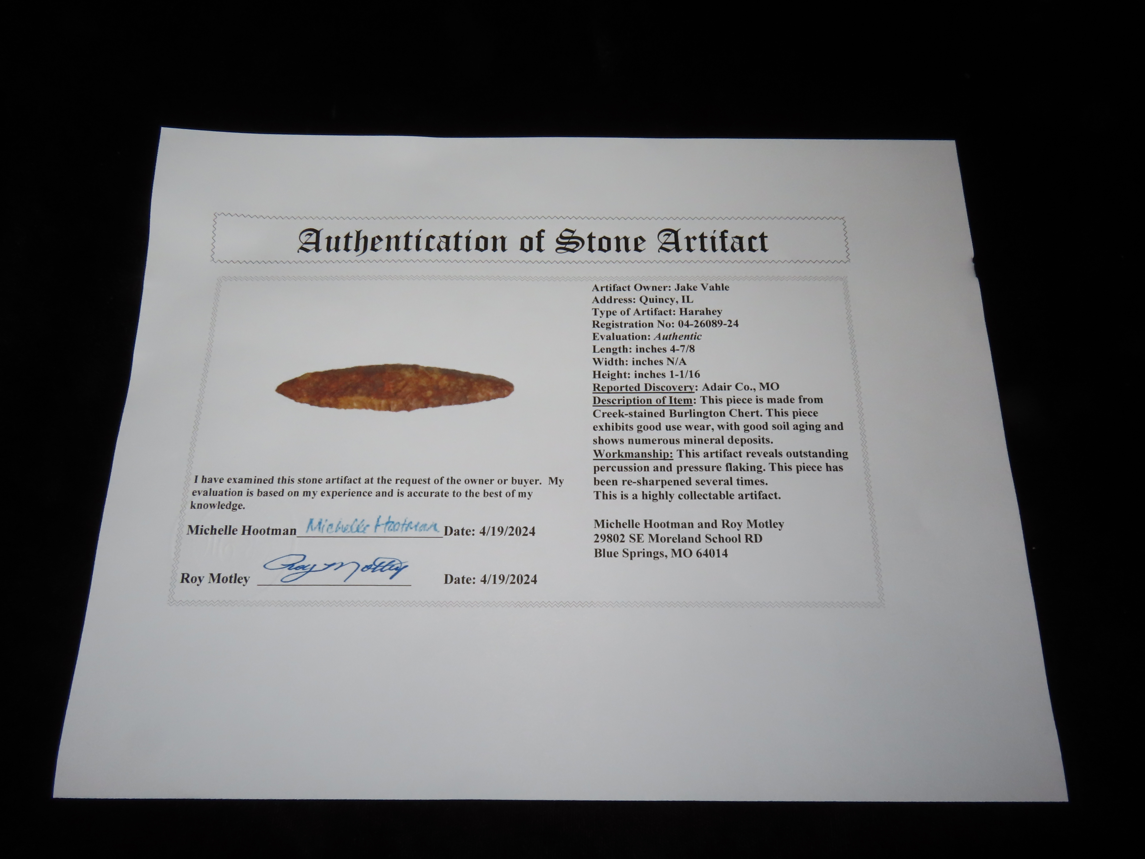 4 7/8″ Harahey, Motley COA, found in Adair Co., Missouri