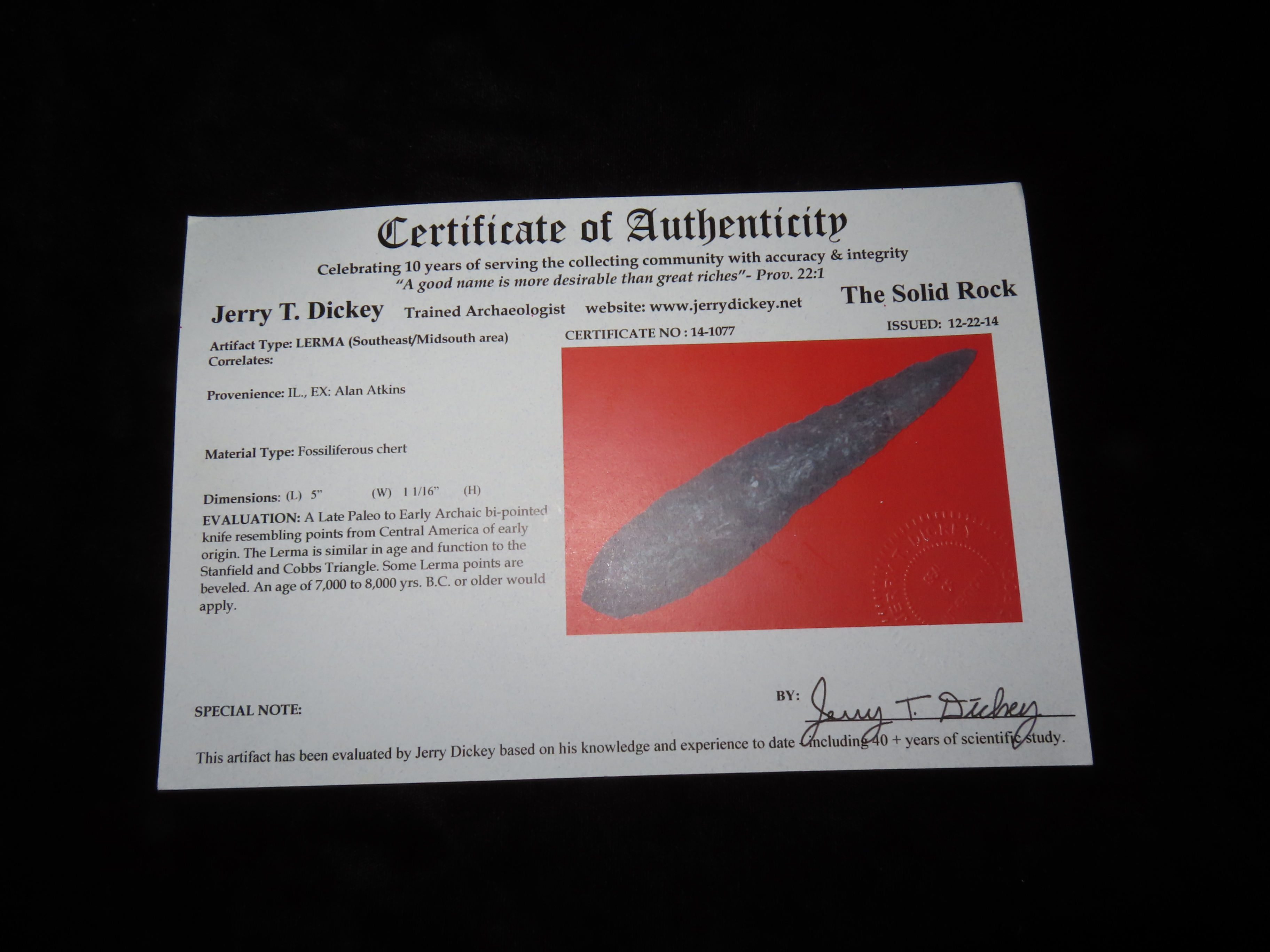 5″ Lerma Blade, Dickey COA, found in Illinois