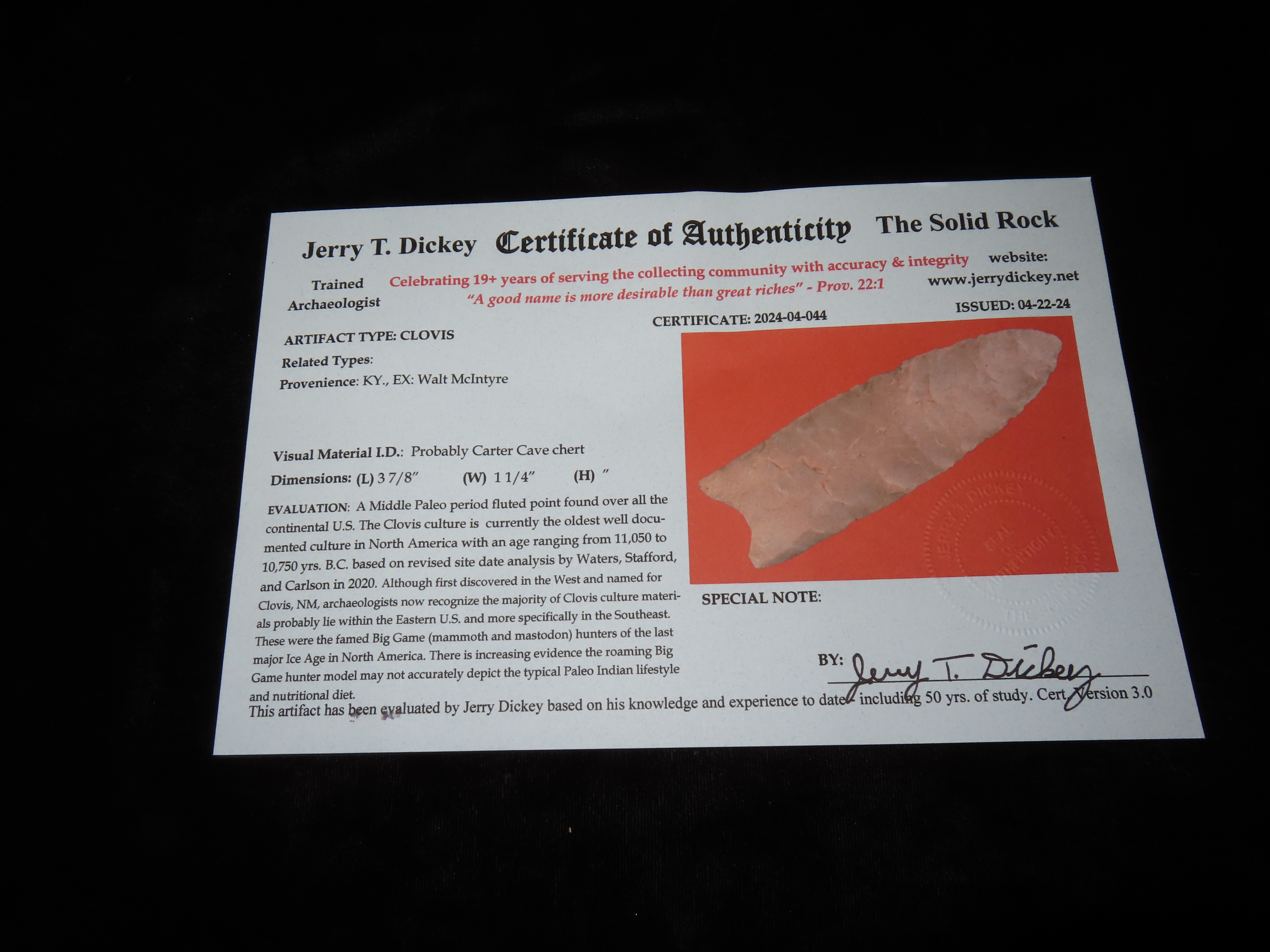3 7/8″ Clovis, Dickey COA, found in Kentucky, Ex Walt McIntyre Collection