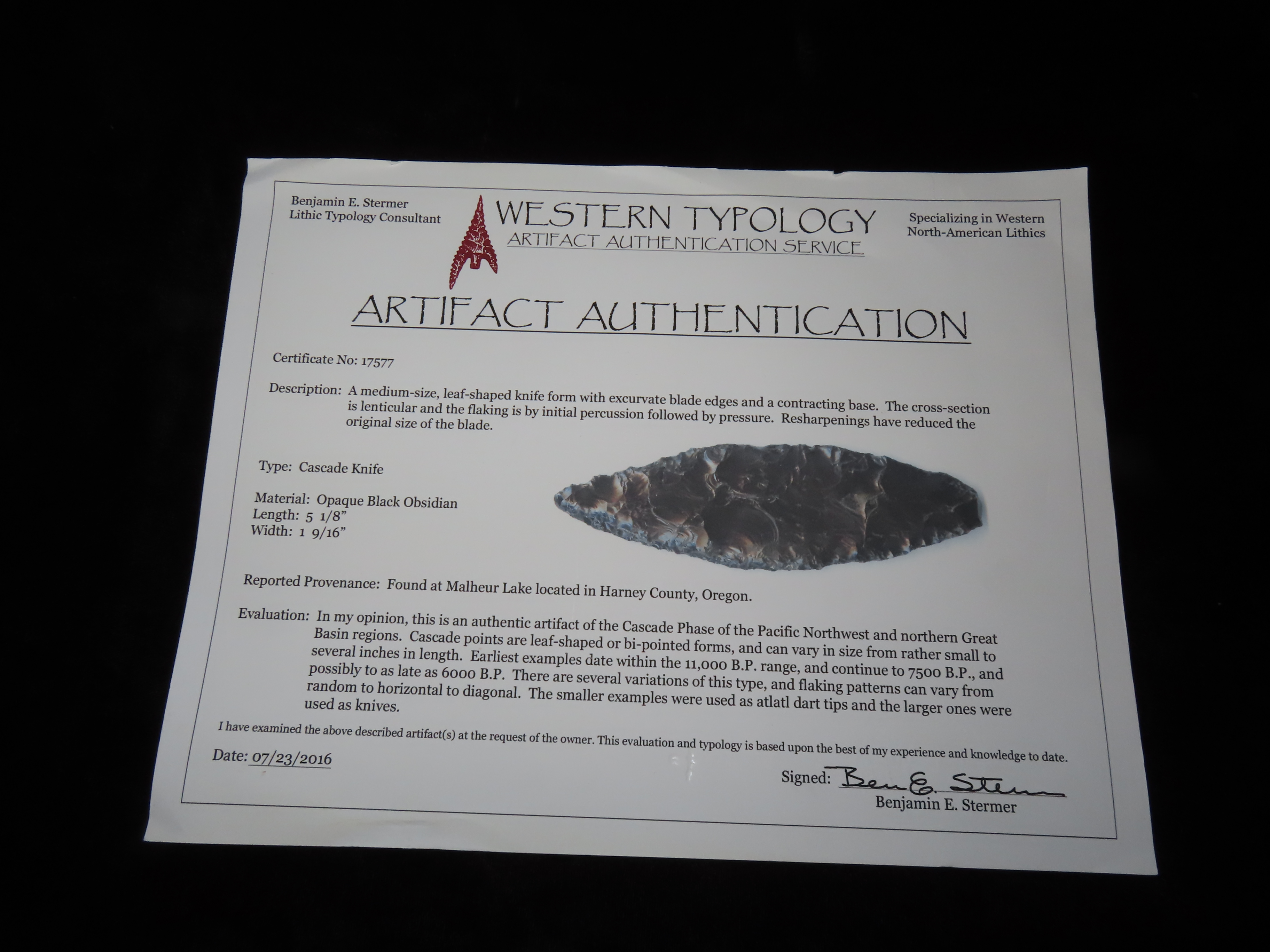 5 1/8″ Cascade Knife, Stermer COA, found in at Malhuer Lake, Harney CO., Oregon