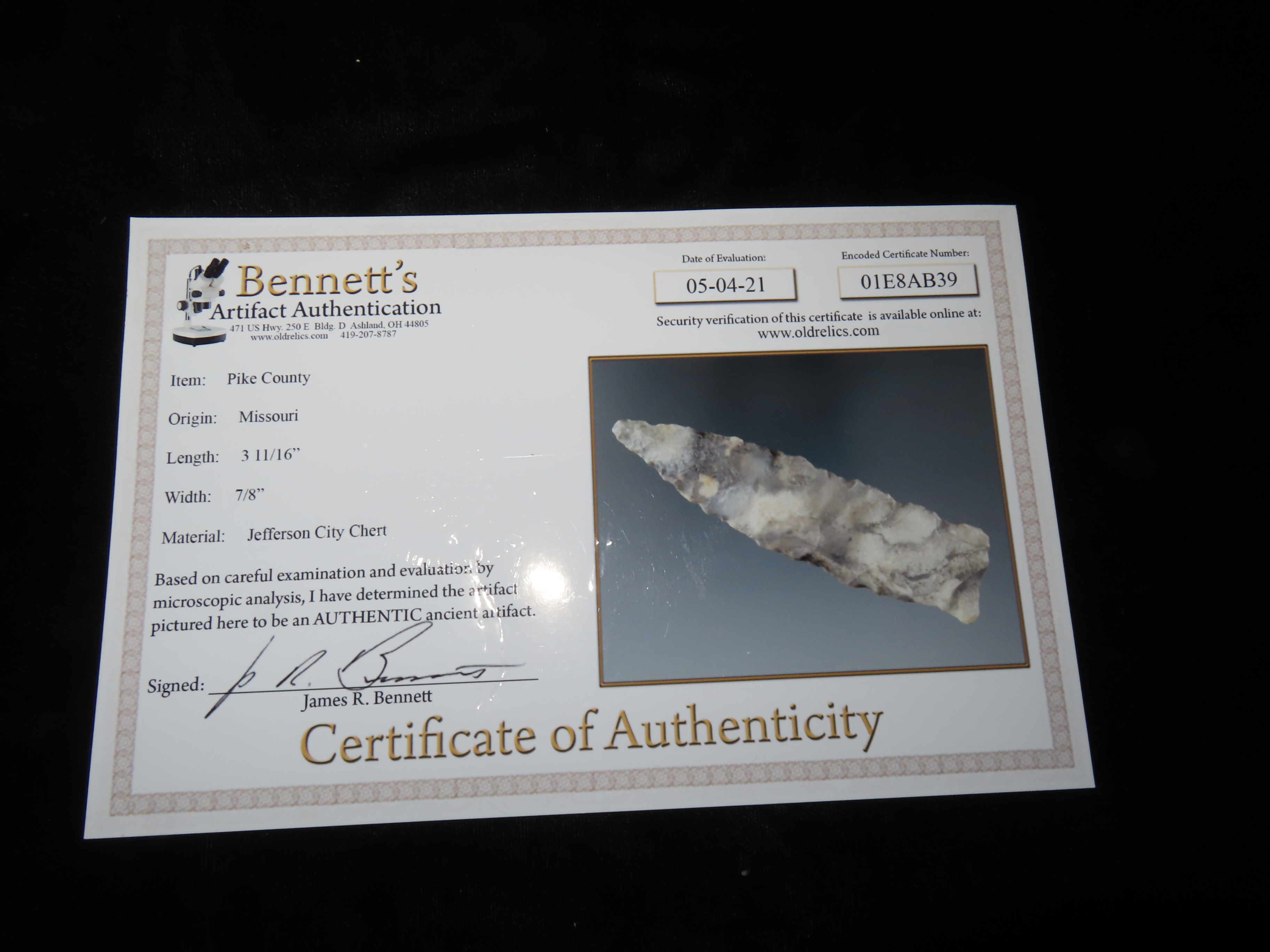 3 11/16" Stunning and Colorful Pike County, Bennett COA, found in in Missouri, made of Jefferson Chert