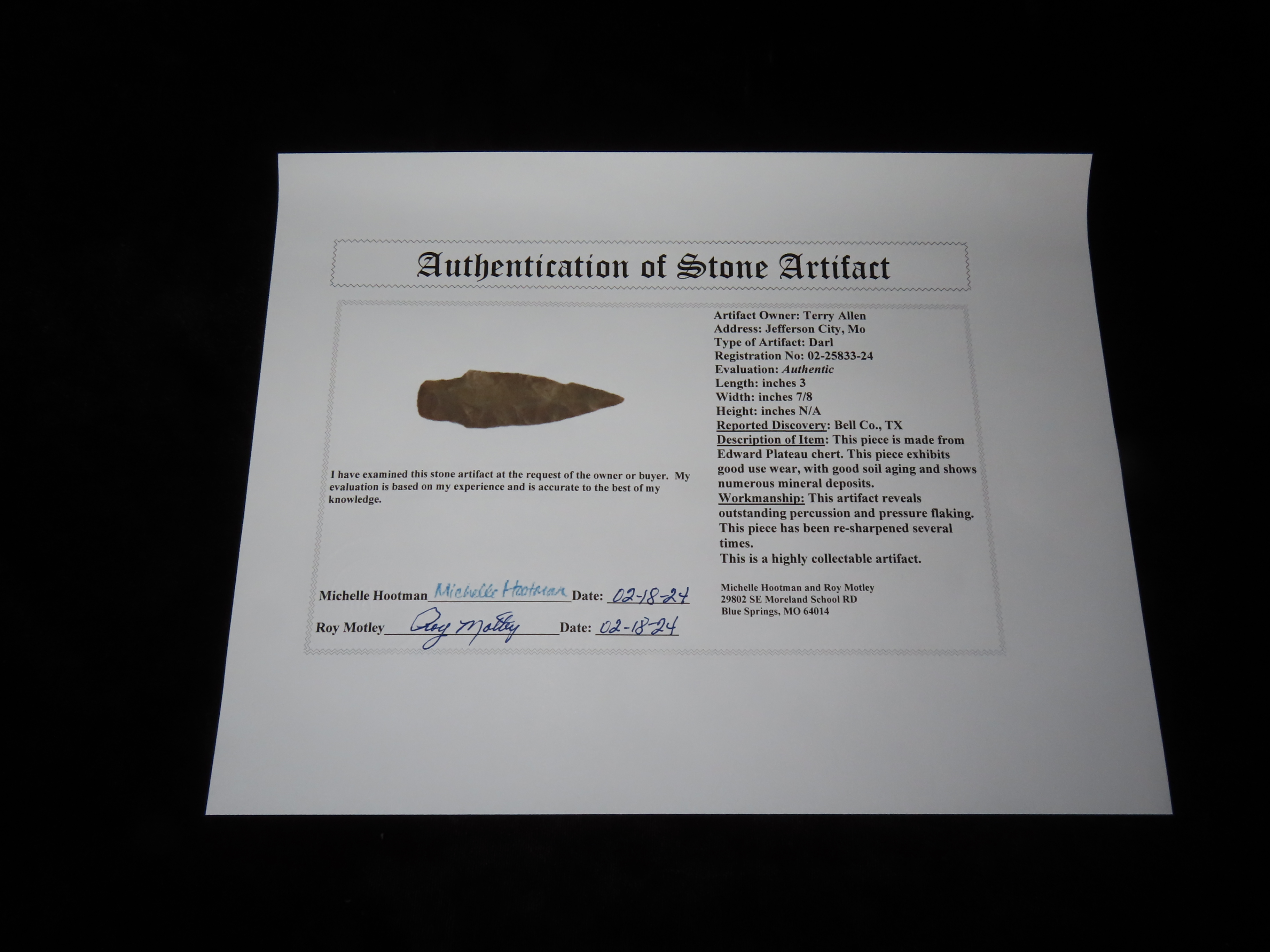 3″ Darl, Motley COA, found in Bell Co., Texas, Ex Terry Allen Collection