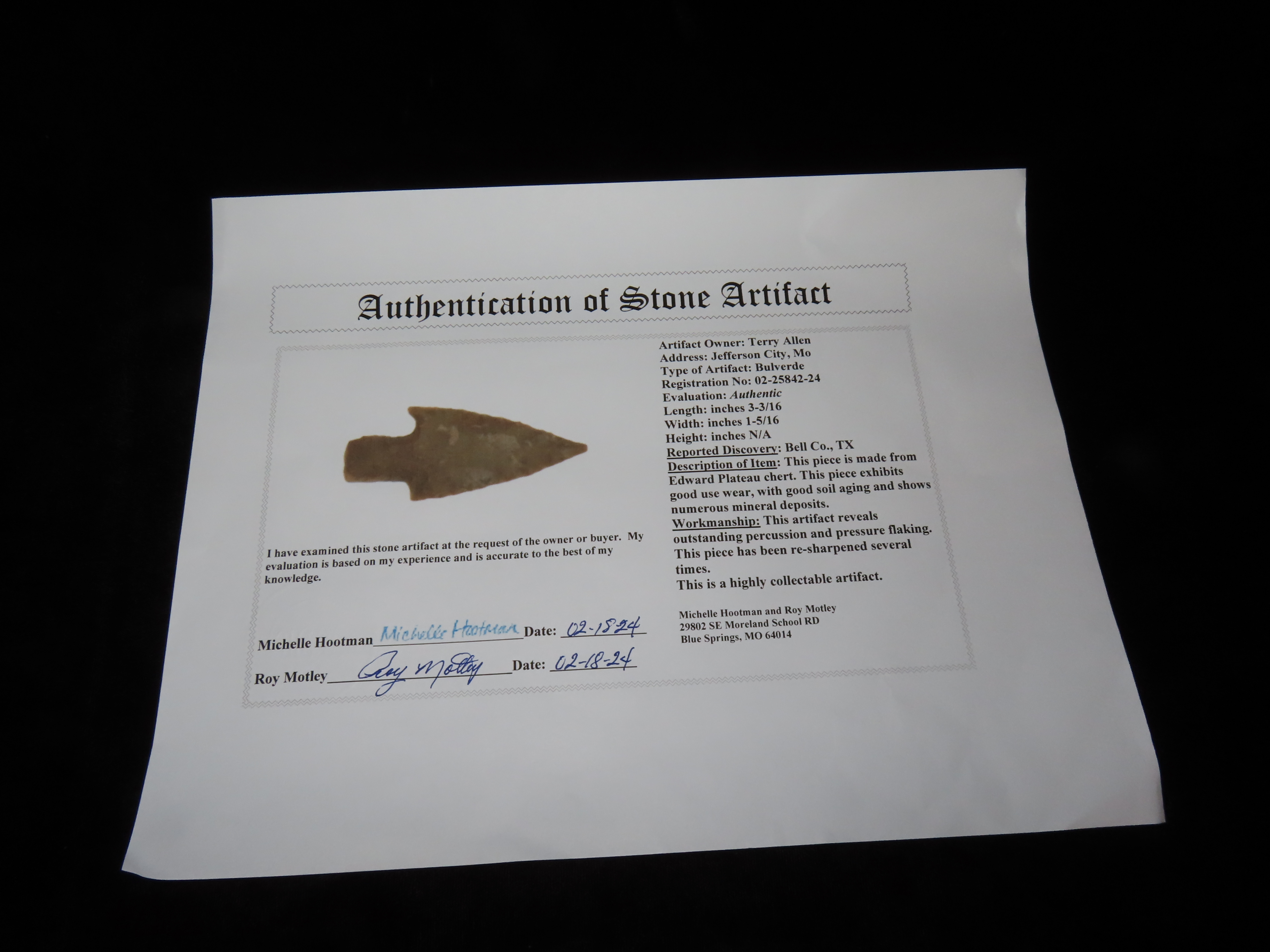 3 3/16″ Bulverde, Motley COA, found in Bell Co., Texas Ex Terry Allen Collection