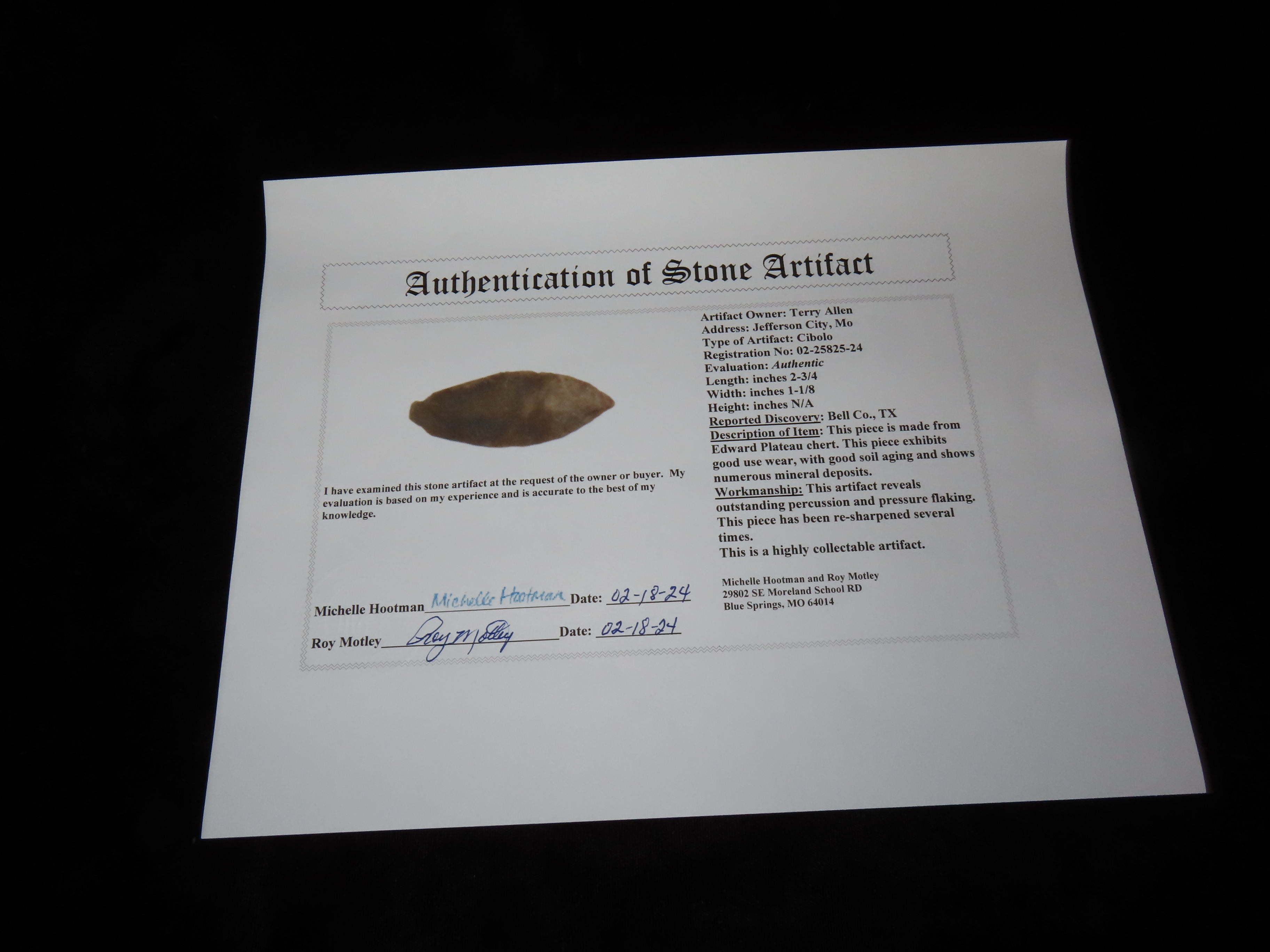 2 3/4″ Cibolo, Motley COA, found in Bell Co., Texas Ex Terry Allen Collection