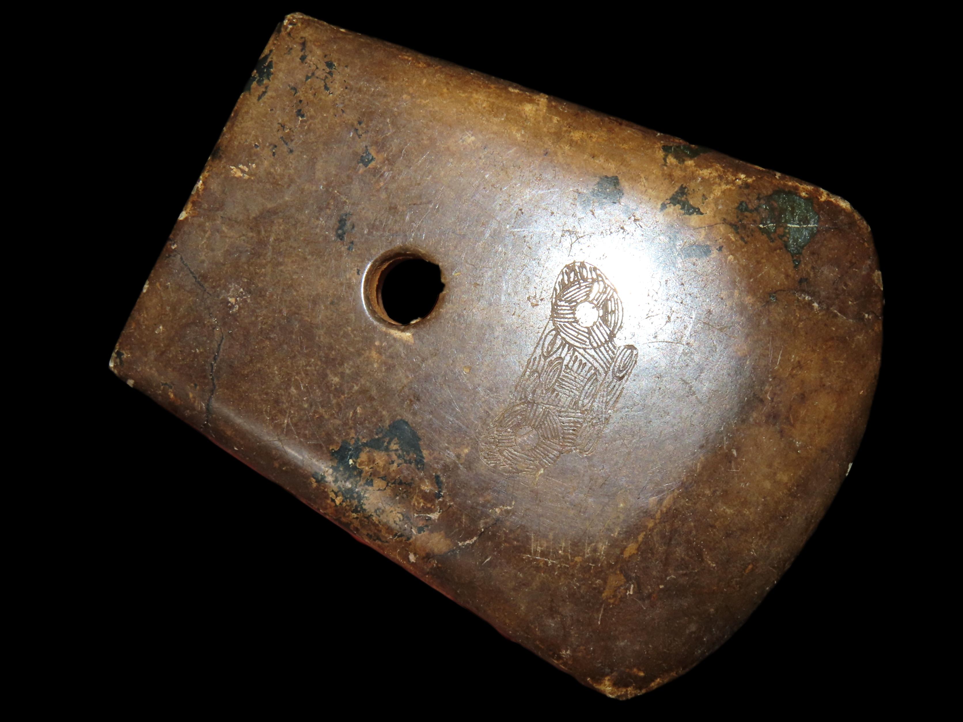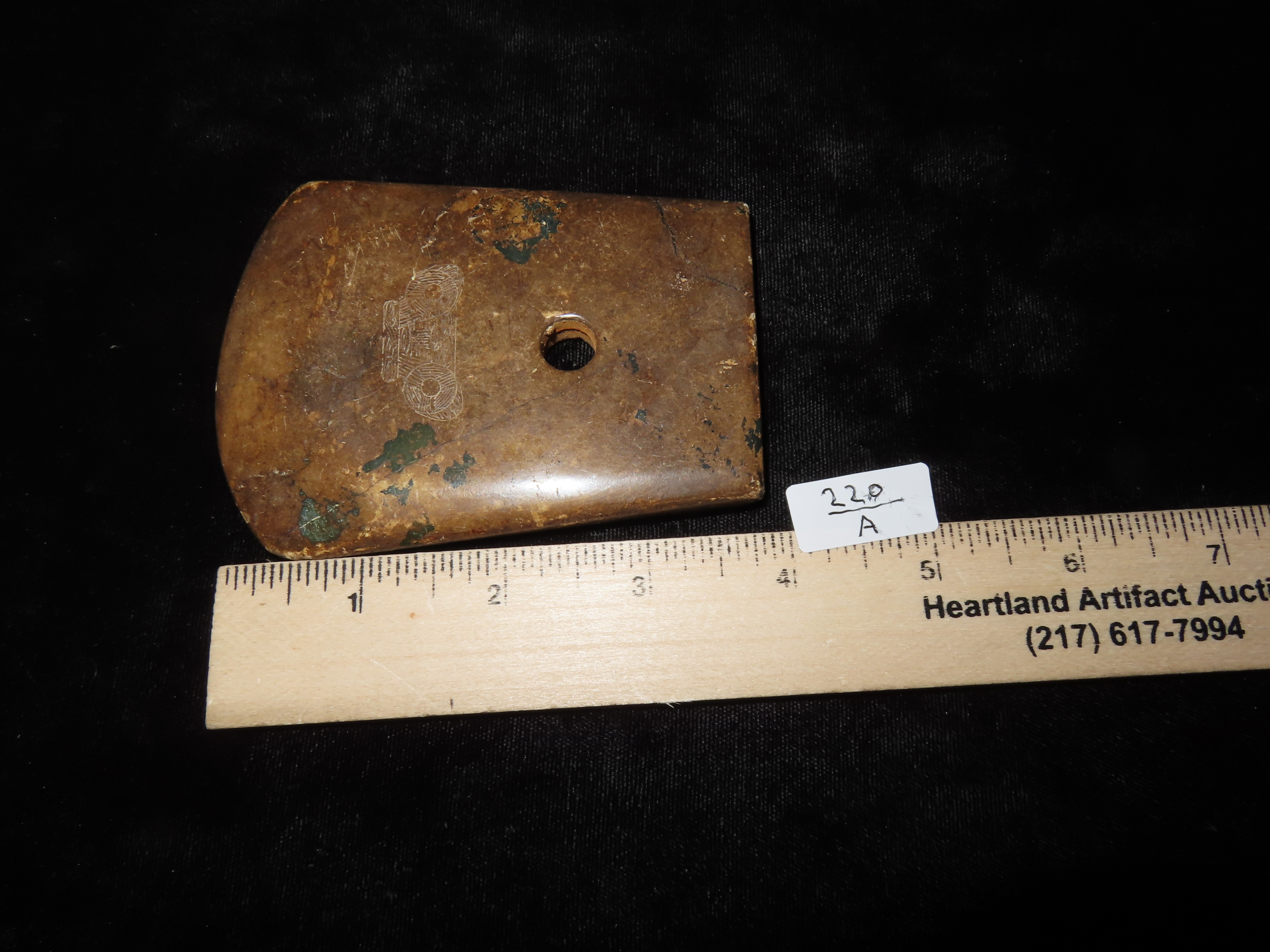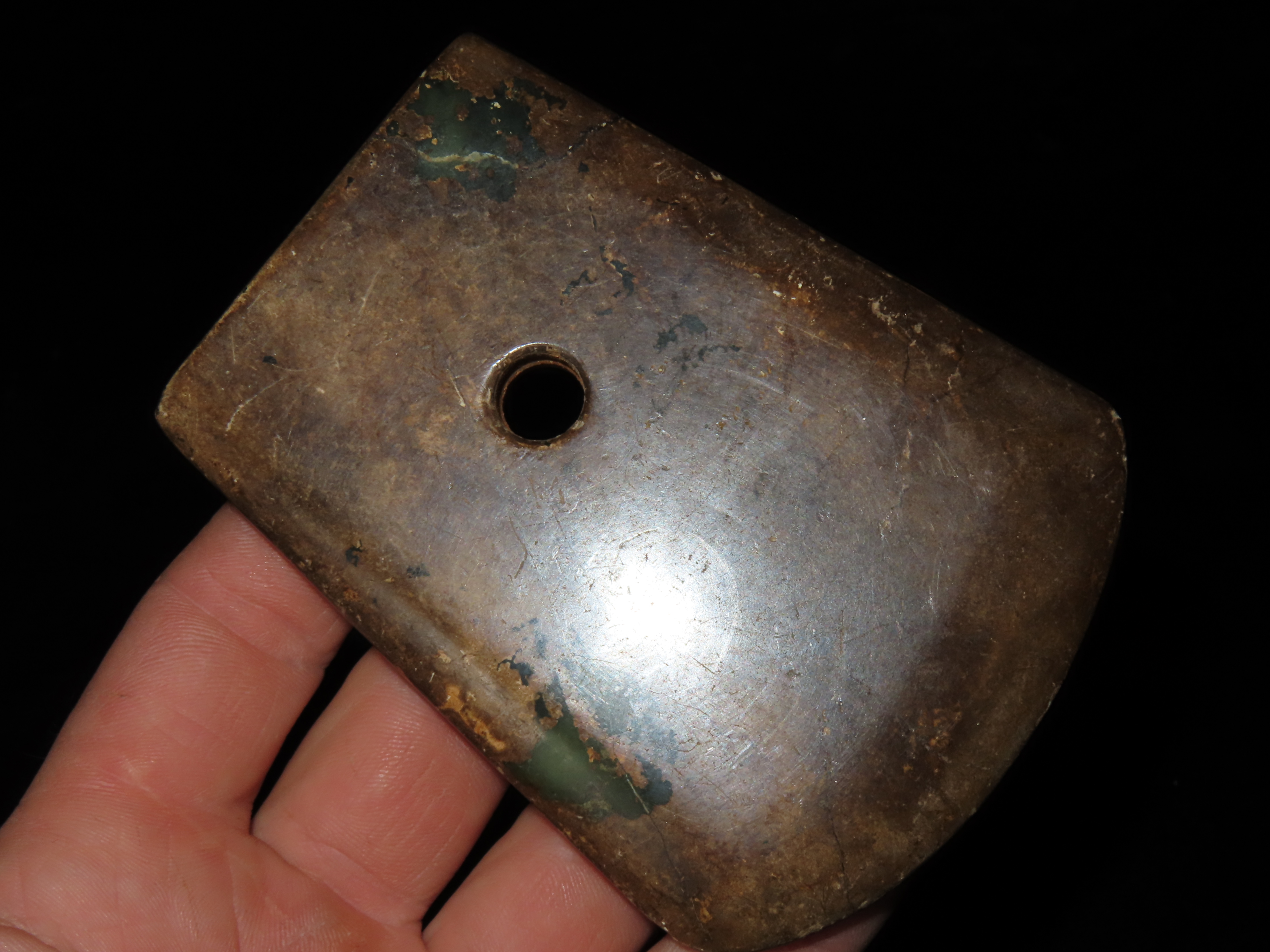 3 3/4″ Engraved Chinese Neolithic Period Jade Axe/Celt w/hole, Liang Zhu Culture ca. 3500-2000BC, Excavated in the Zhejiang Province, Southeast China, Ex Herb Mangold Collection