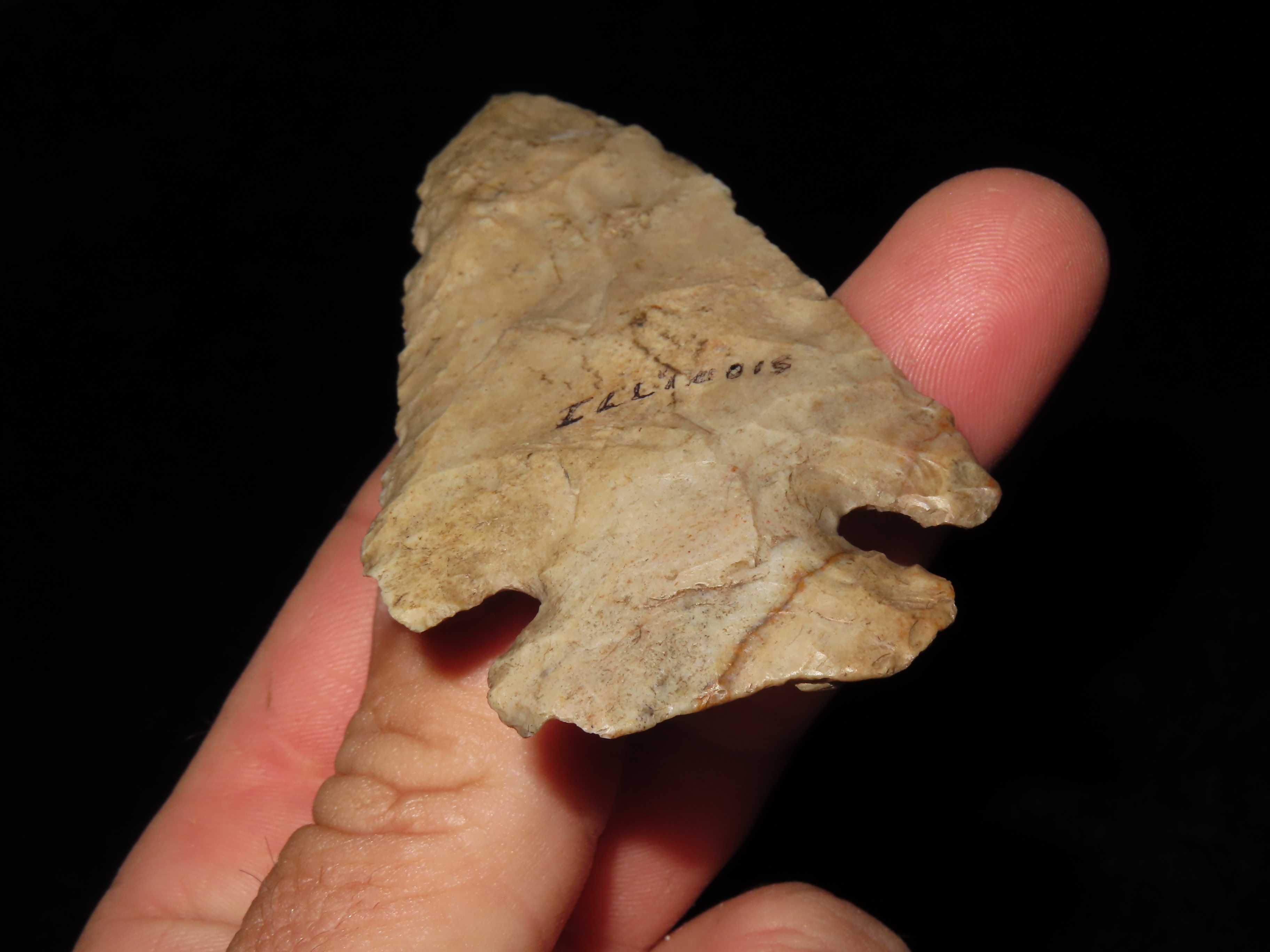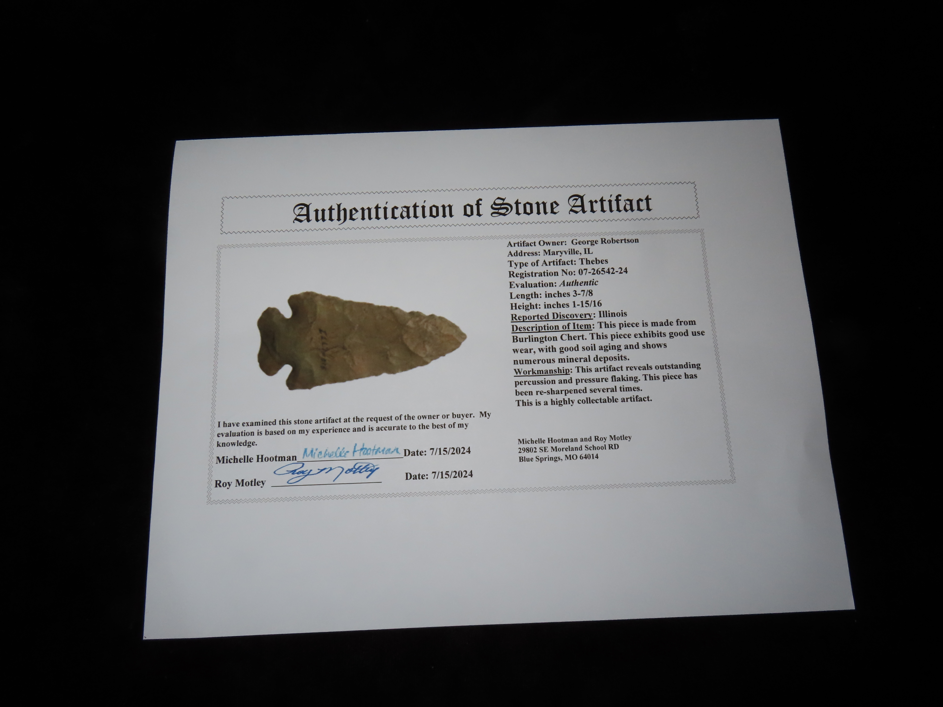 3 7/8″ Thebes, Motley COA, found in Illinois, Ex George Robertson Collection