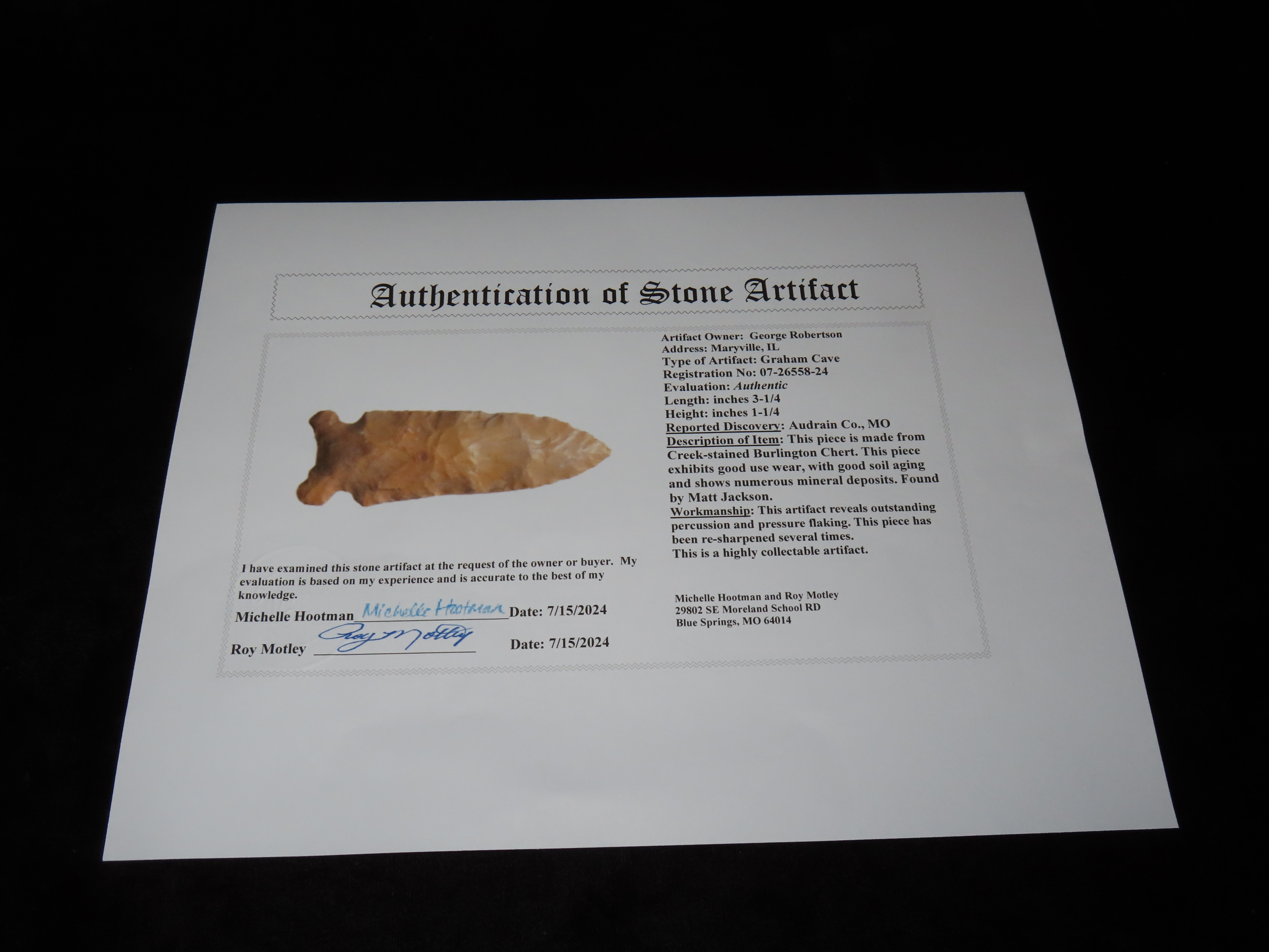 3 1/4″ Graham Cave, Motley COA, Amazing Creek Staining, found by Matt Jackson in Audrain Co., Missouri, Ex George Robertson Collection