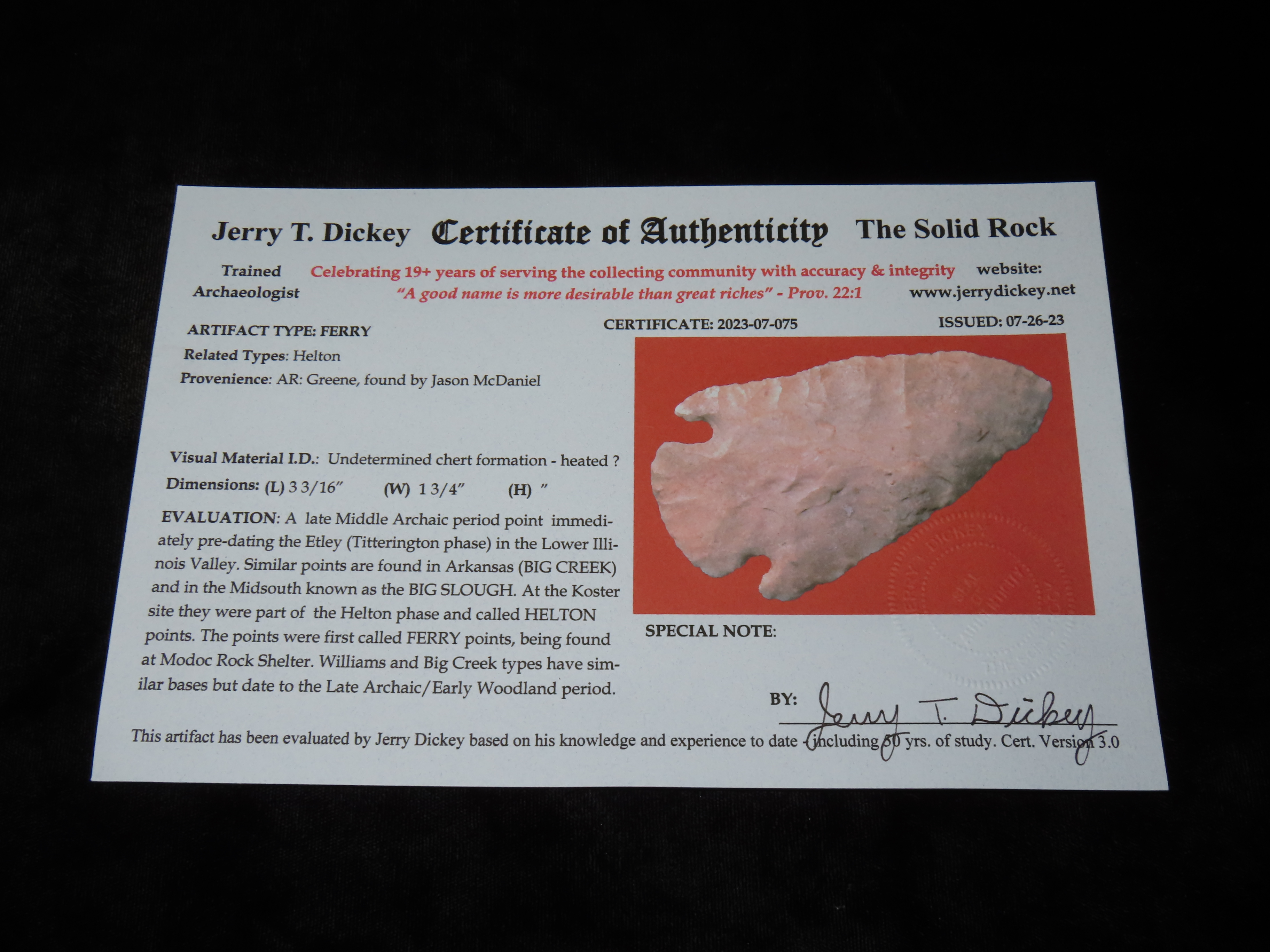 3 1/8″ Ferry, Dickey COA, found in Greene Co., Arkansas, Ex Jason McDaniel, Ex George Robertson Collection