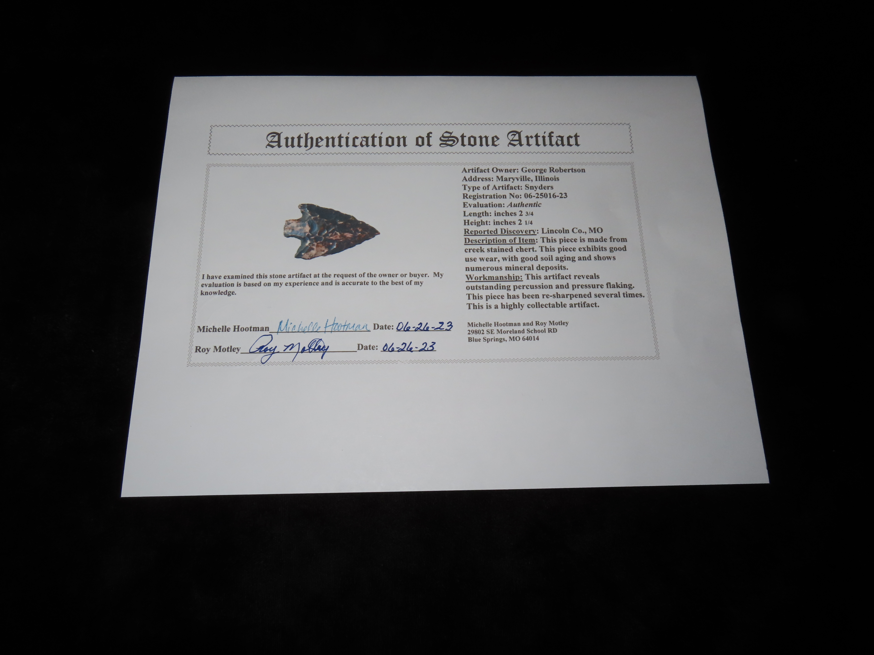 2 3/4″ Snyder, Motley COA, SUPER Creek Staining on this piece, found in Lincoln Co., Missouri, Ex George Robertson Collection