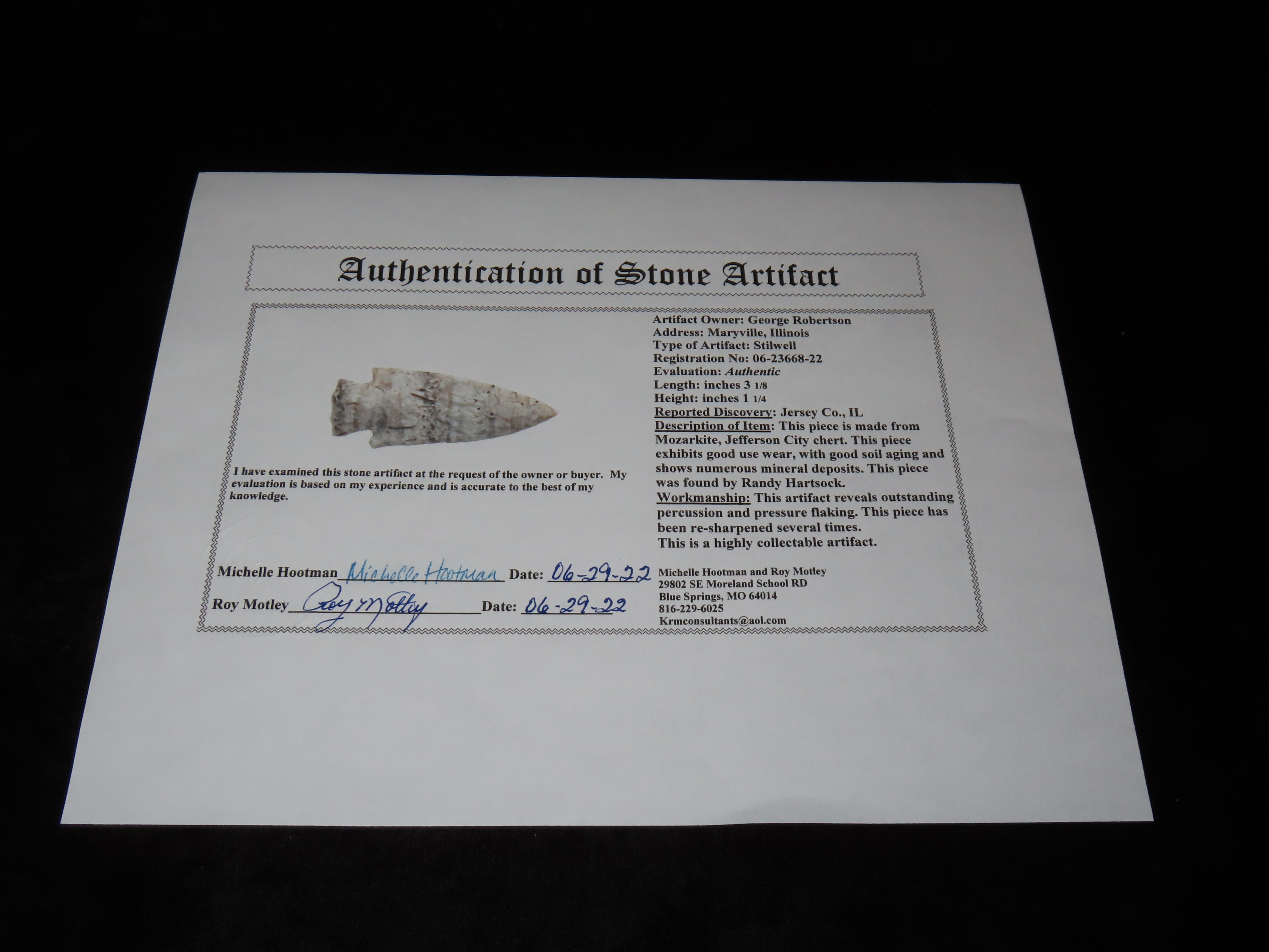 3 1/8″ Quartzite Stillwell, Motley COA, found by Randy Hartsock in Jersey Co, Illinois, Ex George Robertson Collection