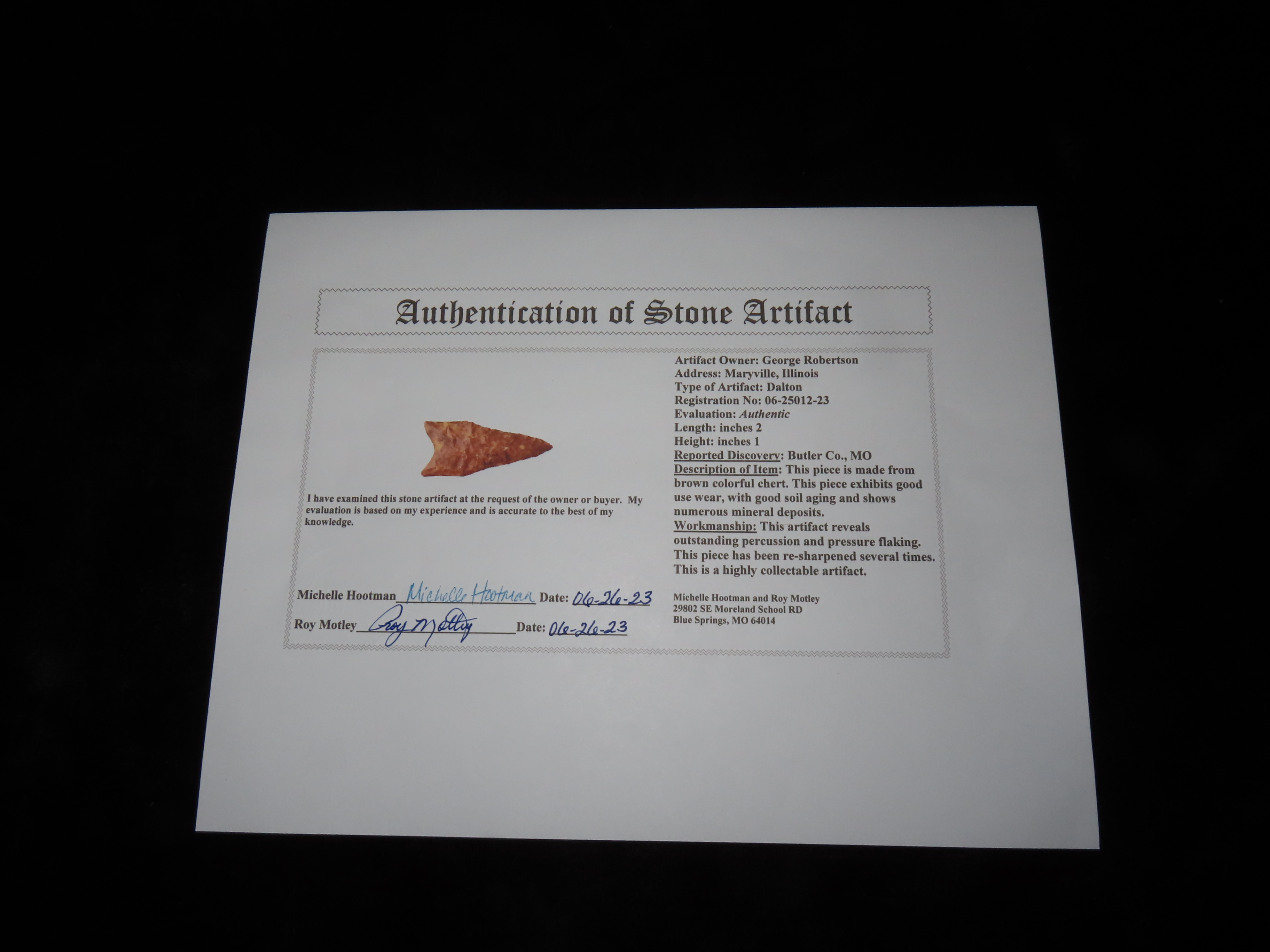 2″ Dalton, Motley COA, found in Scott Co., Missouri, Ex George Robertson Collection