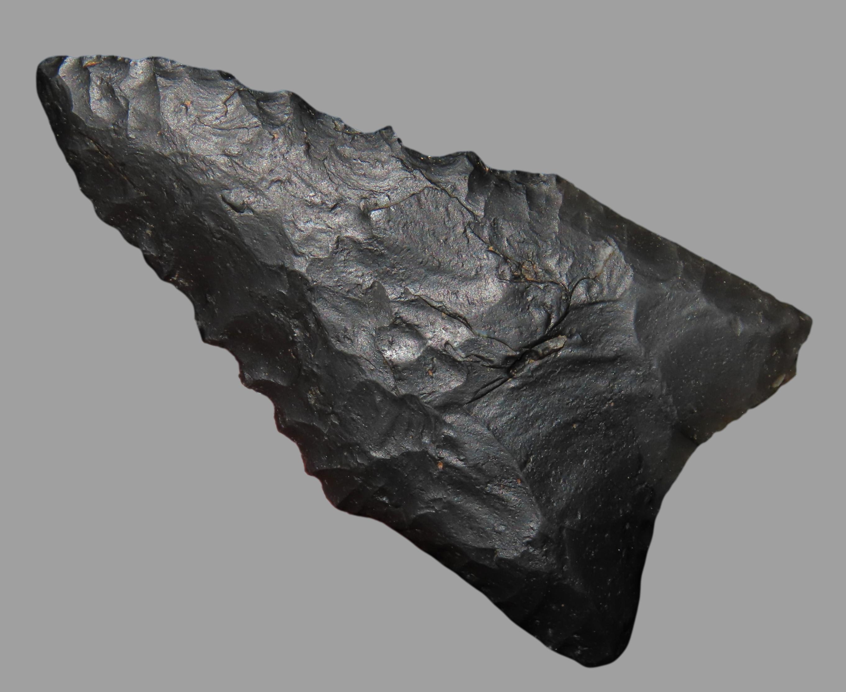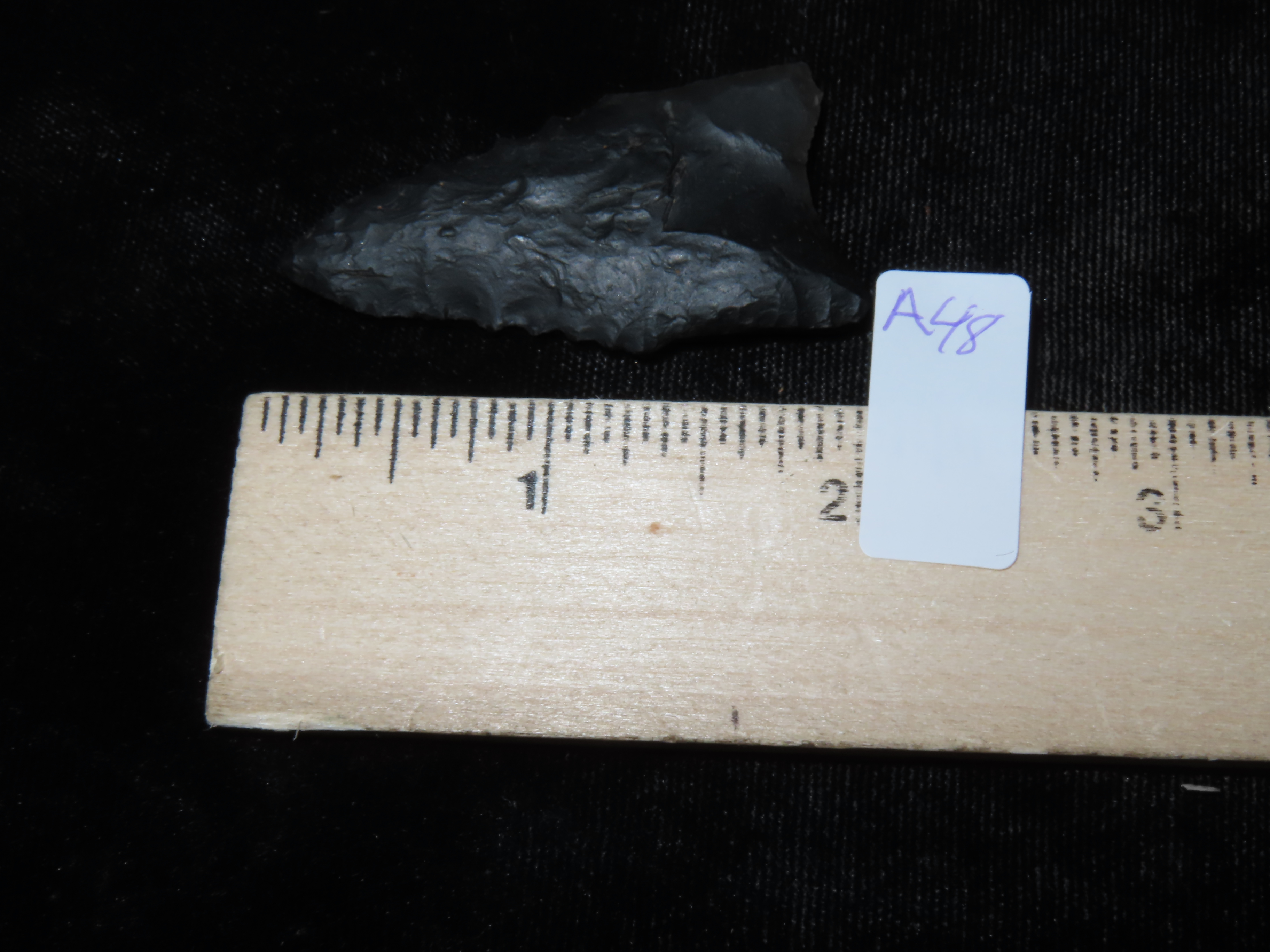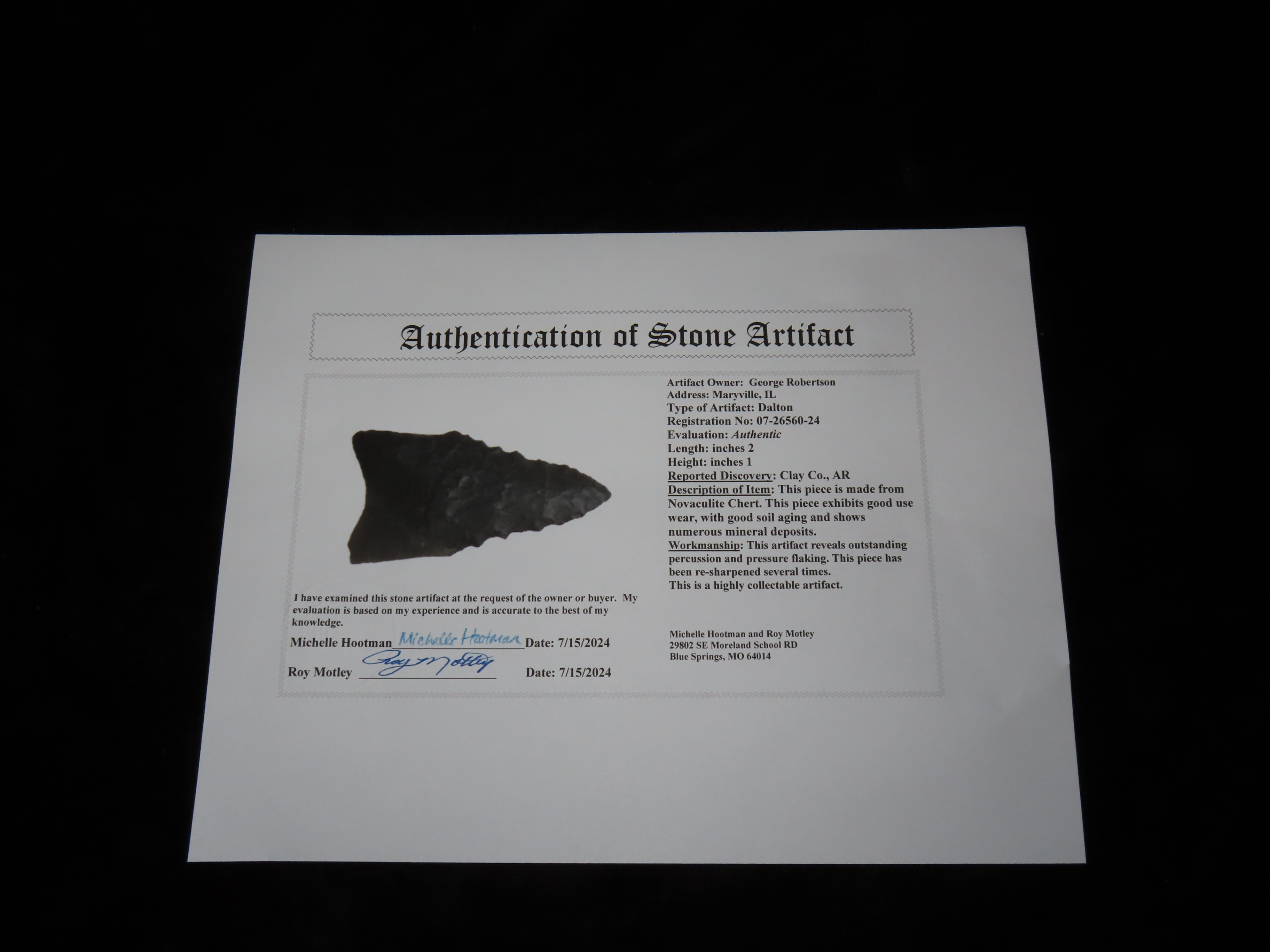 2″ Black Novaculite Dalton, Motley COA, found in Clay Co., Arkansas, Ex George Robertson Collection
